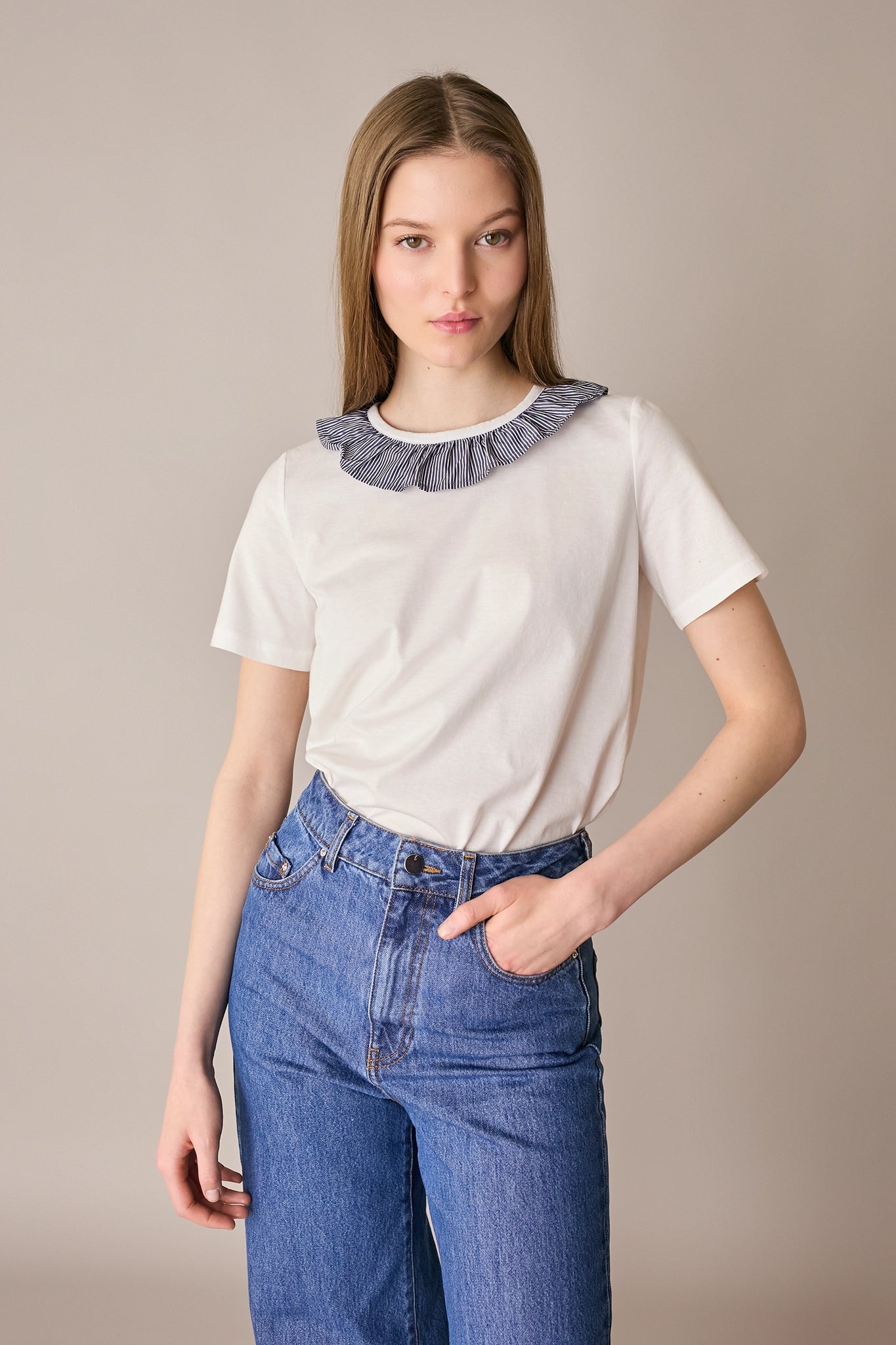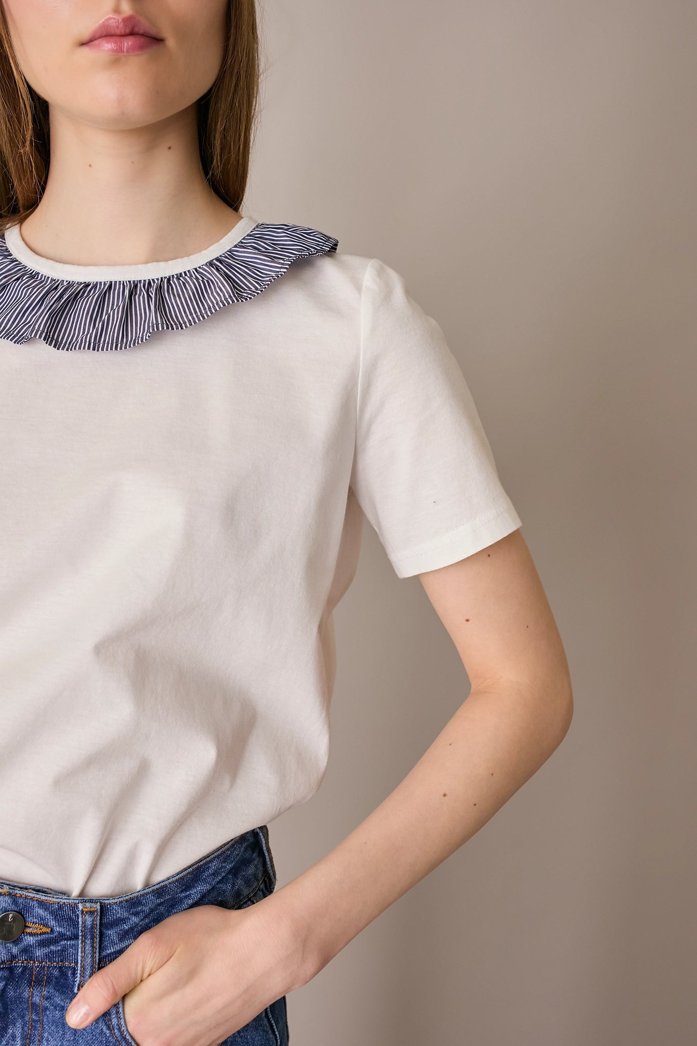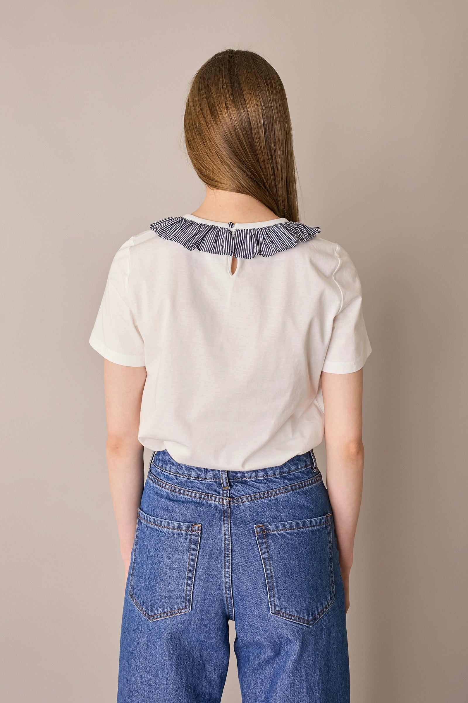 A classic cotton T-shirt – with our signature twist: a romantic ruffled collar we can’t wait to layer under cardigans and crewneck sweaters.