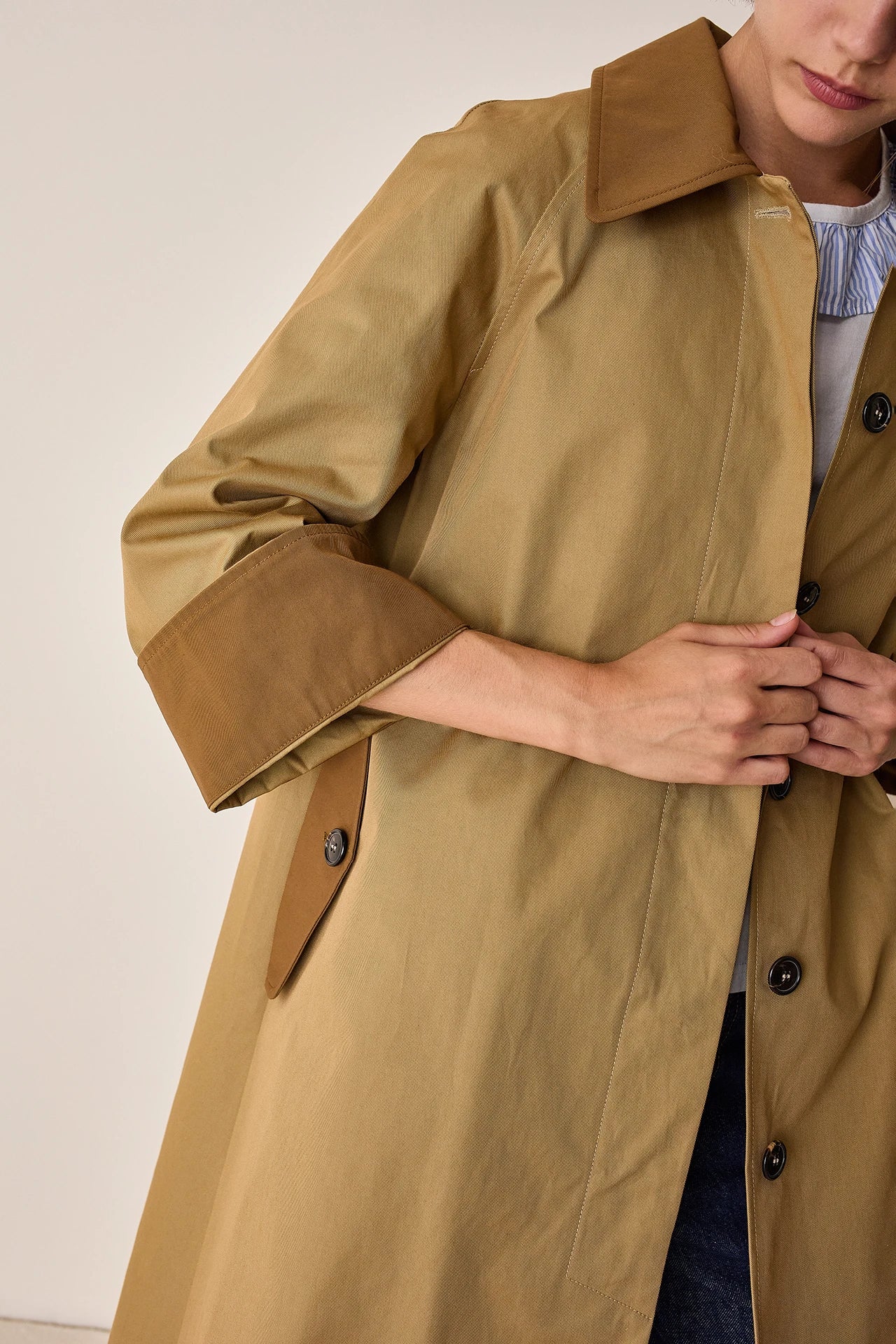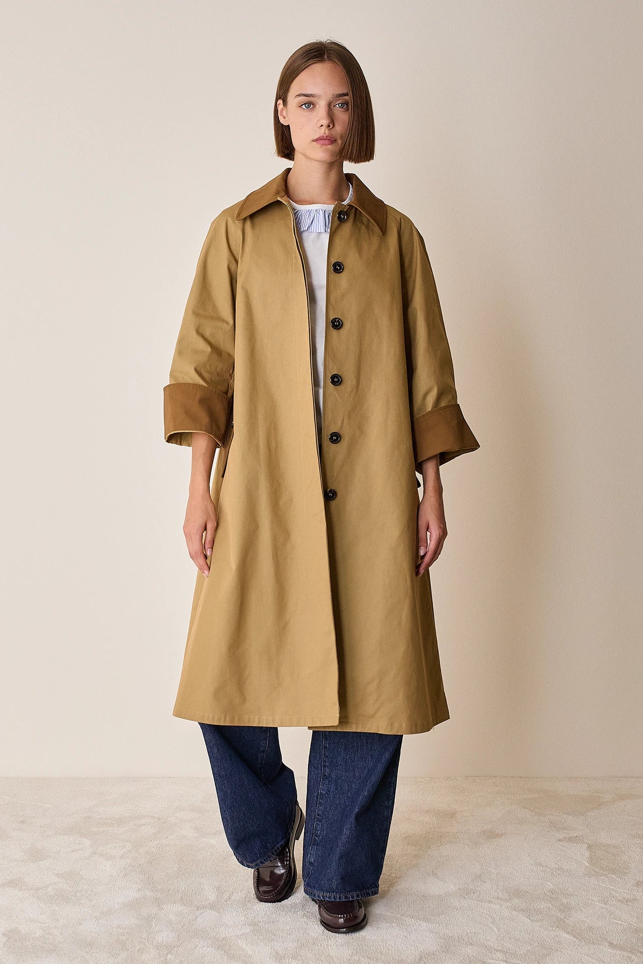 This duster coat features hidden buttons, contrasting details, and raglan sleeves—so you can wear it longer throughout the year (it works just as well over chunky knits as it does with a tee or shirt!). Made from a structured, durable cotton, it comes in a classic camel hue.