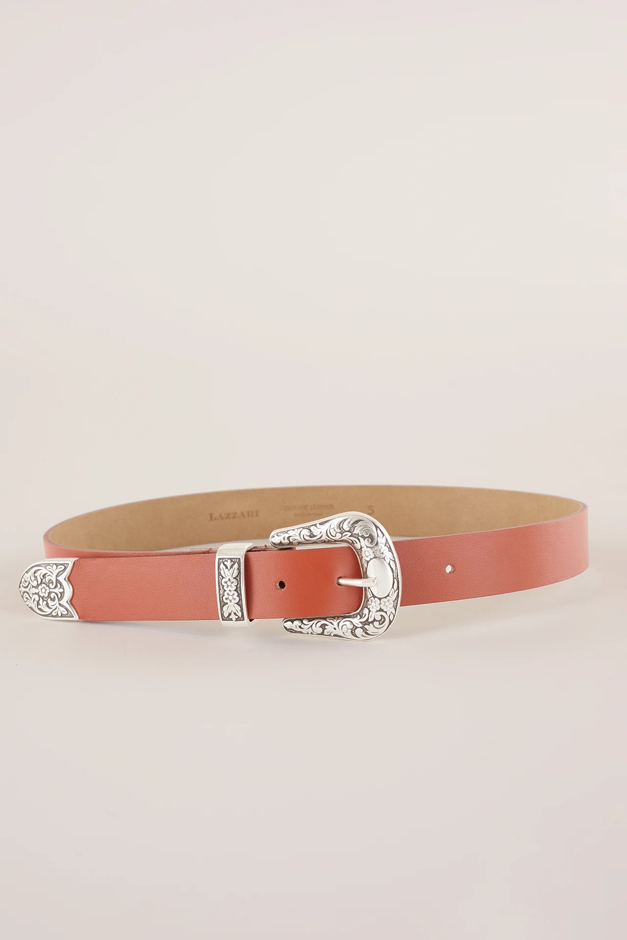 This wrangler-inspired leather belt features a decorated buckle and it's available in black or leather brown.