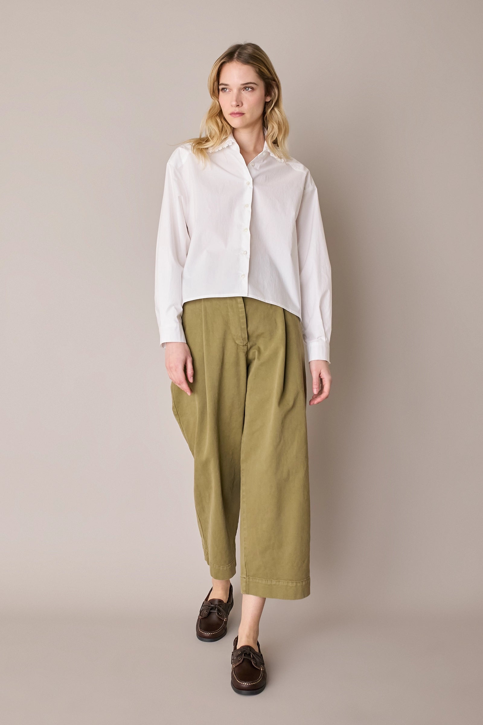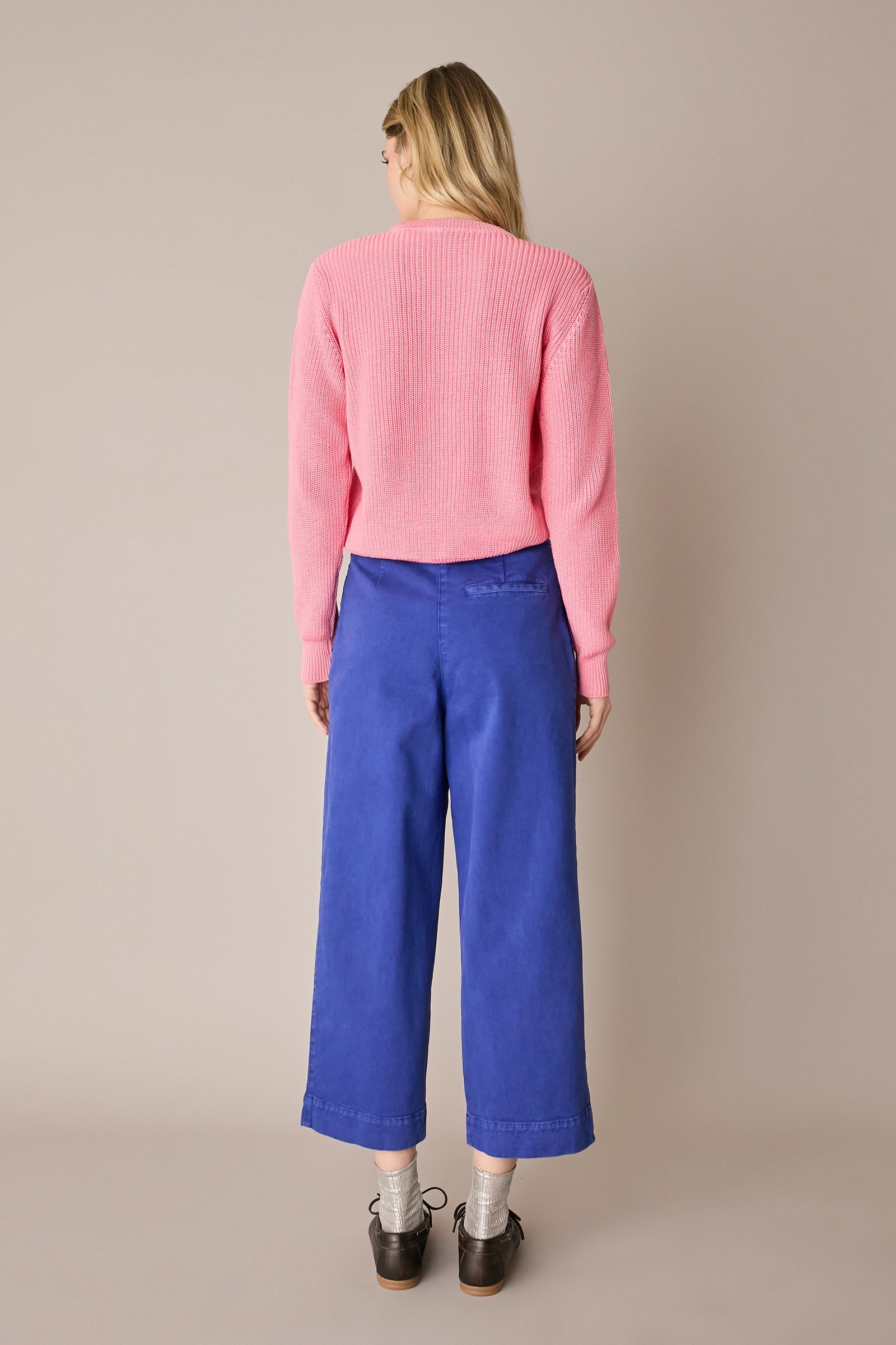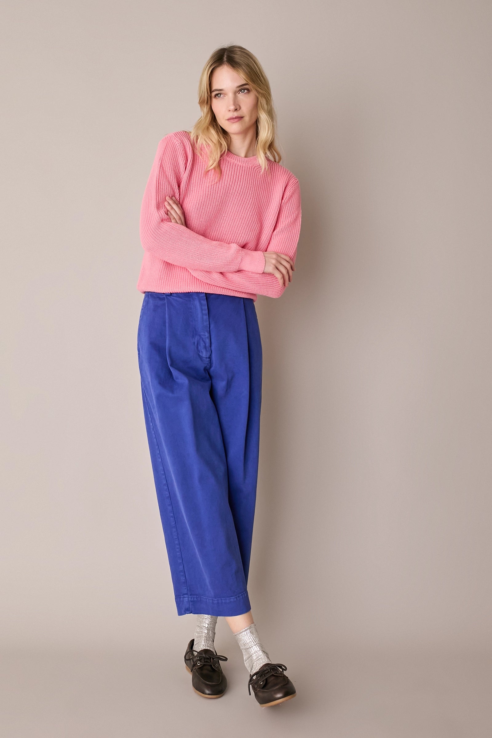 Casual, comfortable and versatile, these stretch cotton trousers are designed for everyday wear. The straight, wide leg ensures comfort and freedom of movement, while the front pleats add structure to the silhouette. Available in mud brown or bright blue.