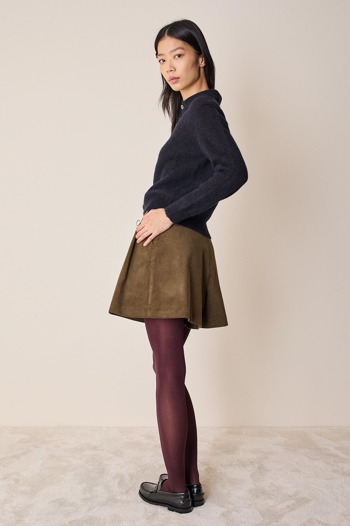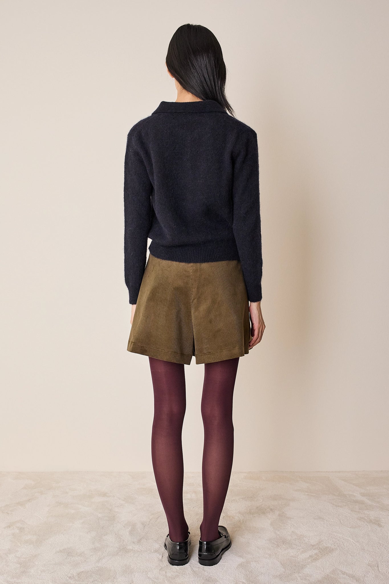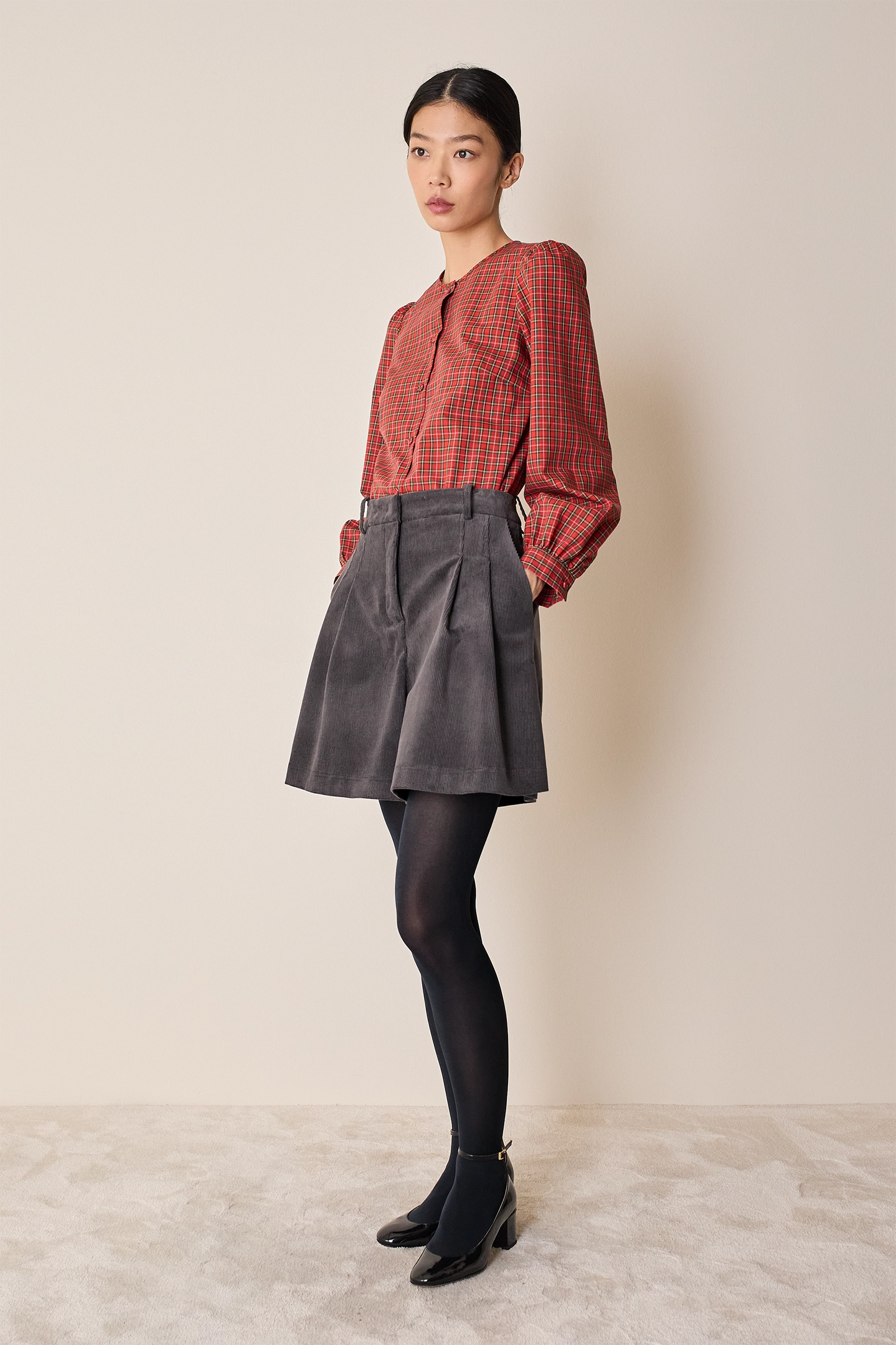 We chose it for these A-line shorts with front pleats – perfect to pair with shirts and boots, or with oversized wool sweaters and ballet flats. Available in grey or military green.