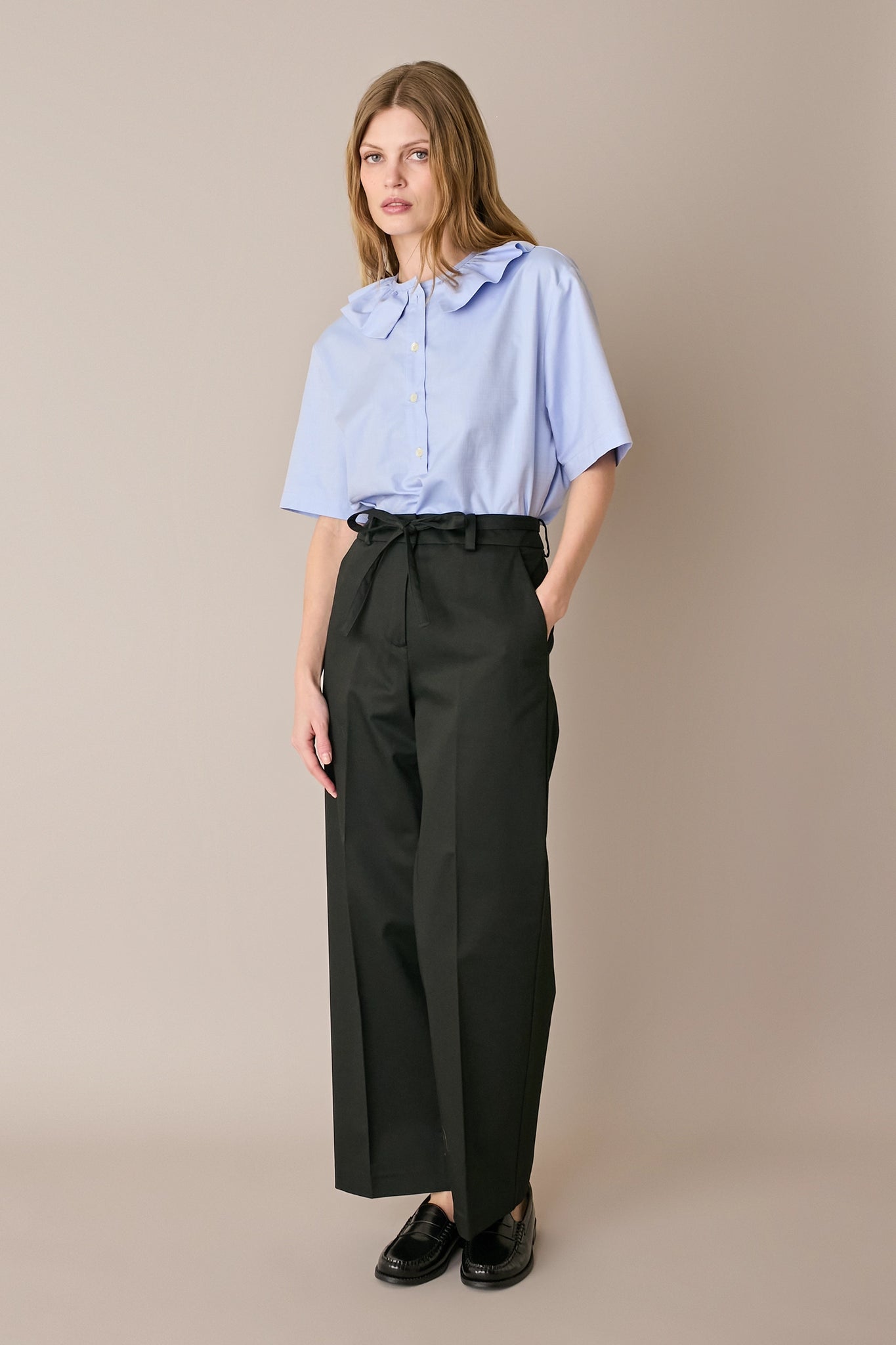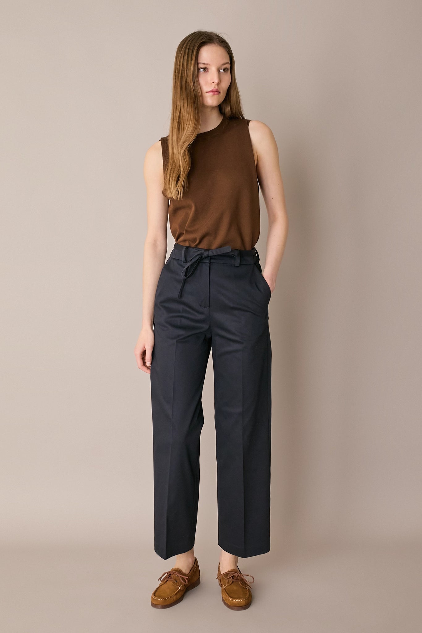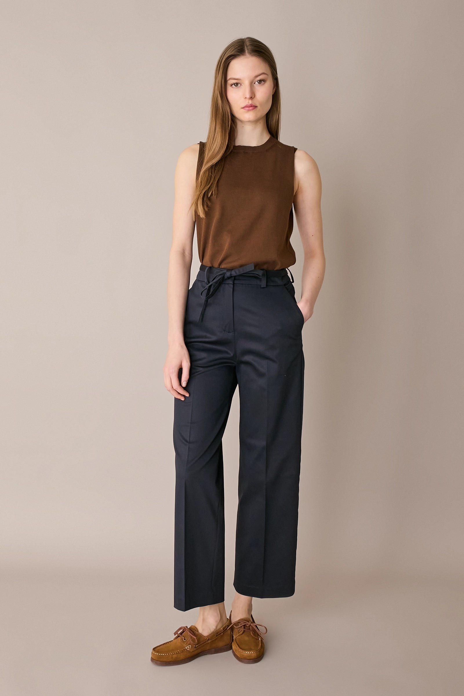 For these cotton gabardine trousers, we combined a tailored detail – front and back creases – with a more sporty element: a fabric belt. The result is a versatile pair of trousers, perfect for both the office and the weekend.
