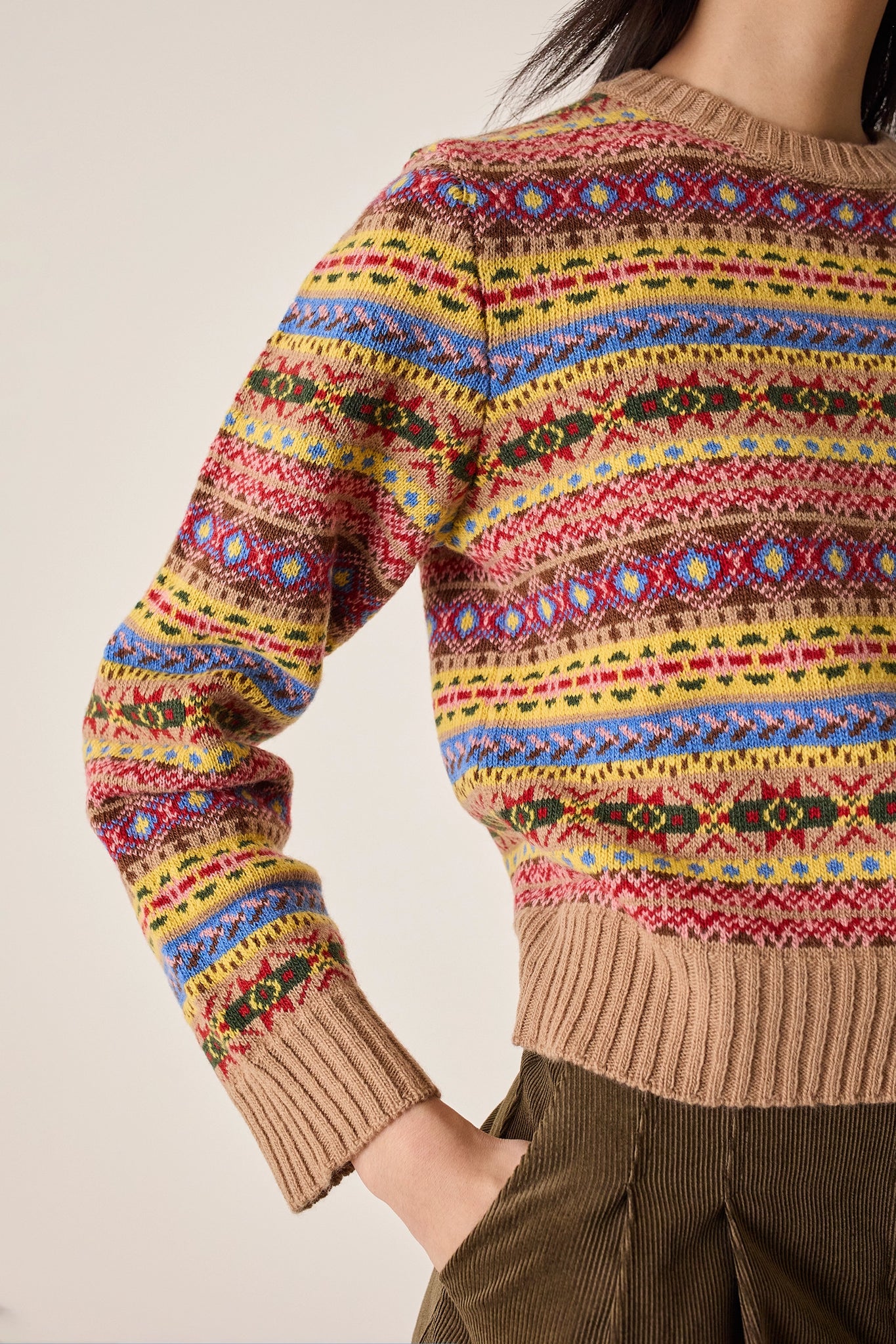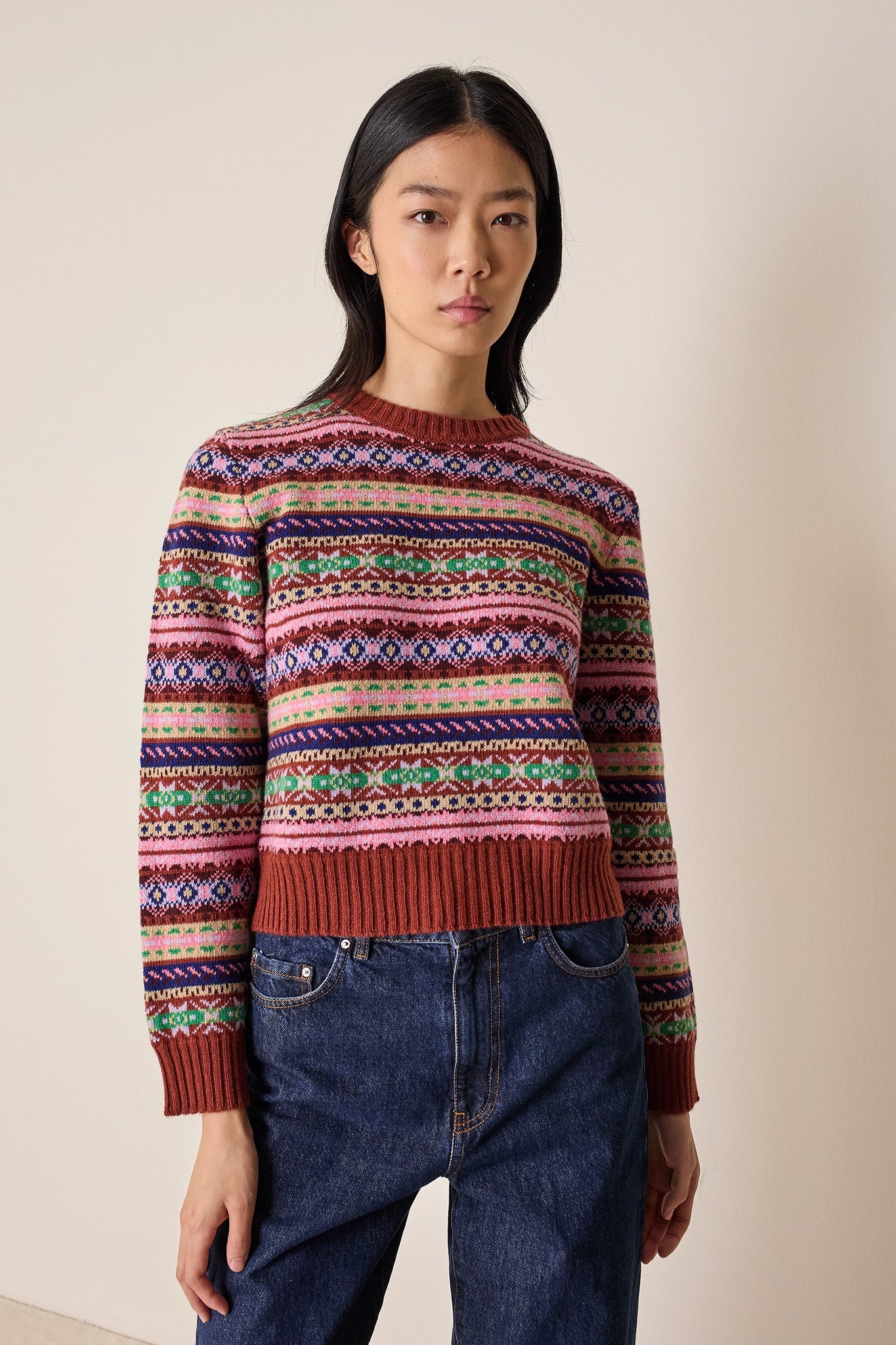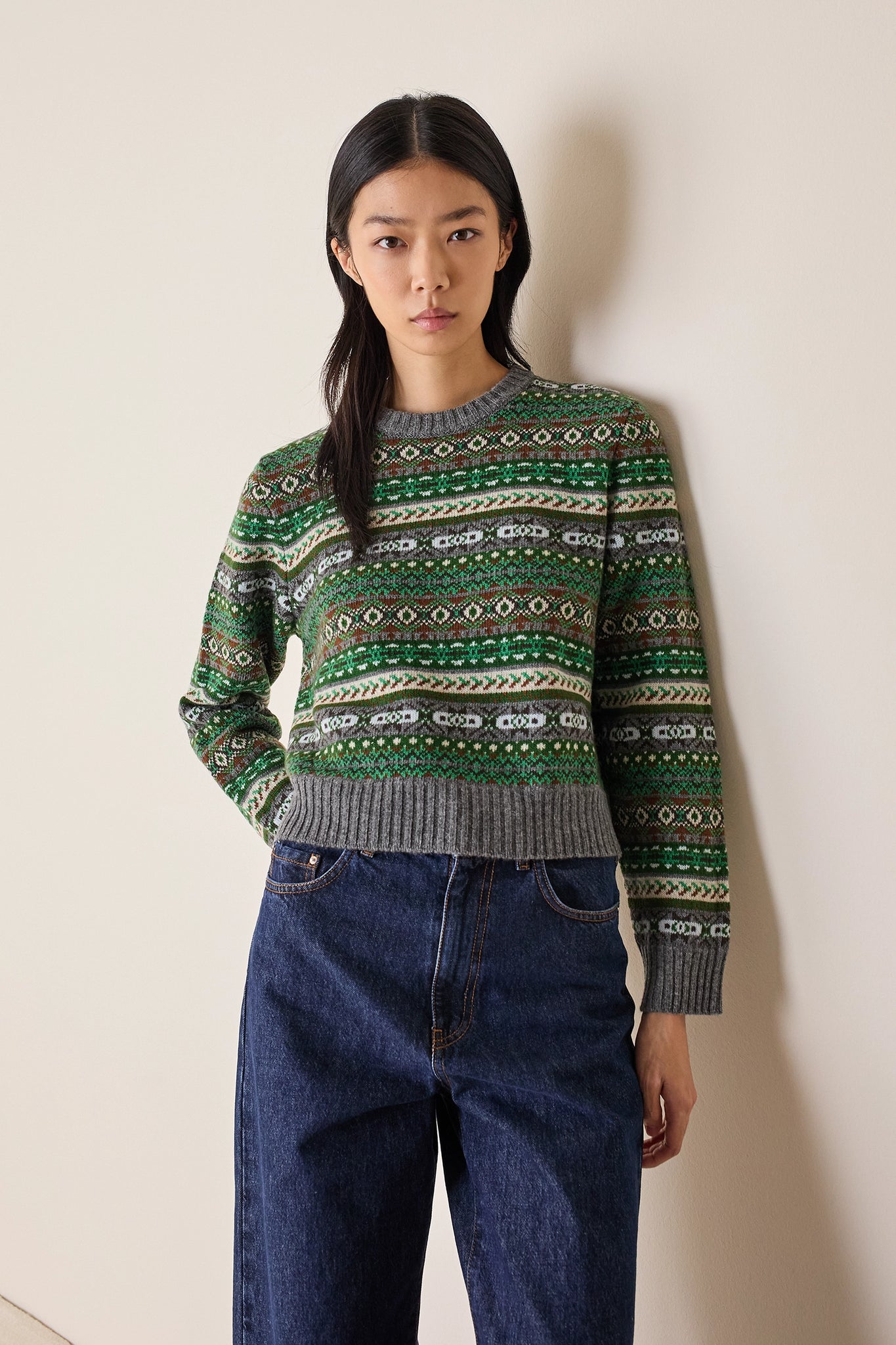 For this crew-neck sweater, we chose the jacquard technique and brightly colored contrasting yarns that highlight the geometric pattern. Available in three variations.