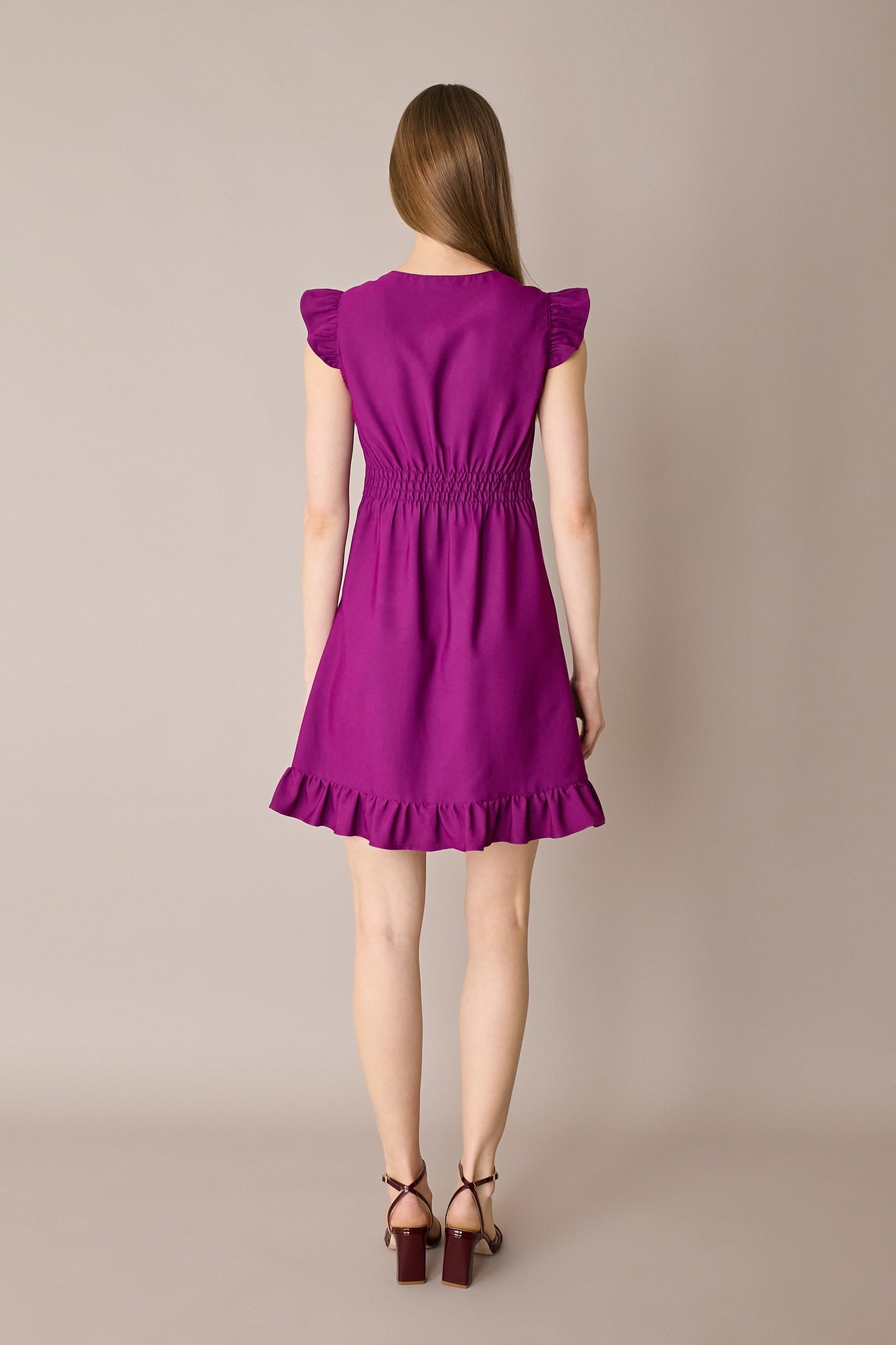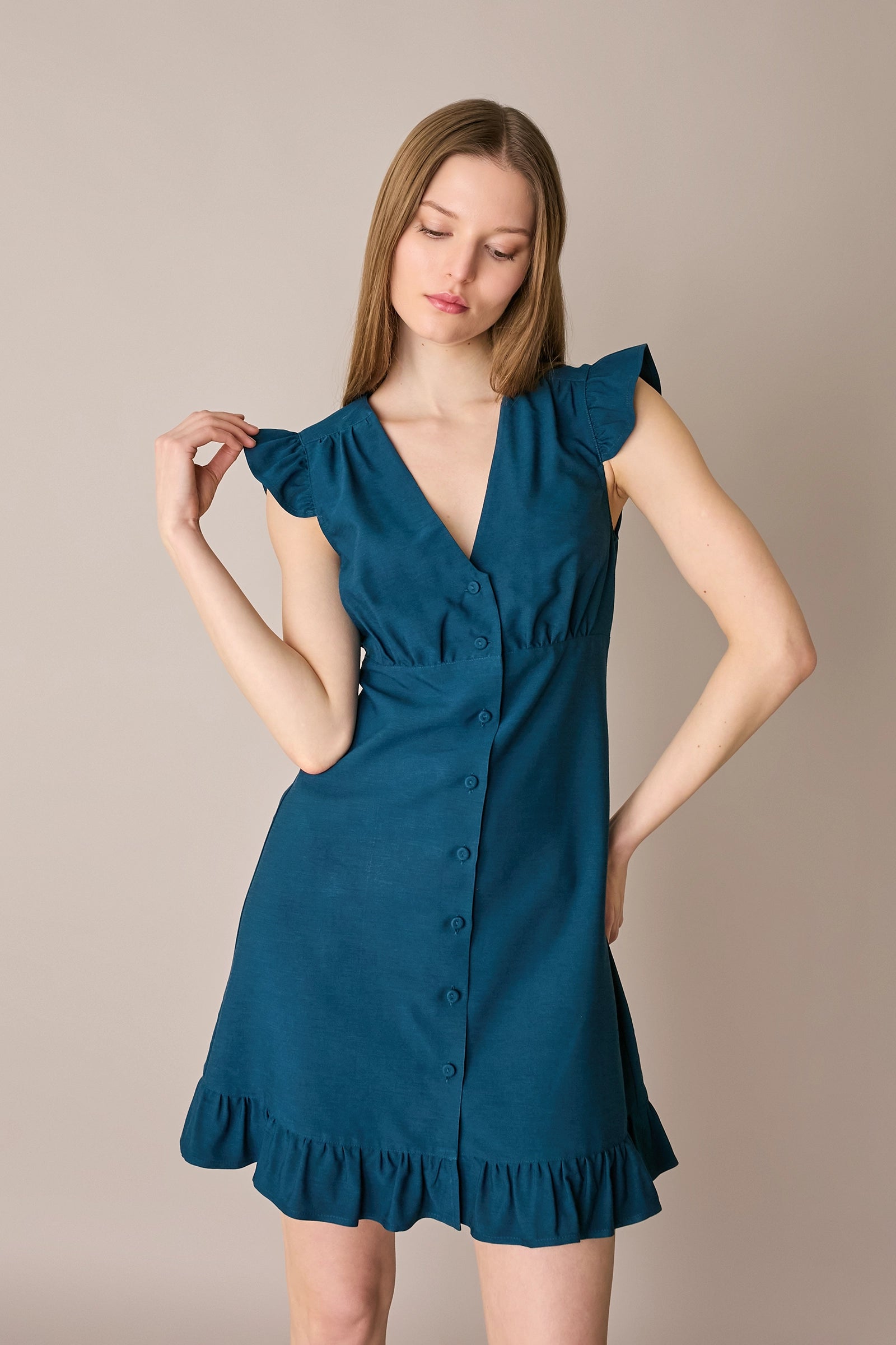 This shirt dress features soft ruffle details at the sleeves and hem, along with gentle back gathering that naturally defines the waist. Available in petrol blue or cyclamen.