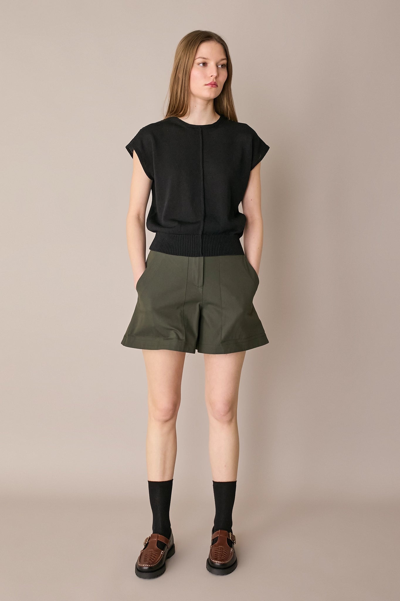 These stretch cotton shorts will carry you through to autumn. Style them with a T-shirt and ballet flats, or with a top and sandals, or even a shirt and boots for a more transitional look. Available in olive, blue, or green.