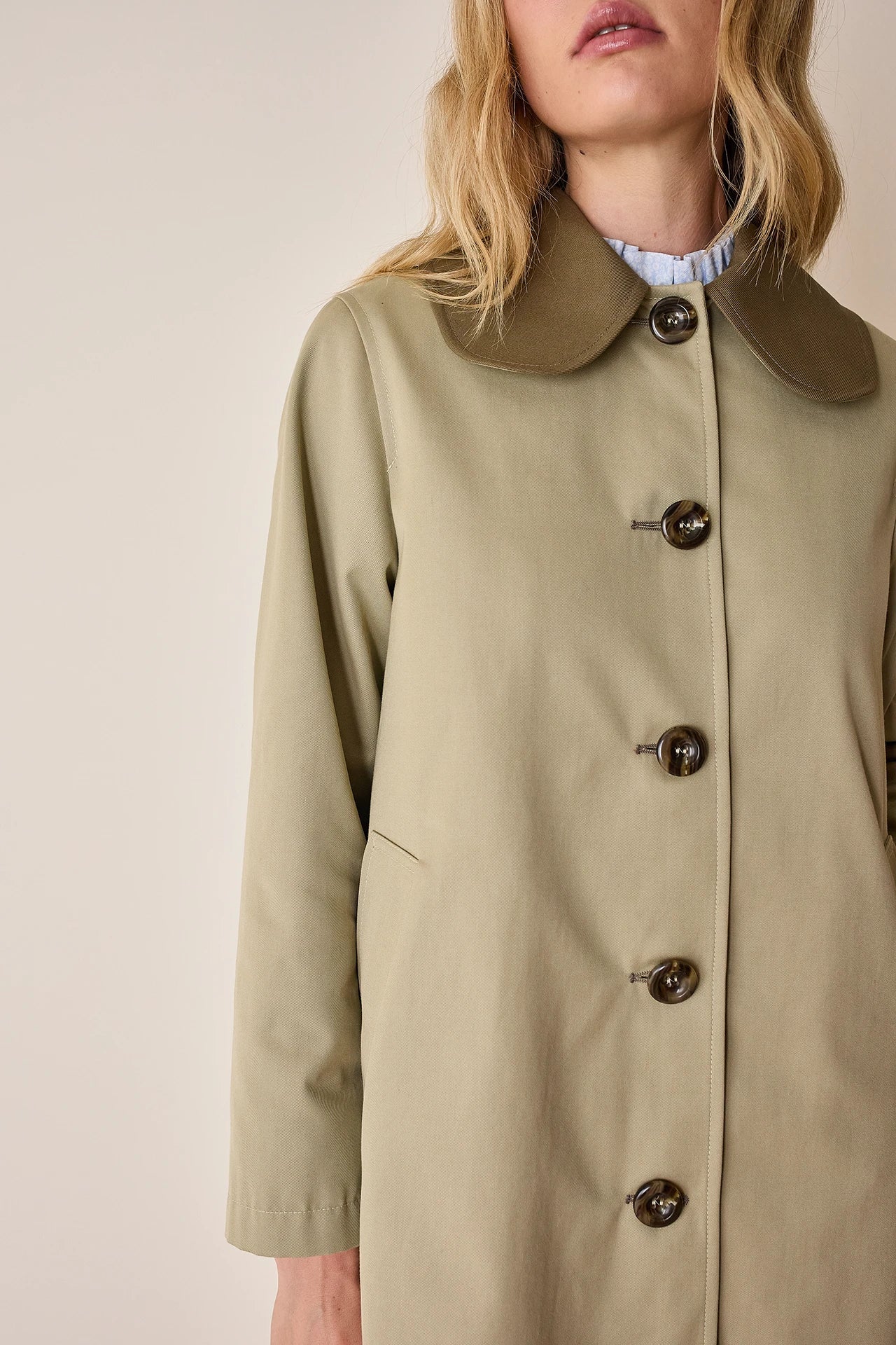 We’ve reimagined this timeless classic with unique details: a contrasting rounded collar, oversized tortoiseshell buttons, and a back box pleat for added volume and movement.