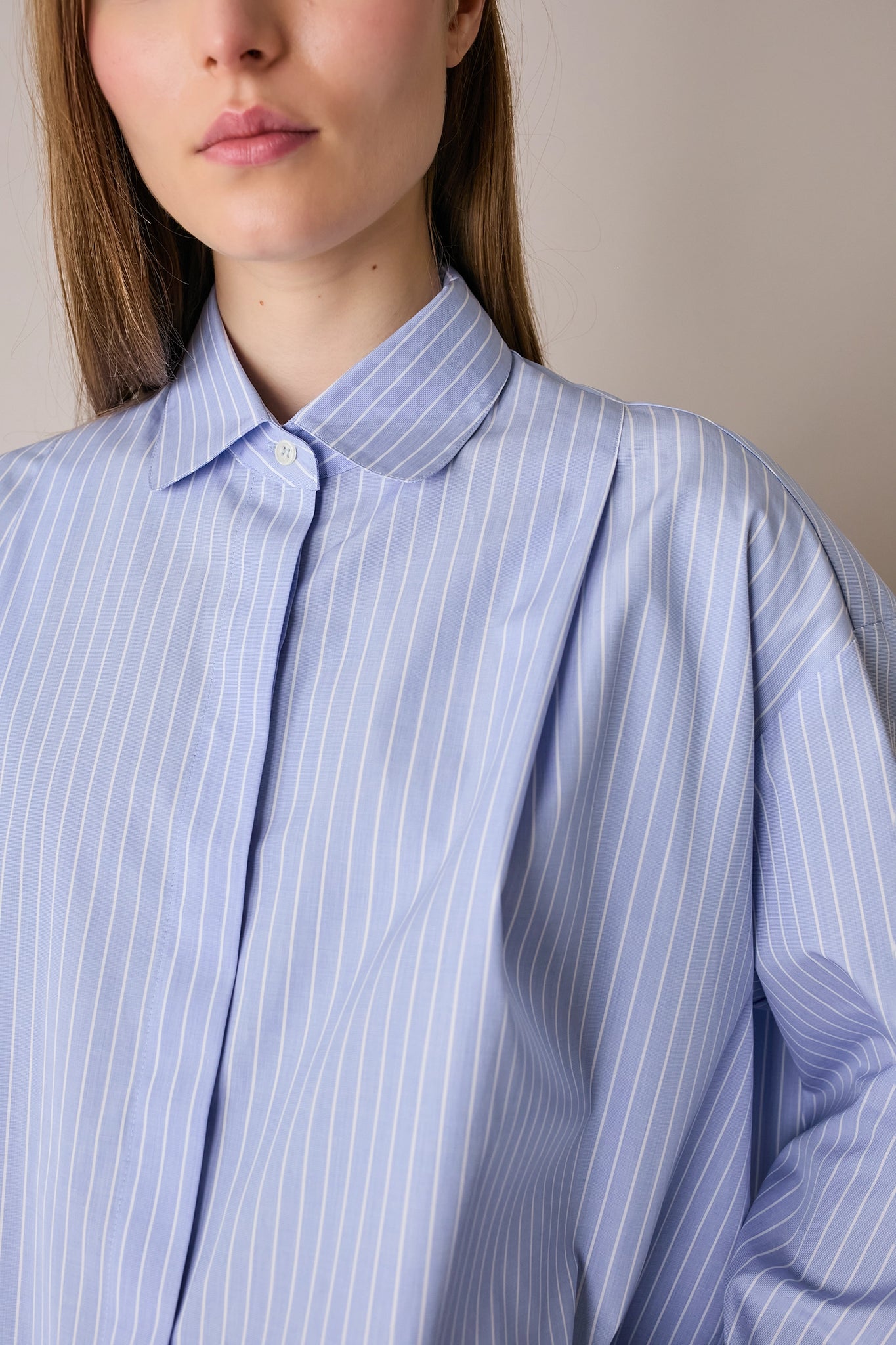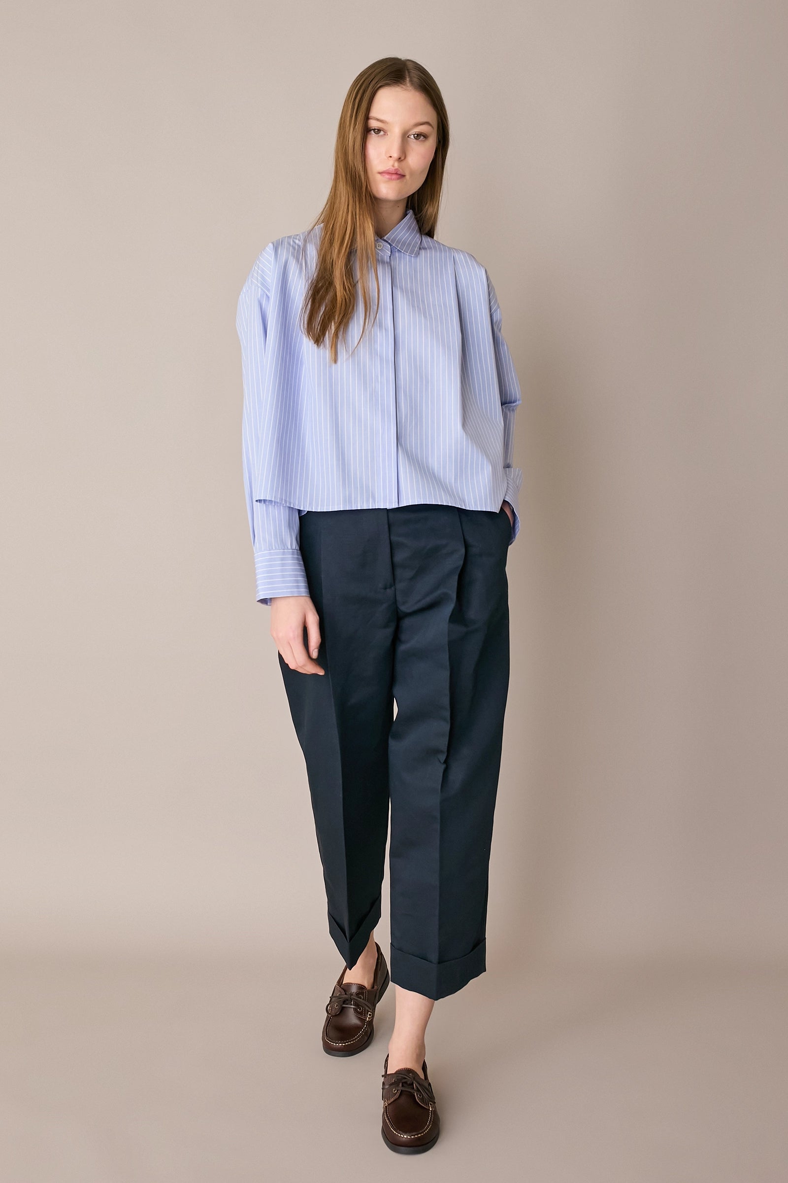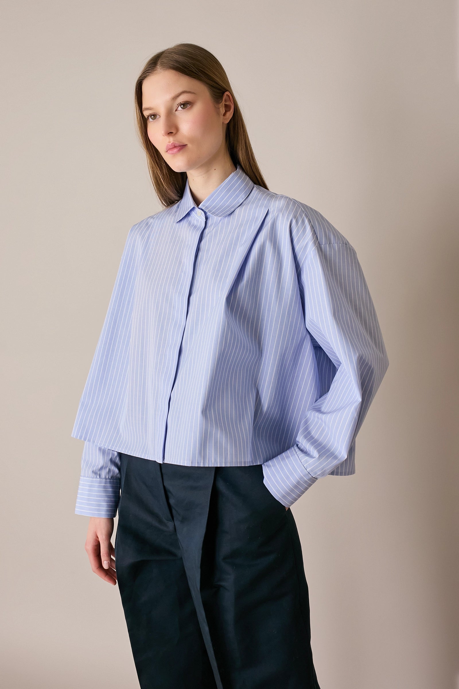 Questa camicia boxy è caratterizzata dal dettaglio delle pieghe frontali e posteriori che creano volume. Perfetta sia con gonne che con pantaloni, è disponibile in cotone Oxford azzurro oppure in cotone a righe bianche su fondo azzurro.
