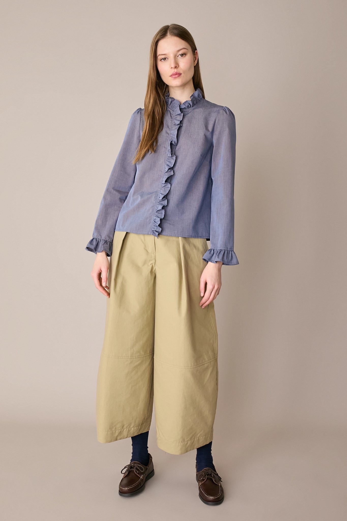 Ci piacciono i contrasti, come quello creato dall'incontro tra i dettagli romantici di questa camicia e il tessuto sportivo per eccellenza: il cotone. Adatta sia all’ufficio che a tutti i giorni, è disponibile in fantasia a righe sottili su fondo blu.
