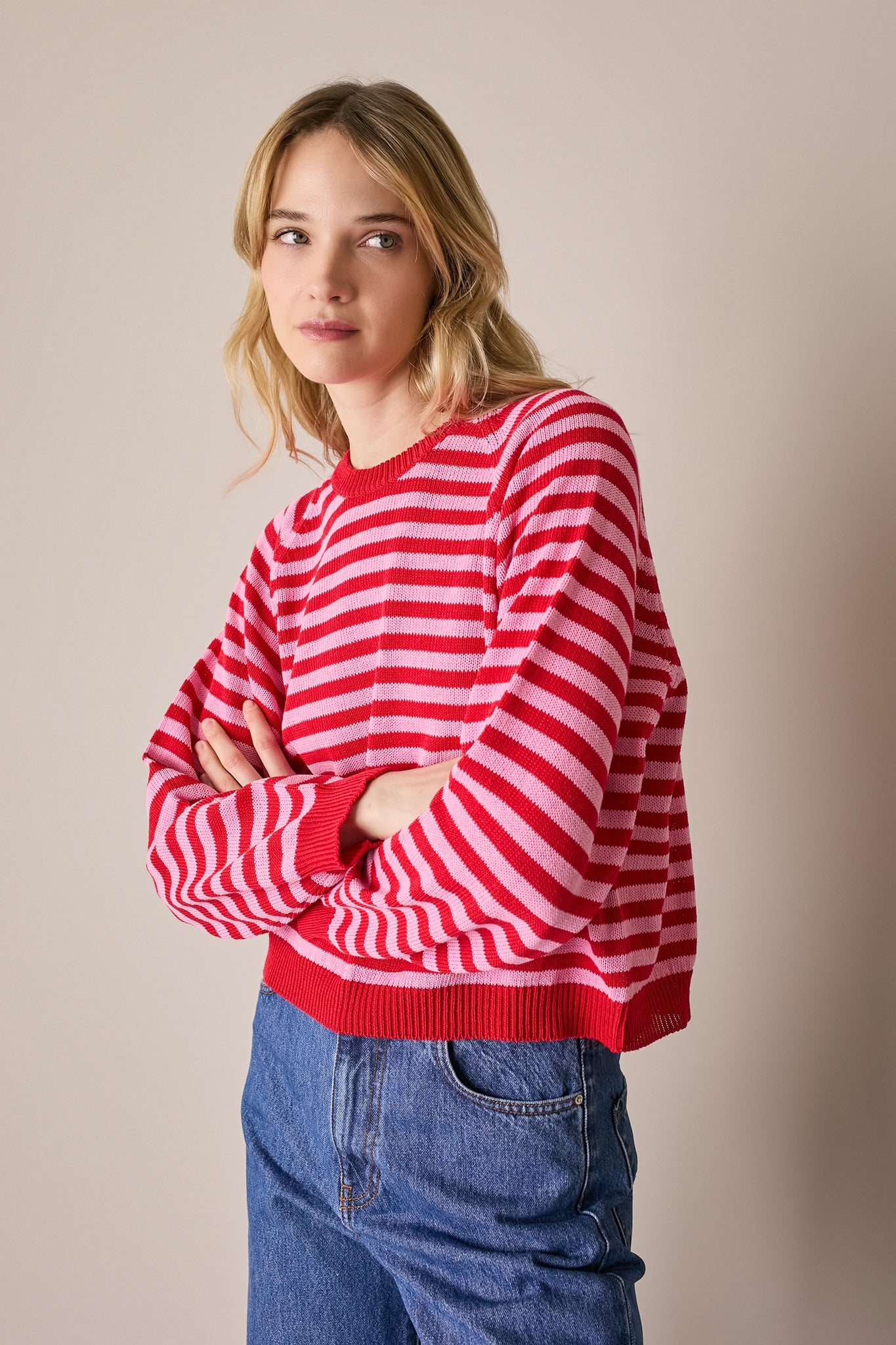 Per questo maglioncino girocollo abbiamo scelto un cotone morbido e leggero. Disponibile in due varianti a righe: rosso e rosa oppure bianco e blu.