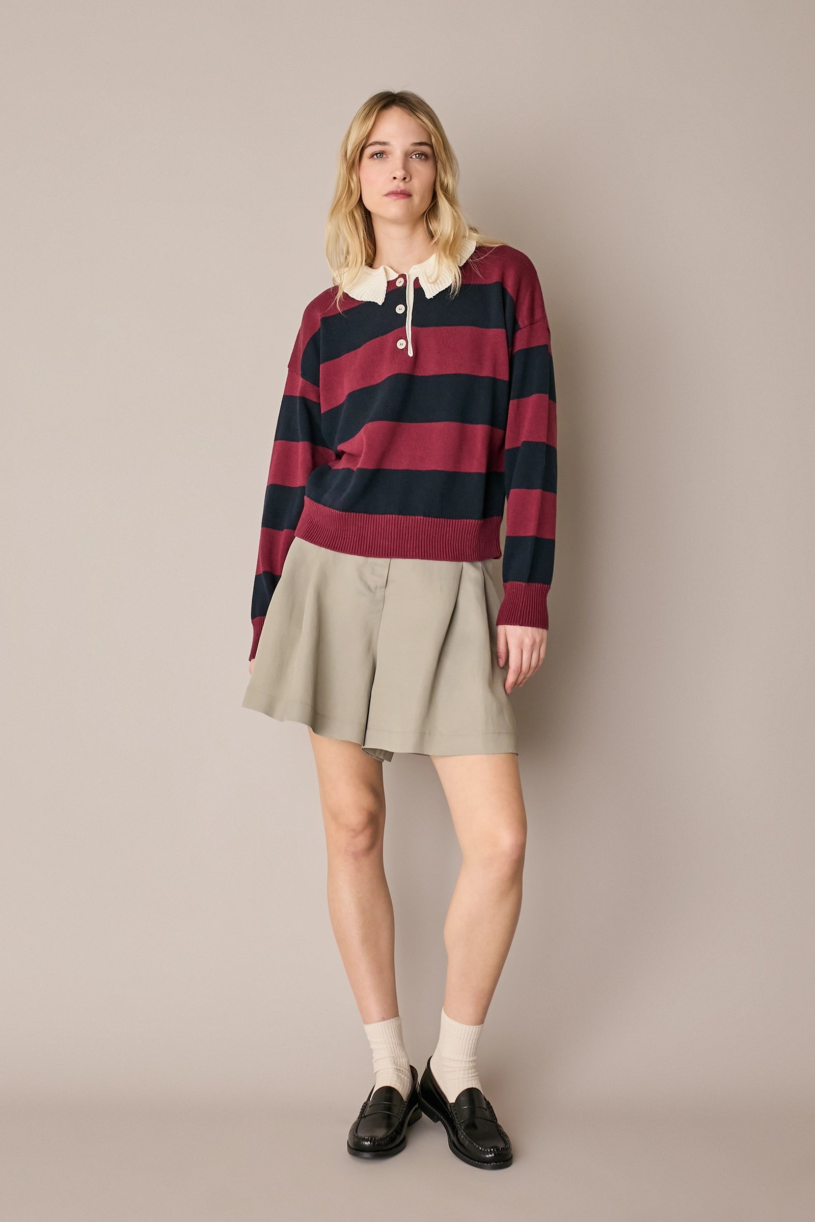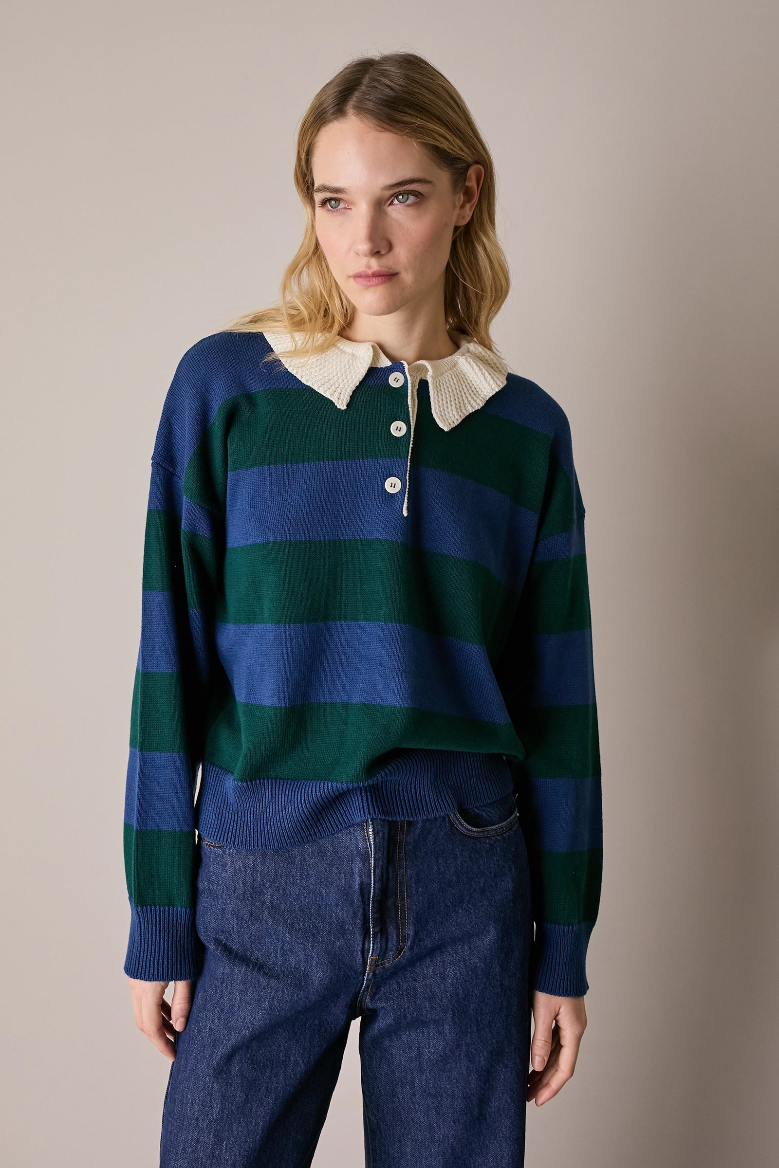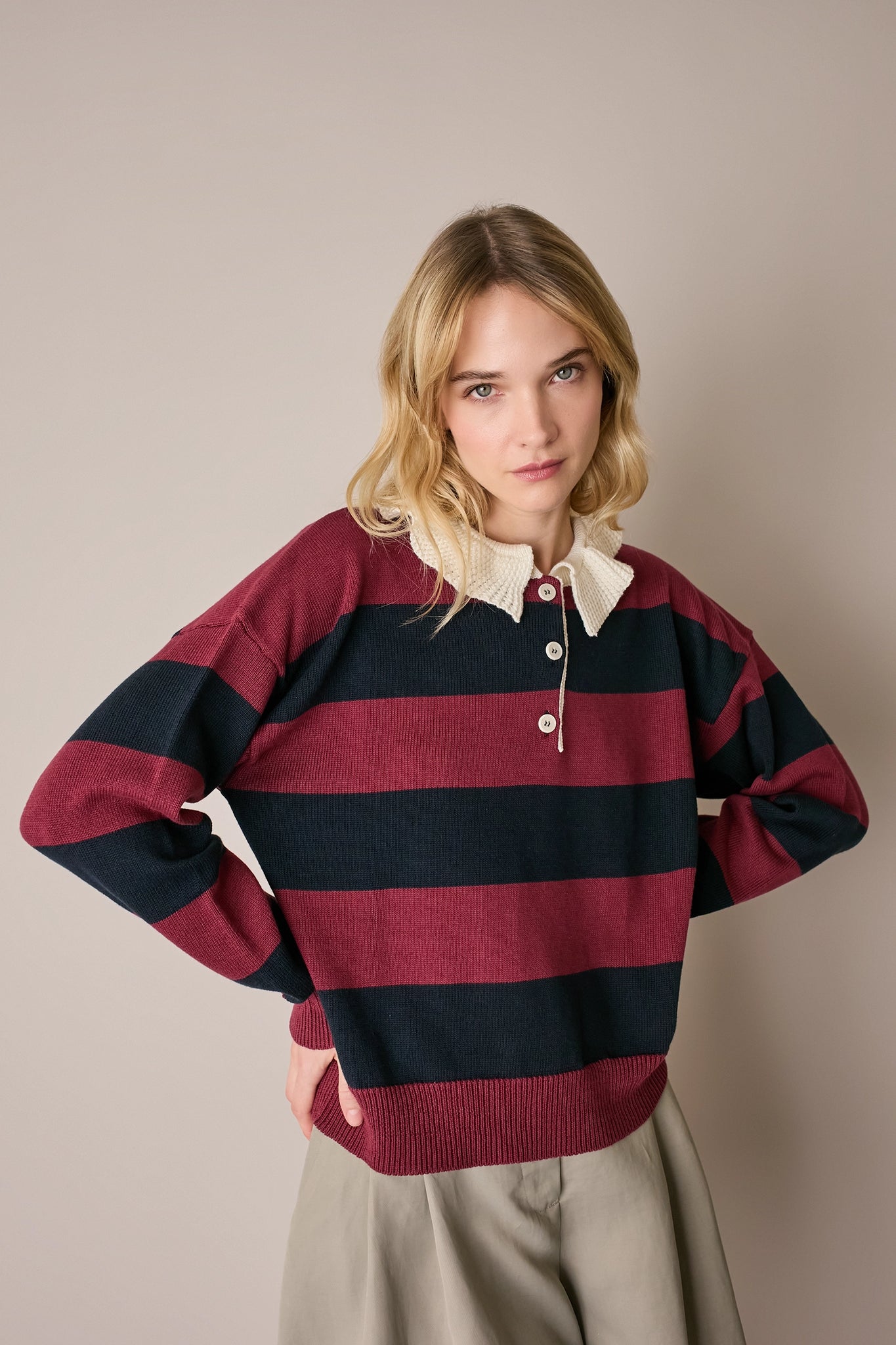 La polo da rugby, ma a modo nostro. Questa polo di ispirazione sportiva è caratterizzata da un colletto a contrasto, realizzato con una lavorazione speciale che crea un leggero effetto ondulato. Per realizzarla abbiamo scelto un blend di lana e cotone, perfetto per i periodi di transizione. Disponibile in due varianti a righe: blu e bordeaux oppure verde e blu.