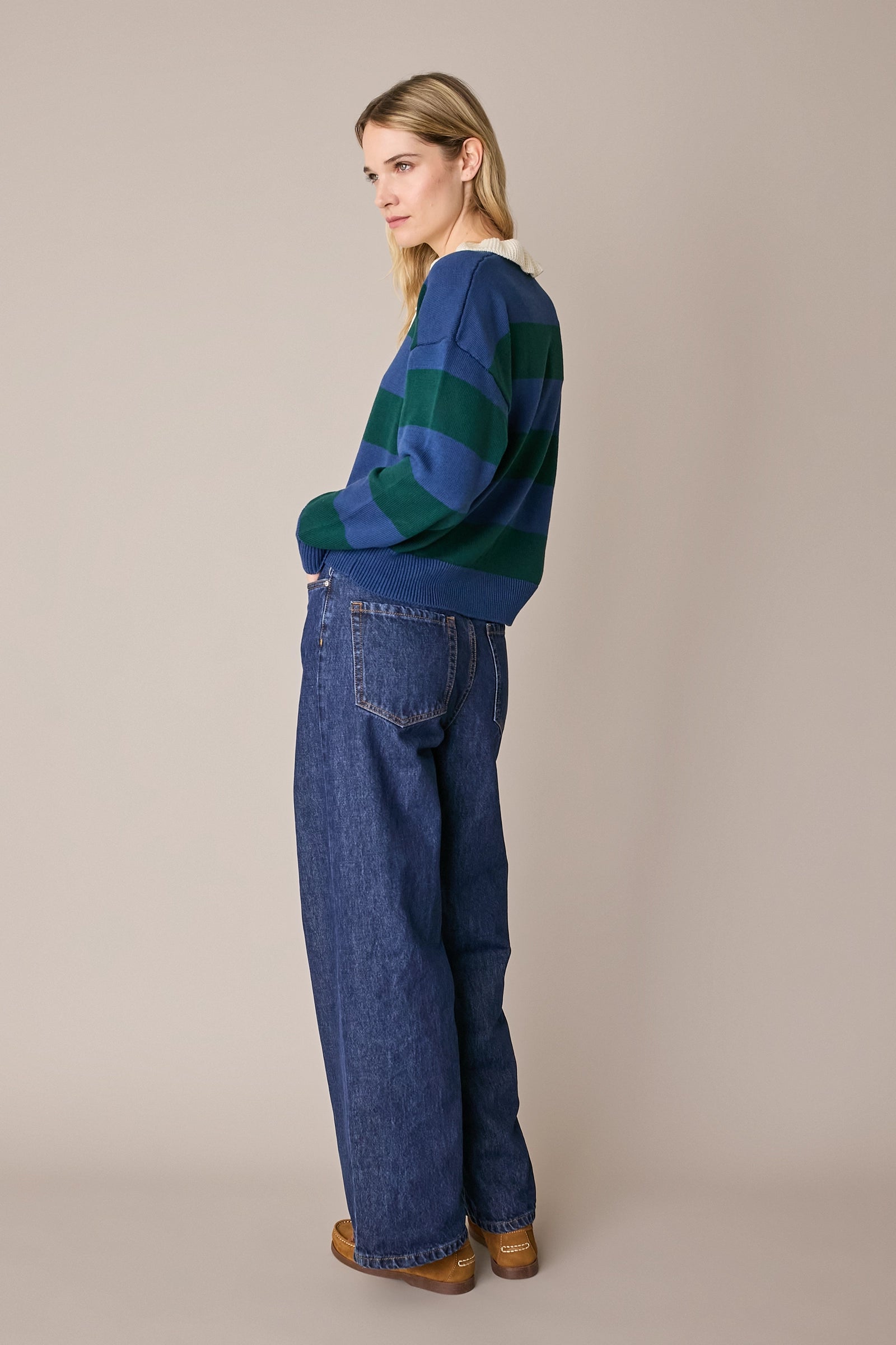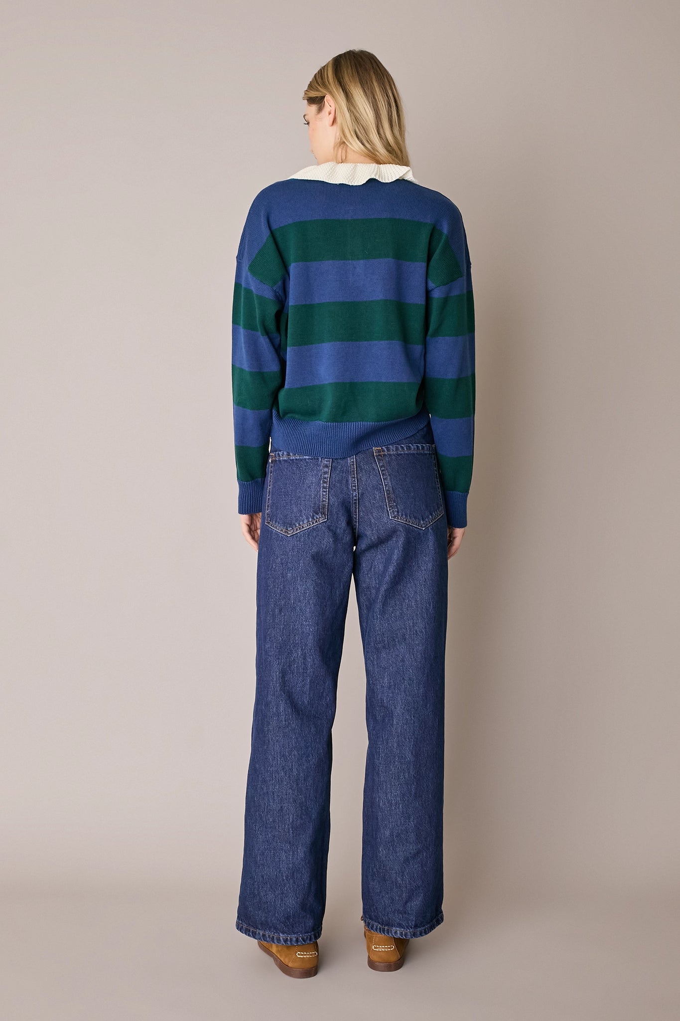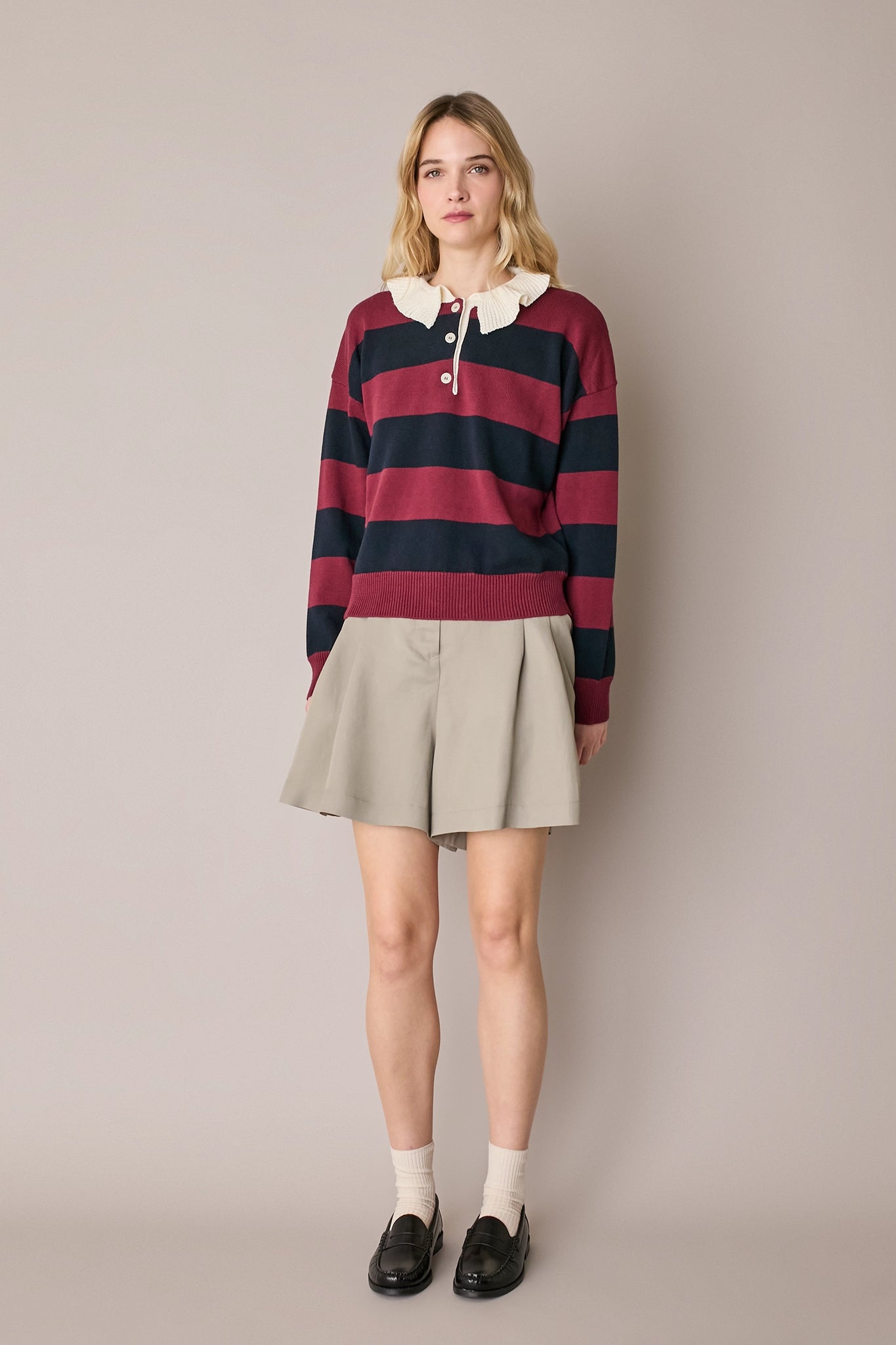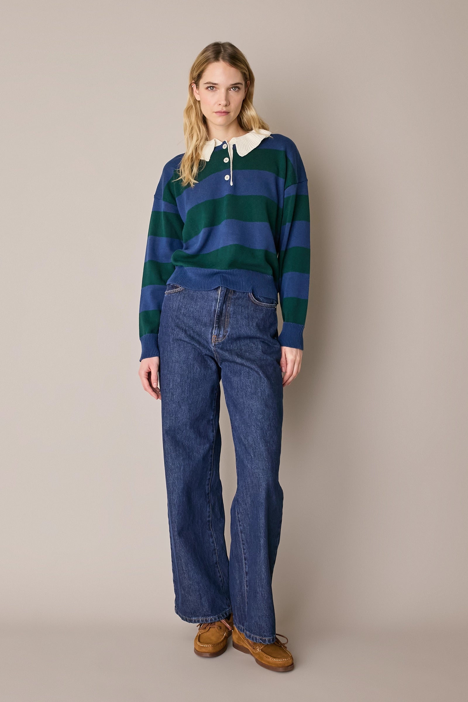 La polo da rugby, ma a modo nostro. Questa polo di ispirazione sportiva è caratterizzata da un colletto a contrasto, realizzato con una lavorazione speciale che crea un leggero effetto ondulato. Per realizzarla abbiamo scelto un blend di lana e cotone, perfetto per i periodi di transizione. Disponibile in due varianti a righe: blu e bordeaux oppure verde e blu.