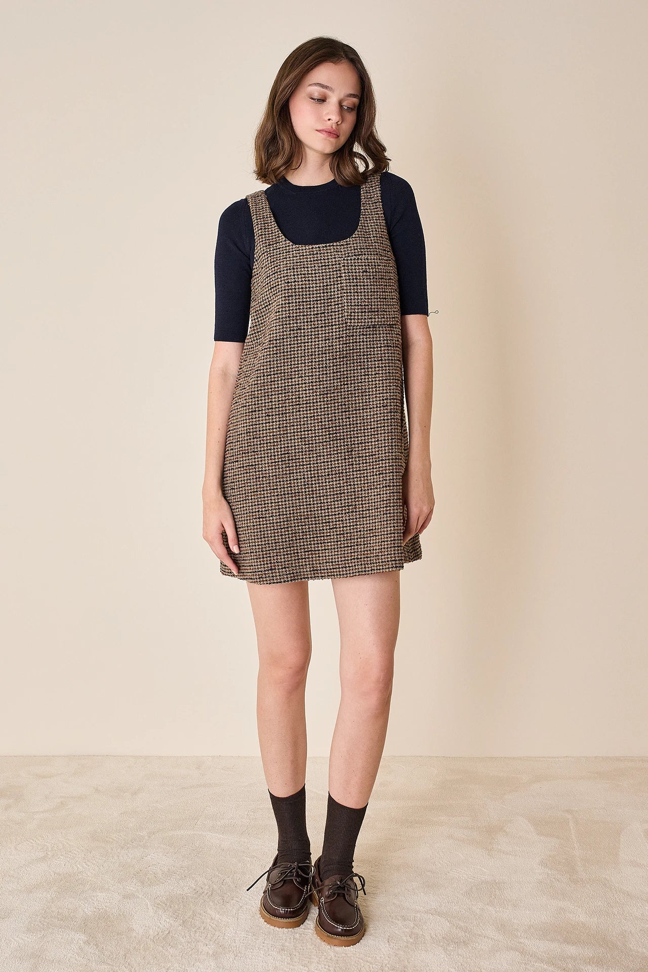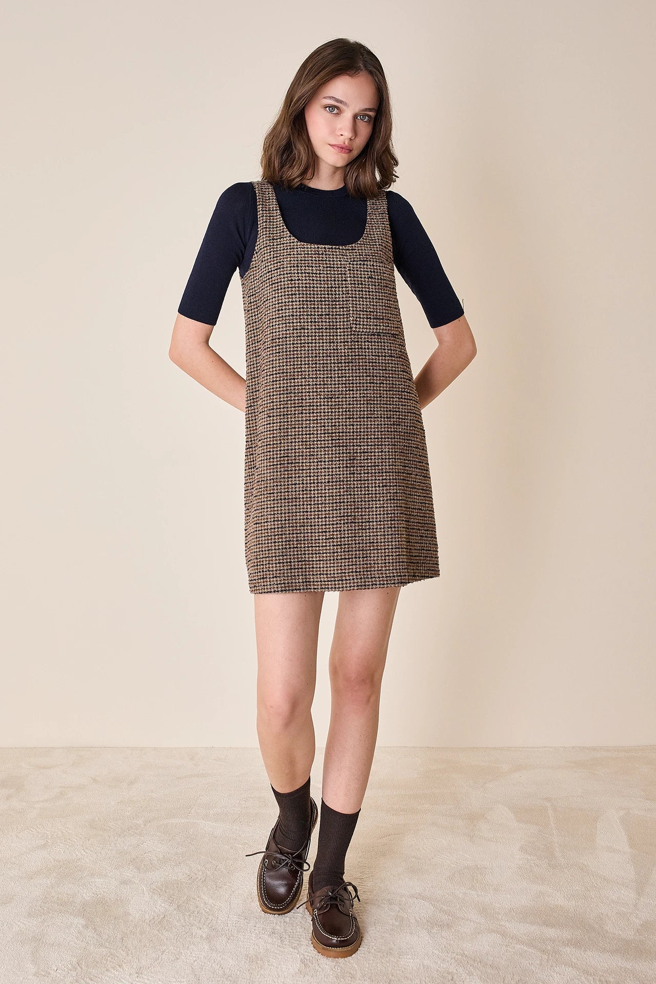 Composizione tessuto pied-de-poule marrone: 38% lana vergine, 24% cotone, 20% poliestere, 10% poliammide, 8% acrilico.