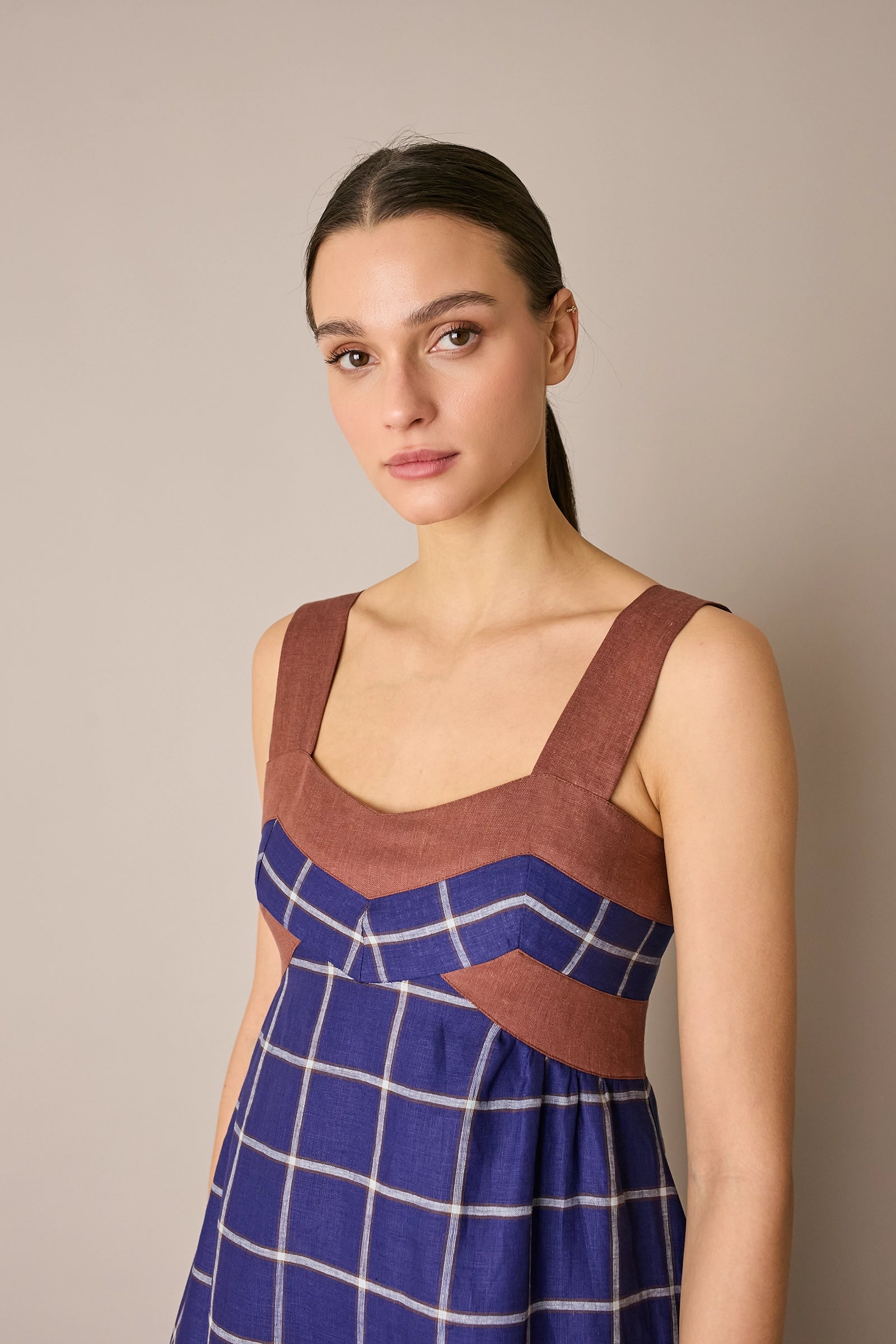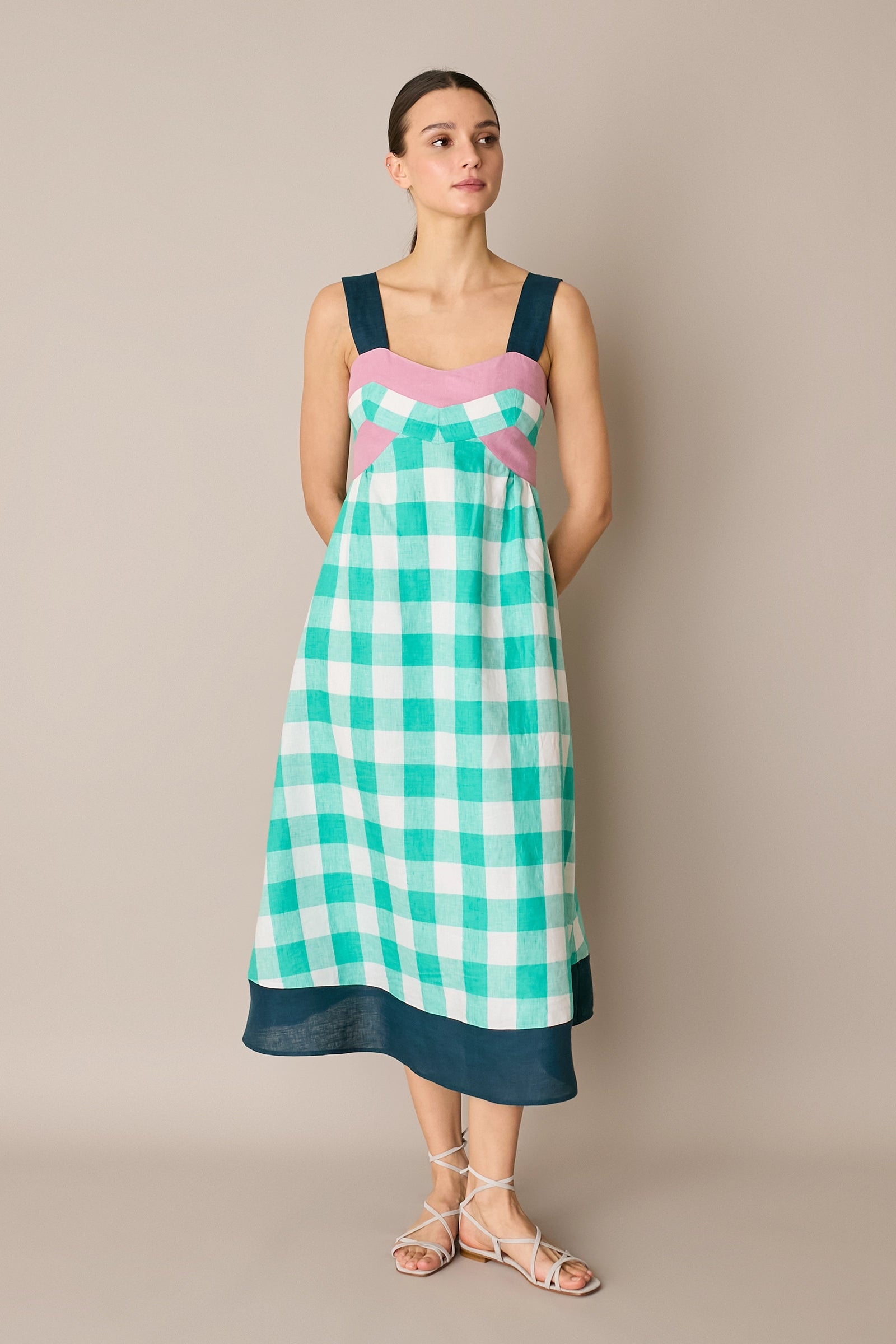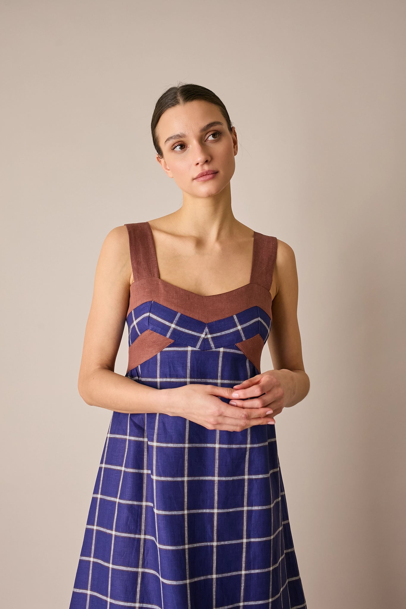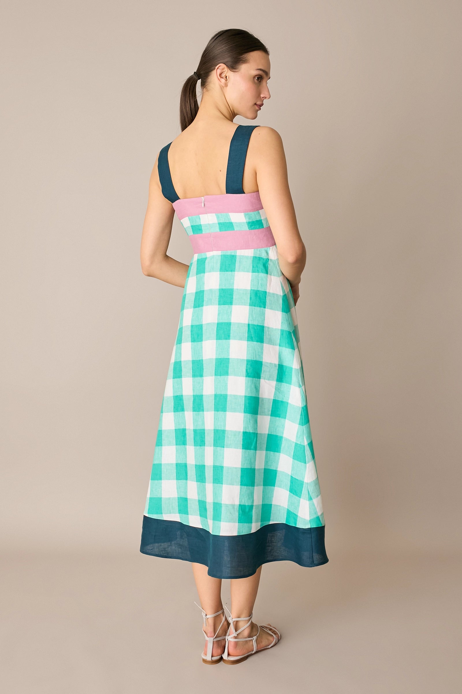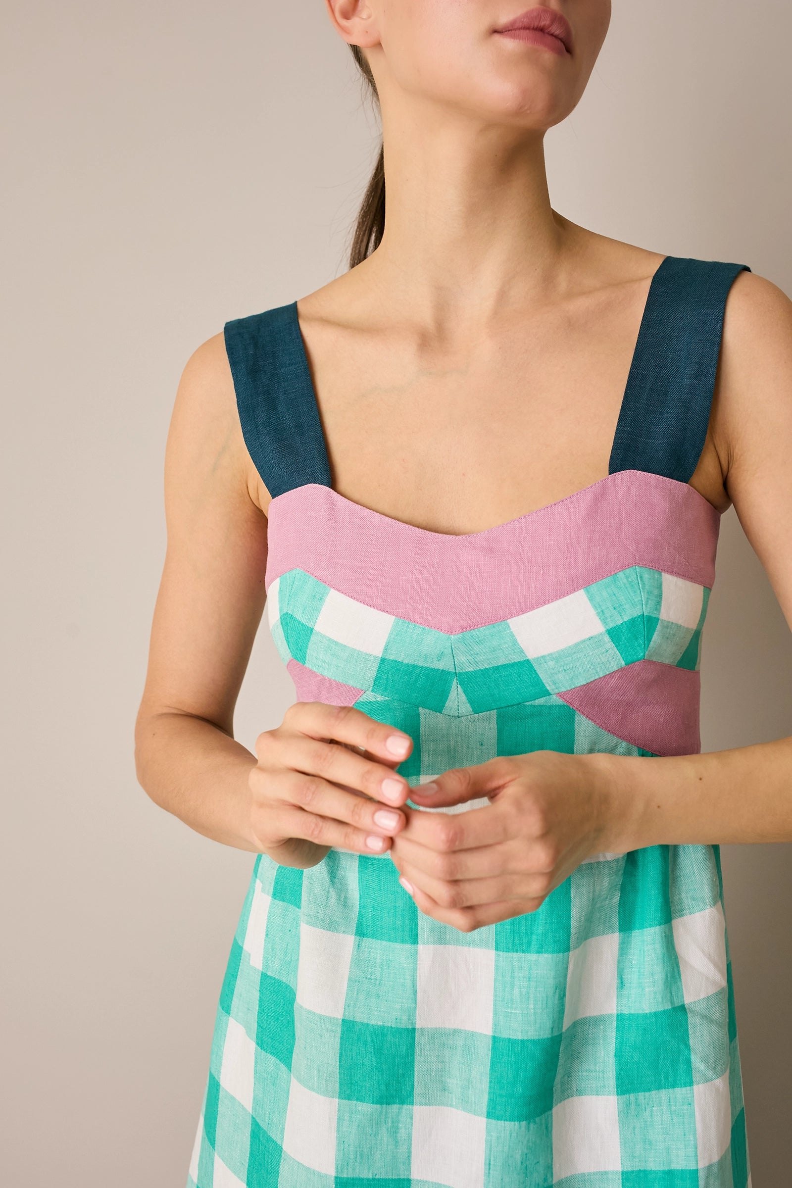 Per questo abito abbiamo scelto un lino fresco e leggero. Caratterizzato da una costruzione particolare, enfatizzata dall’uso di colori diversi, è disponibile in tre varianti perfette per l’estate.