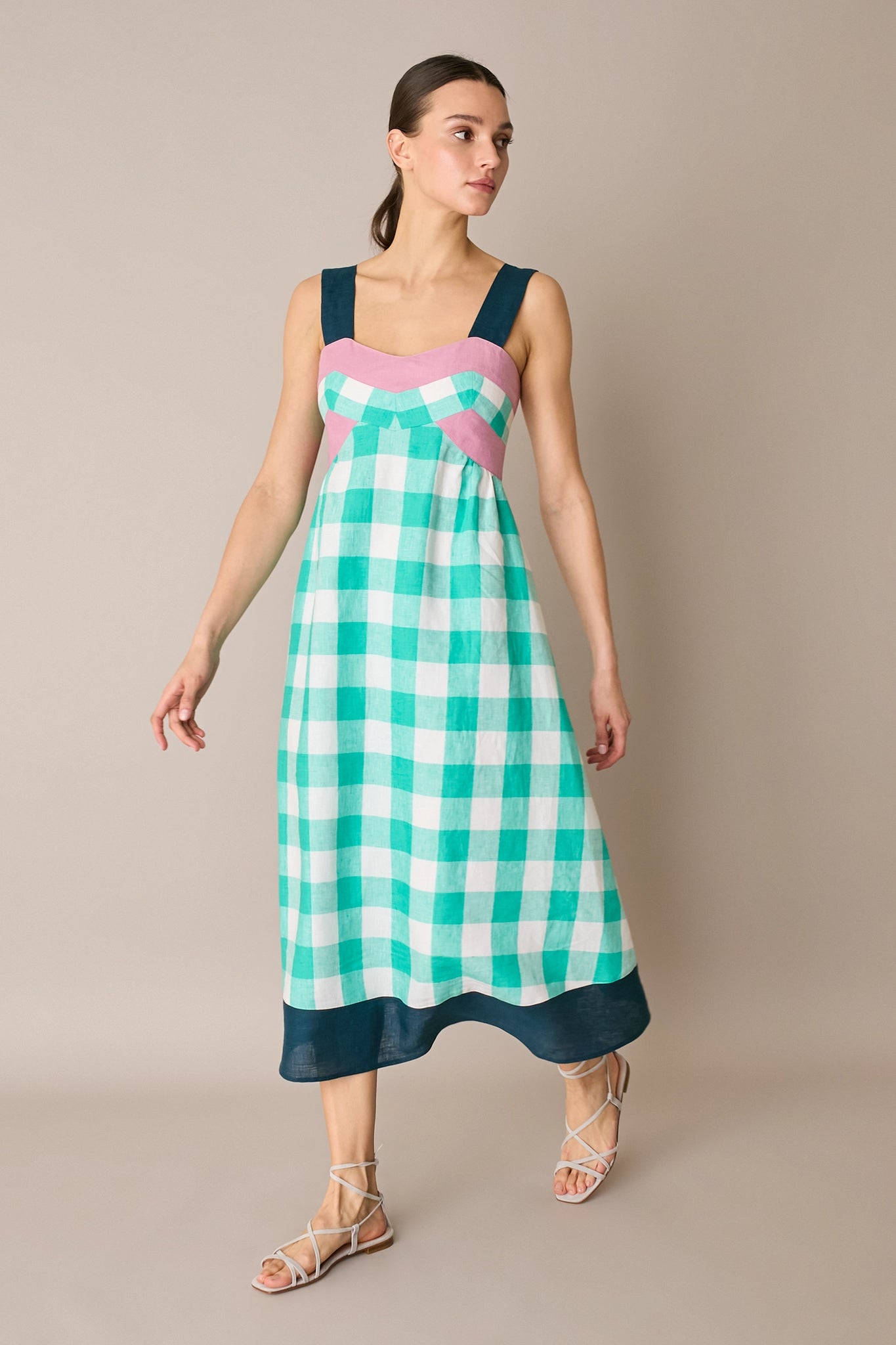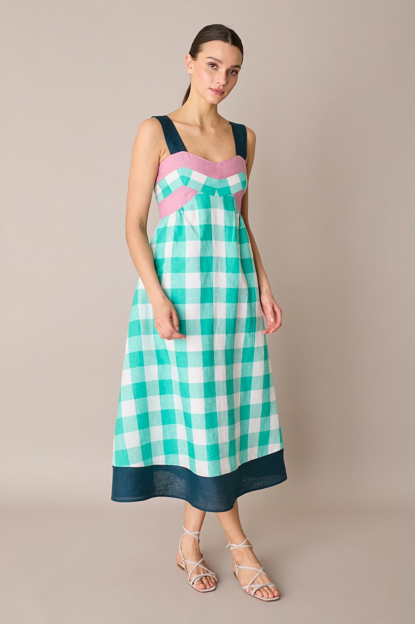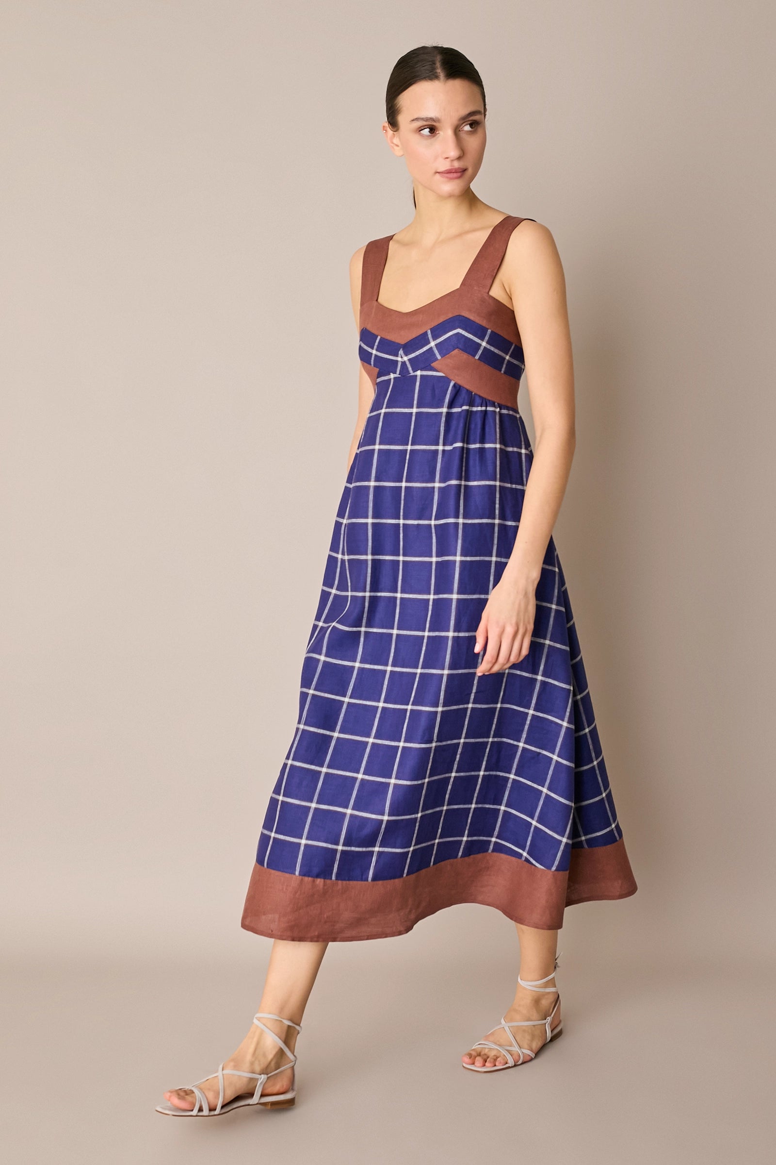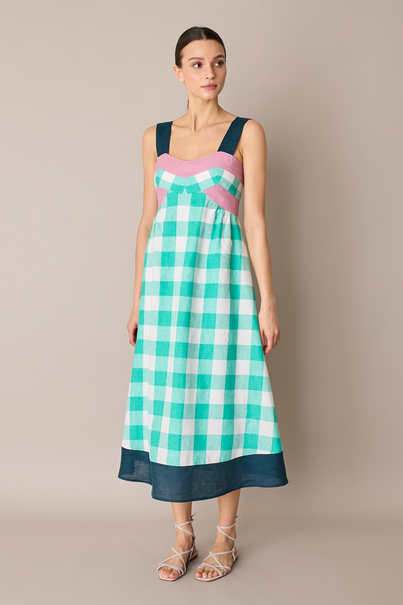 Per questo abito abbiamo scelto un lino fresco e leggero. Caratterizzato da una costruzione particolare, enfatizzata dall’uso di colori diversi, è disponibile in tre varianti perfette per l’estate.