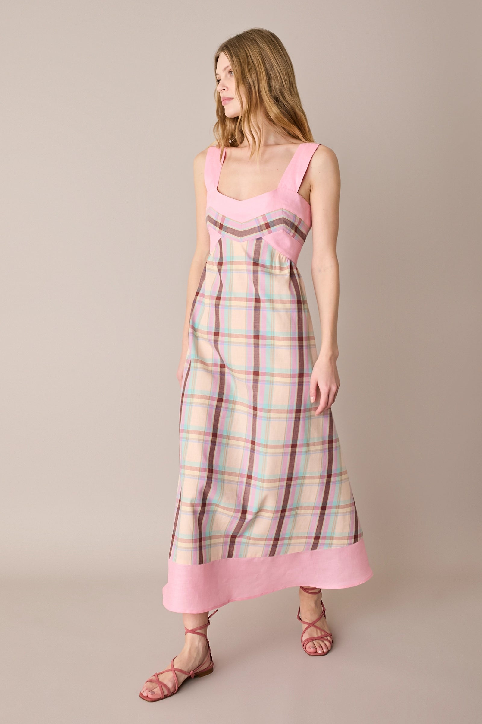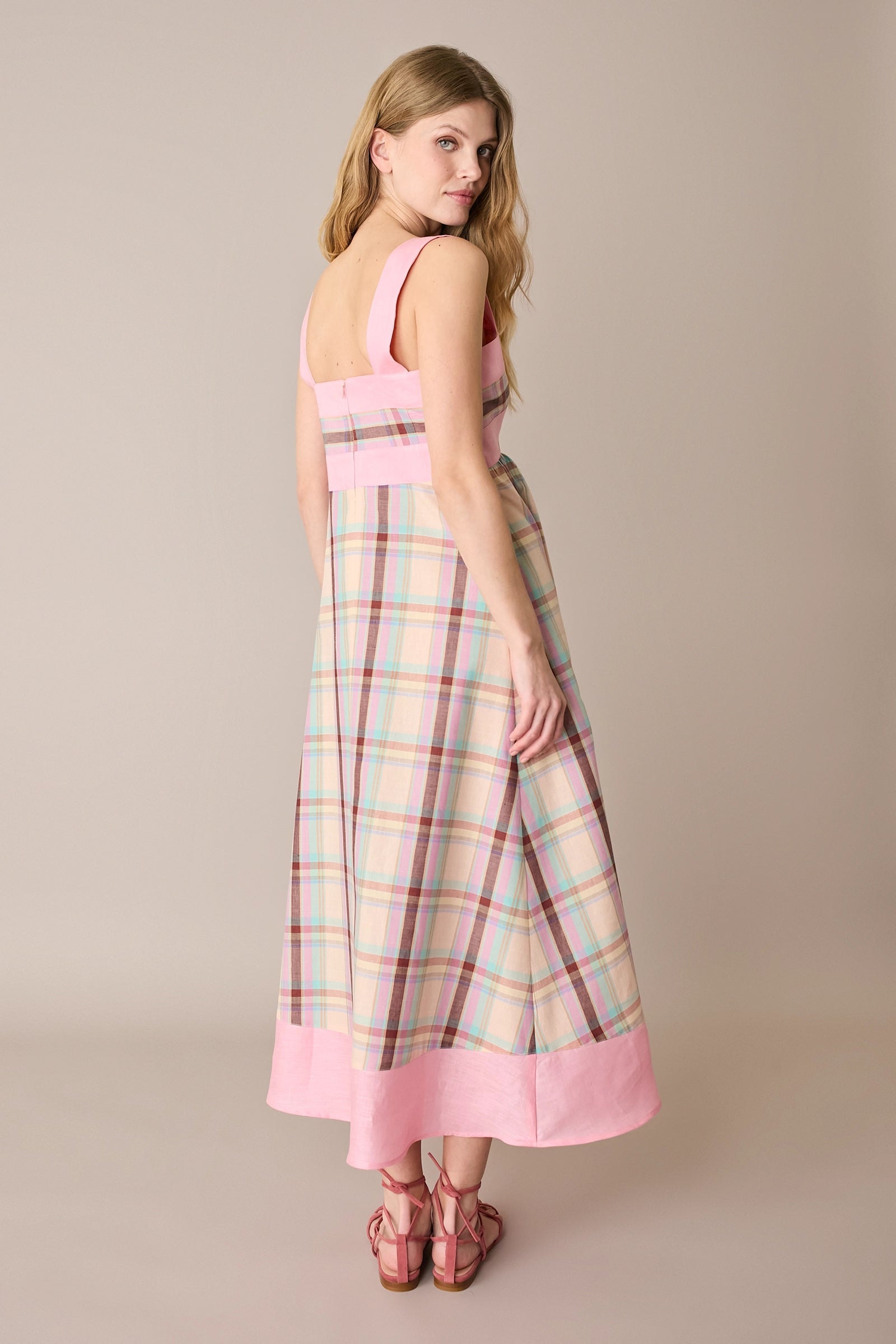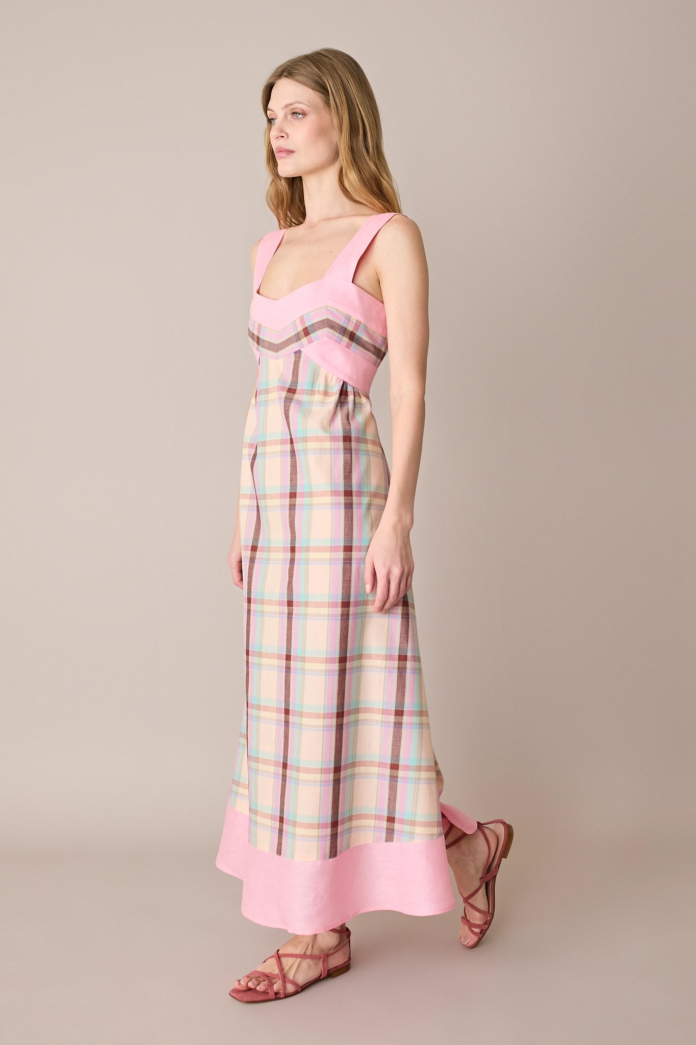 Per questo abito abbiamo scelto un fresco blend di lino e cotone. Caratterizzato da una costruzione particolare, enfatizzata dall’uso di colori diversi e dall’incrocio del motivo a quadri, è disponibile in un’unica variante su base giallo pastello.