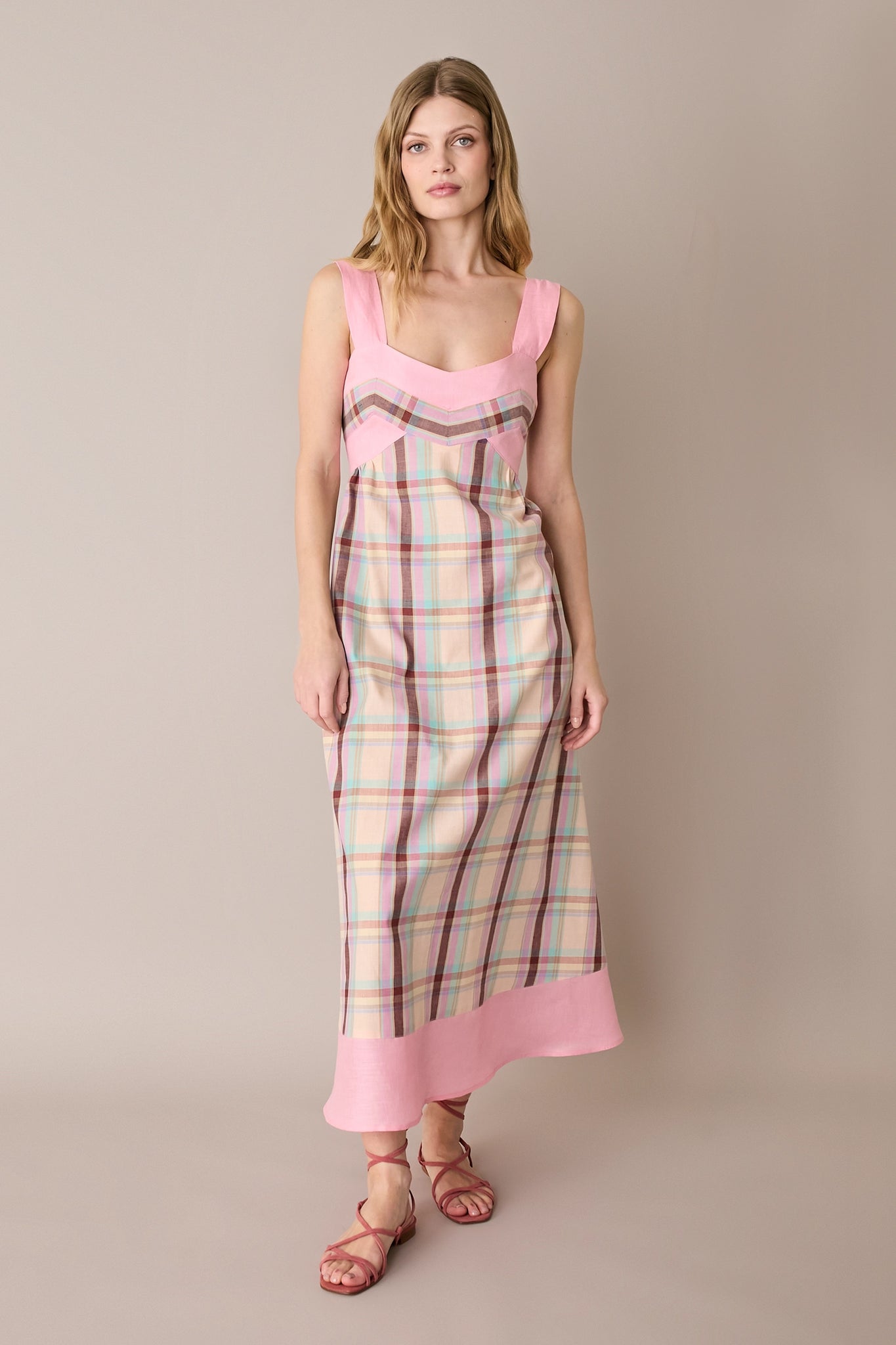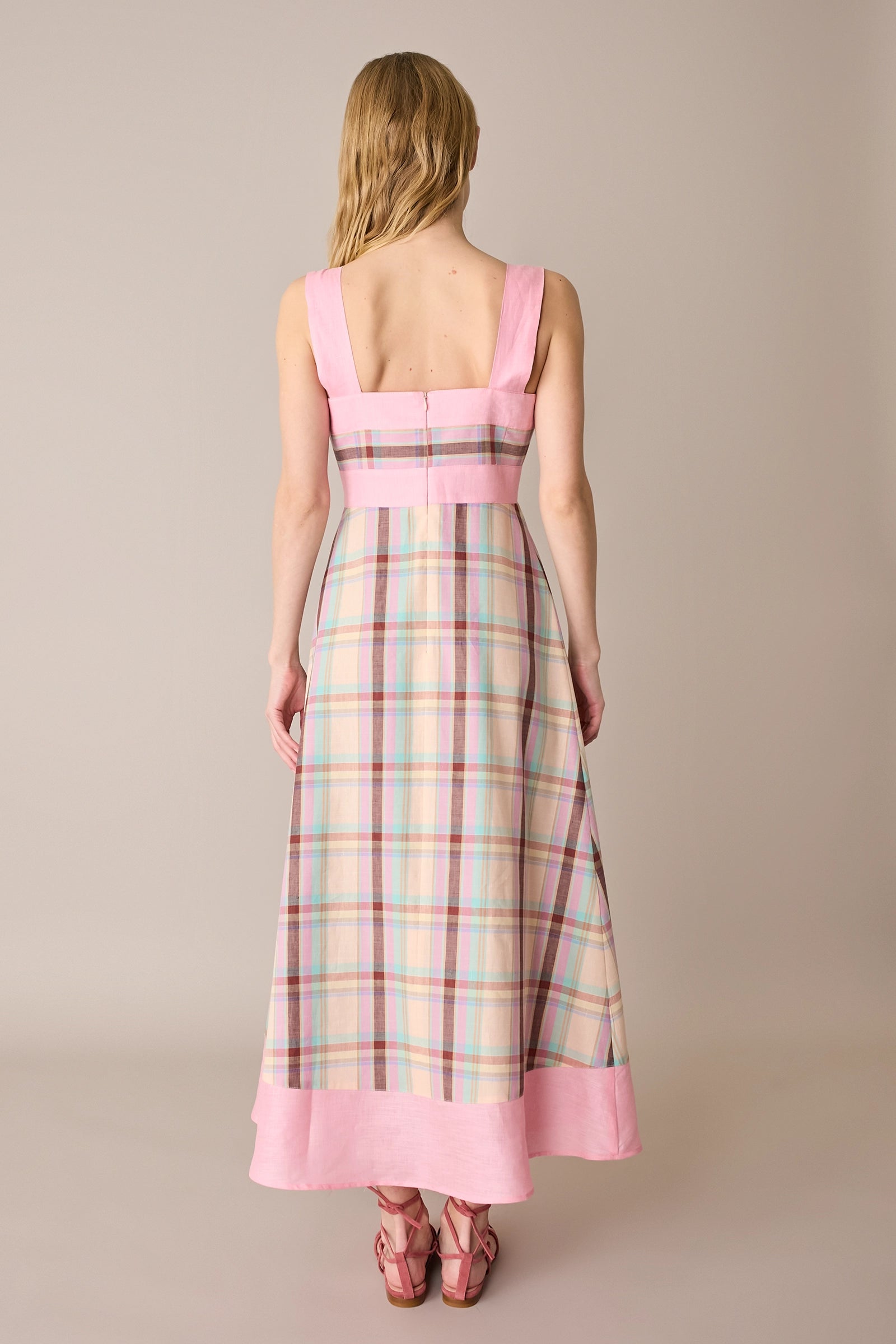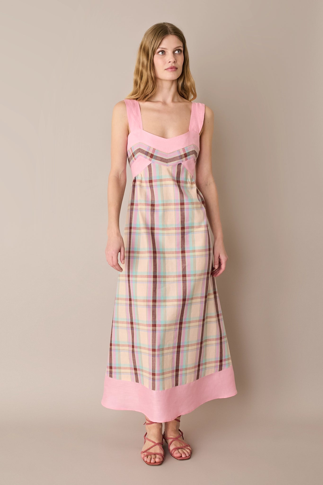 Per questo abito abbiamo scelto un fresco blend di lino e cotone. Caratterizzato da una costruzione particolare, enfatizzata dall’uso di colori diversi e dall’incrocio del motivo a quadri, è disponibile in un’unica variante su base giallo pastello.