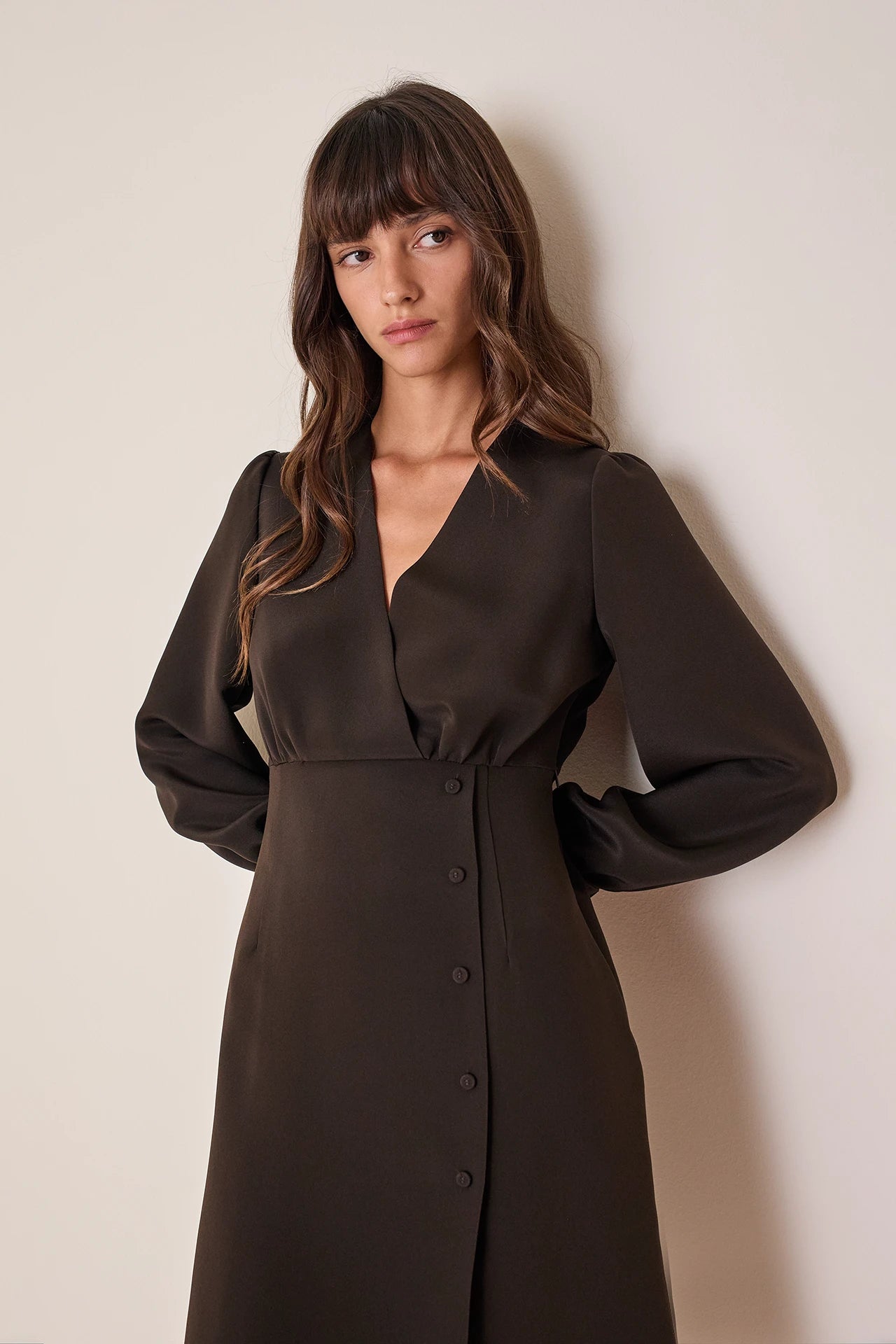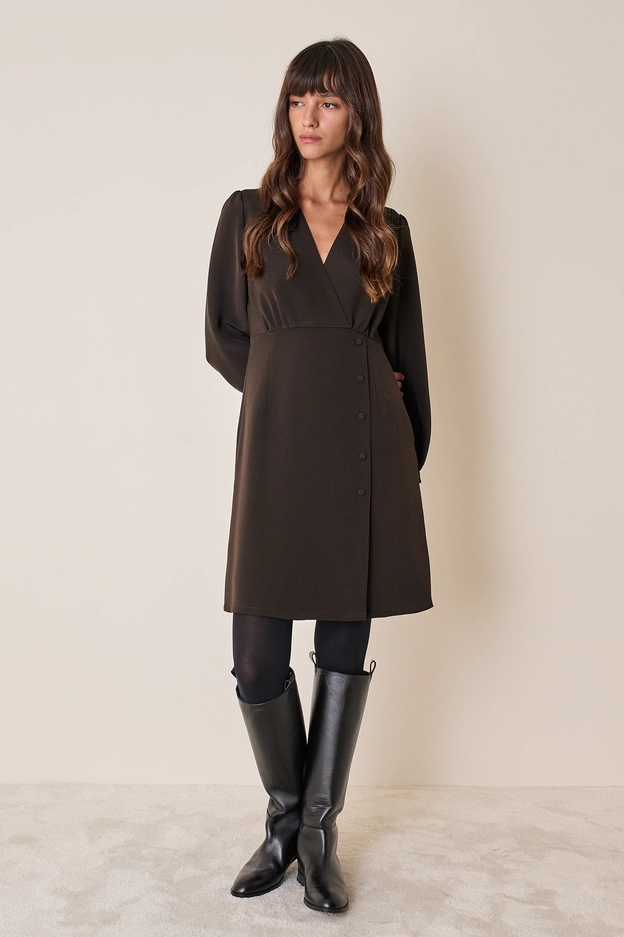Semplice e versatile, questo abito in crepe elasticizzata è perfetto per l’ufficio. Indossalo con o senza calze, abbinato a slingback o stivali in pelle. Disponibile in nero o marrone.