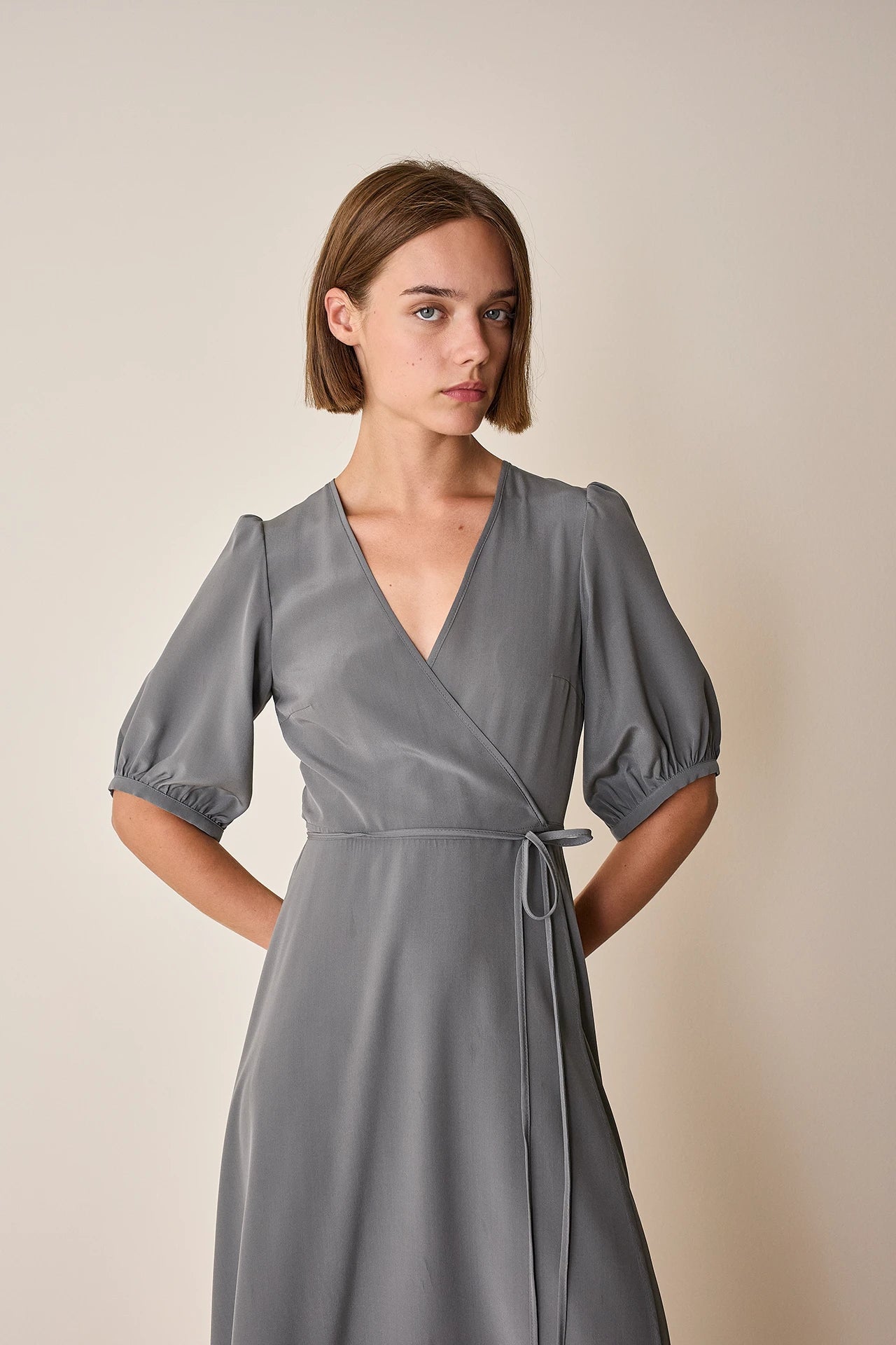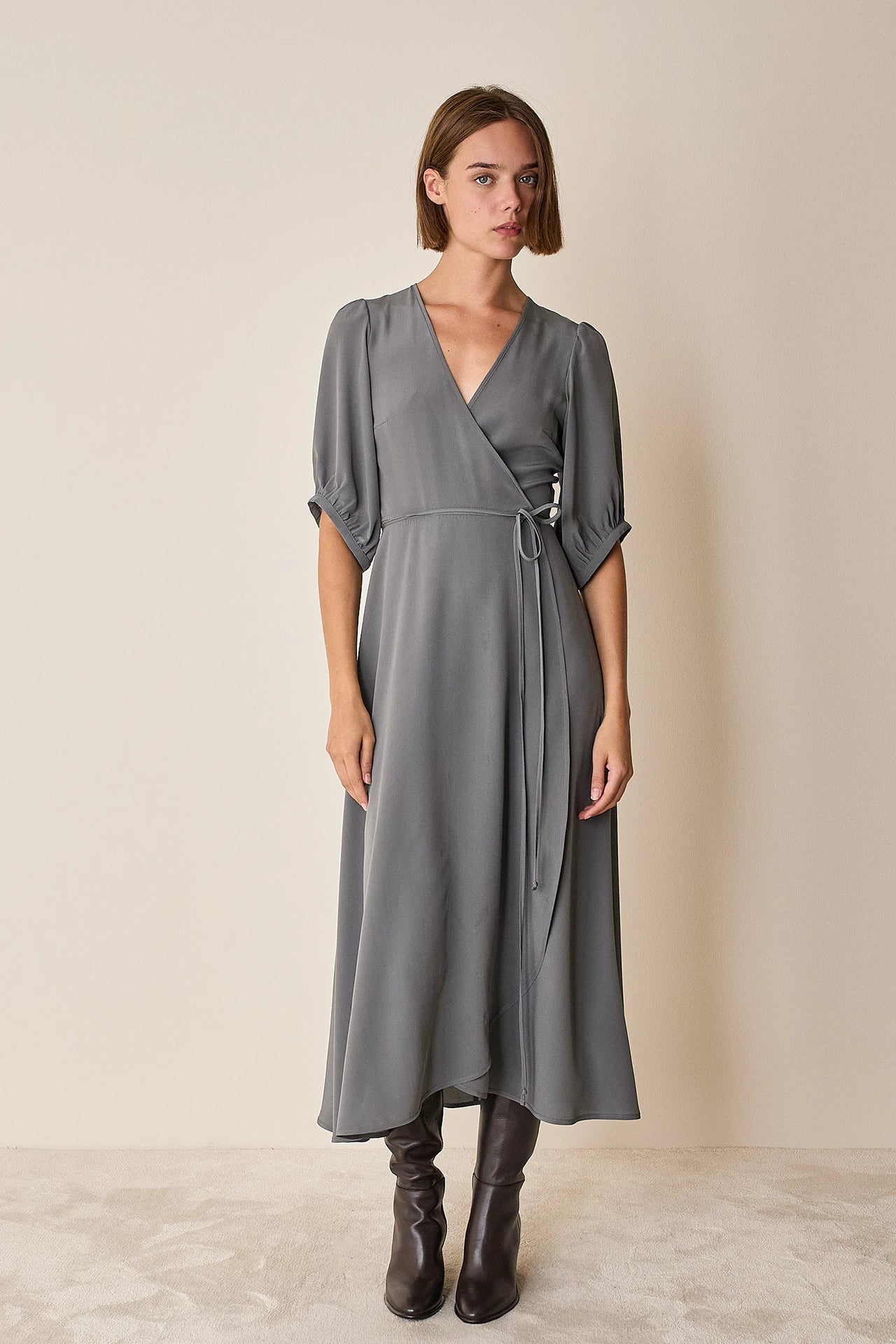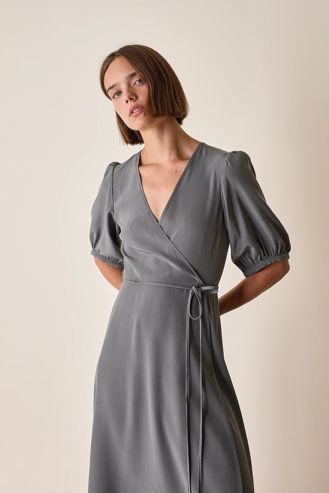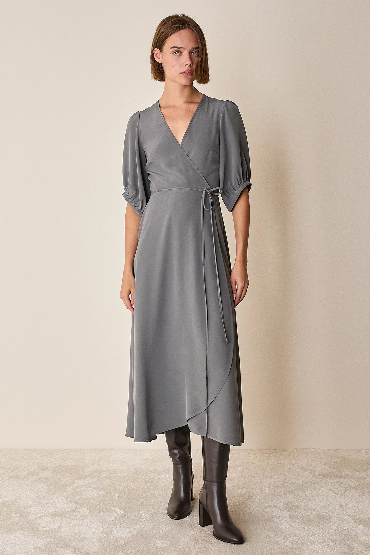 Ideale sia per le cerimonie che per l'ufficio, questo abito a portafoglio è realizzato in pura crêpe de chine di seta. Abbinalo a blazer e stivali per il giorno, oppure a sandali e tacchi per la sera. Disponibile in melanzana, verde e grigio.