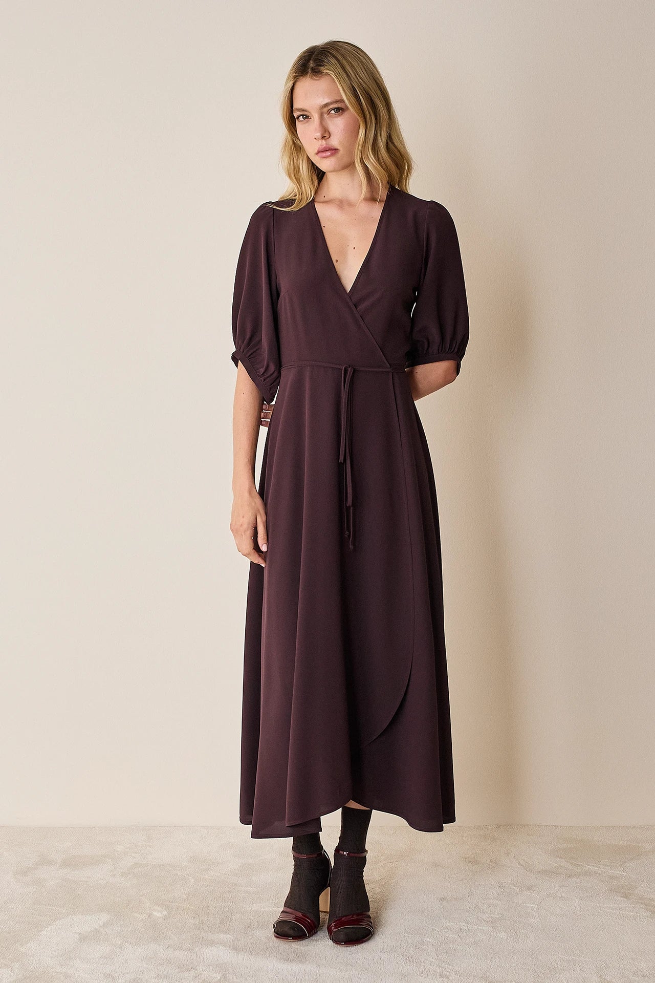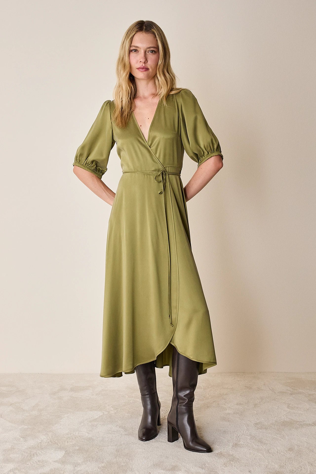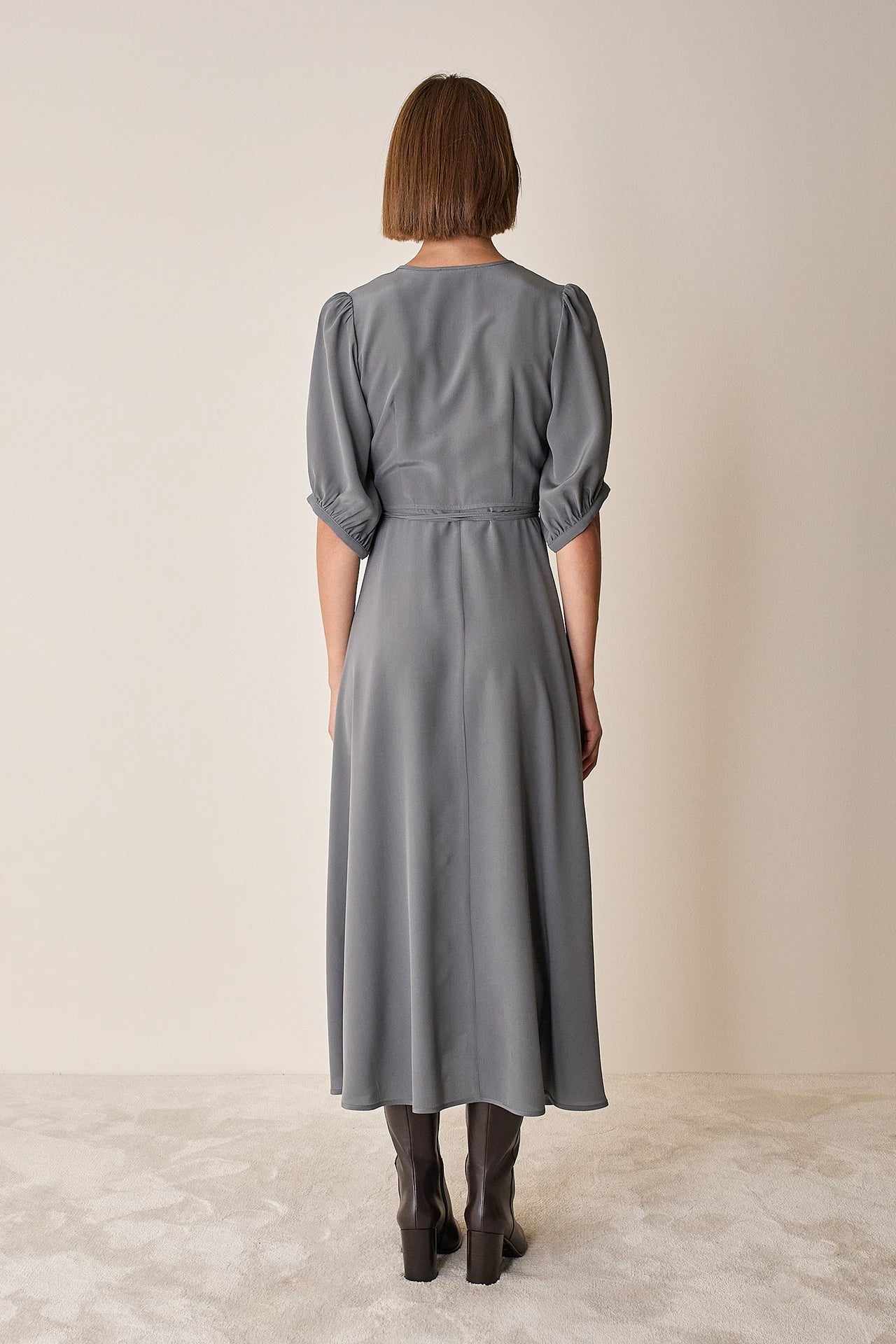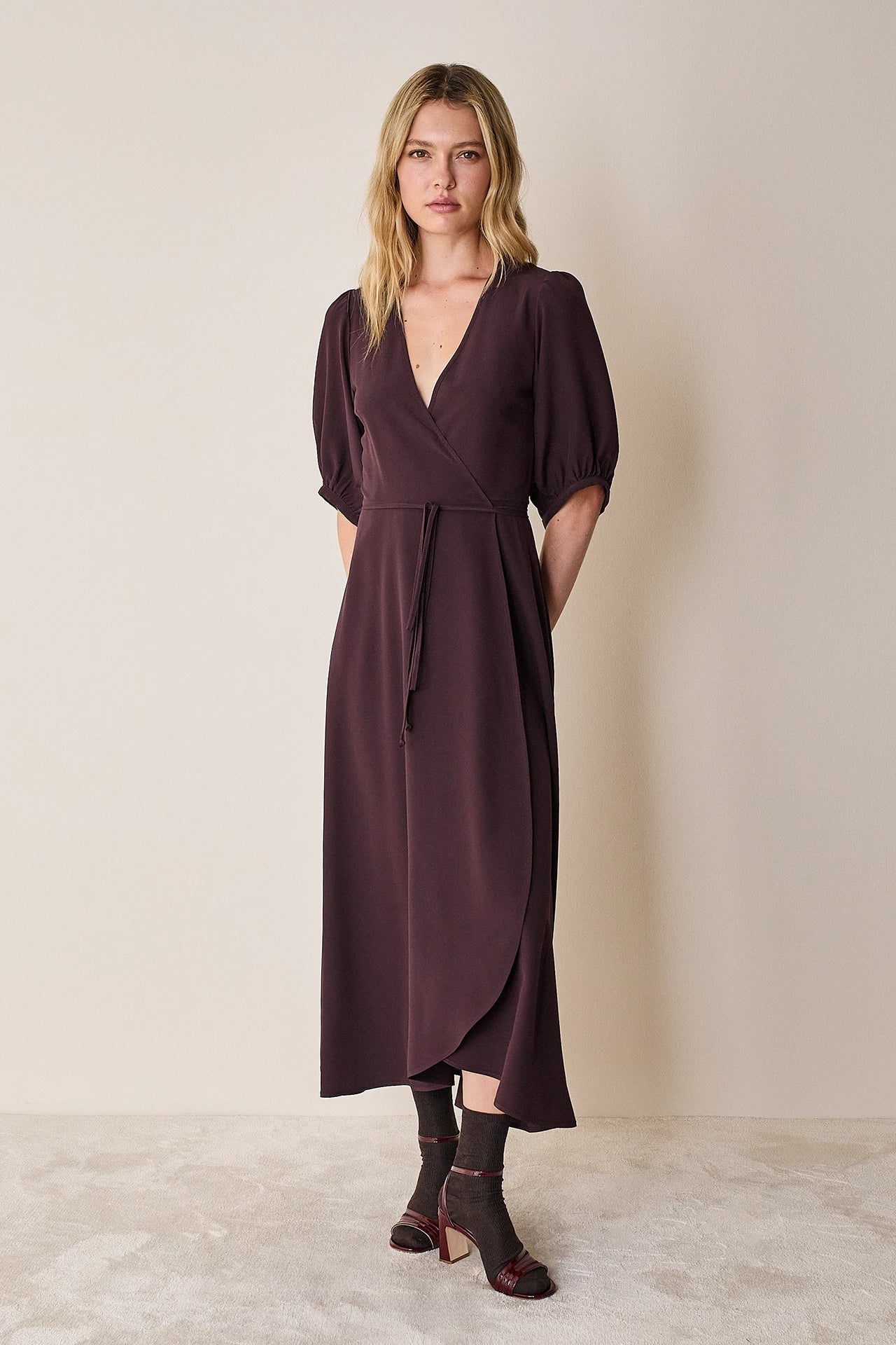 Ideale sia per le cerimonie che per l'ufficio, questo abito a portafoglio è realizzato in pura crêpe de chine di seta. Abbinalo a blazer e stivali per il giorno, oppure a sandali e tacchi per la sera. Disponibile in melanzana, verde e grigio.