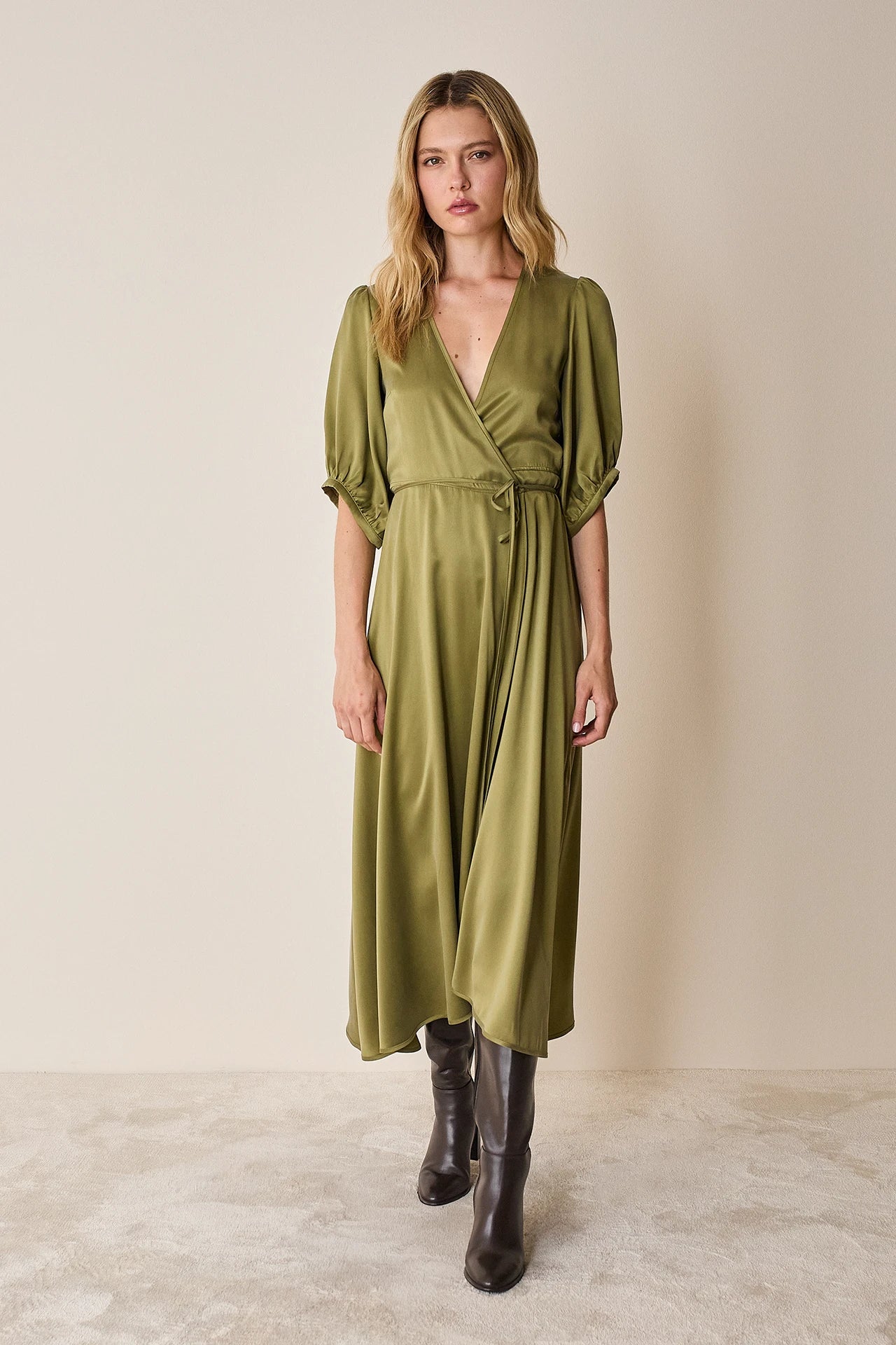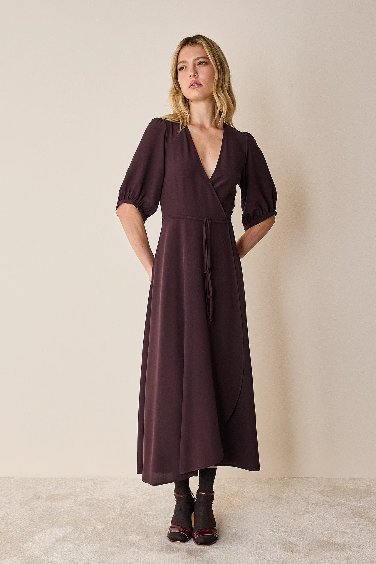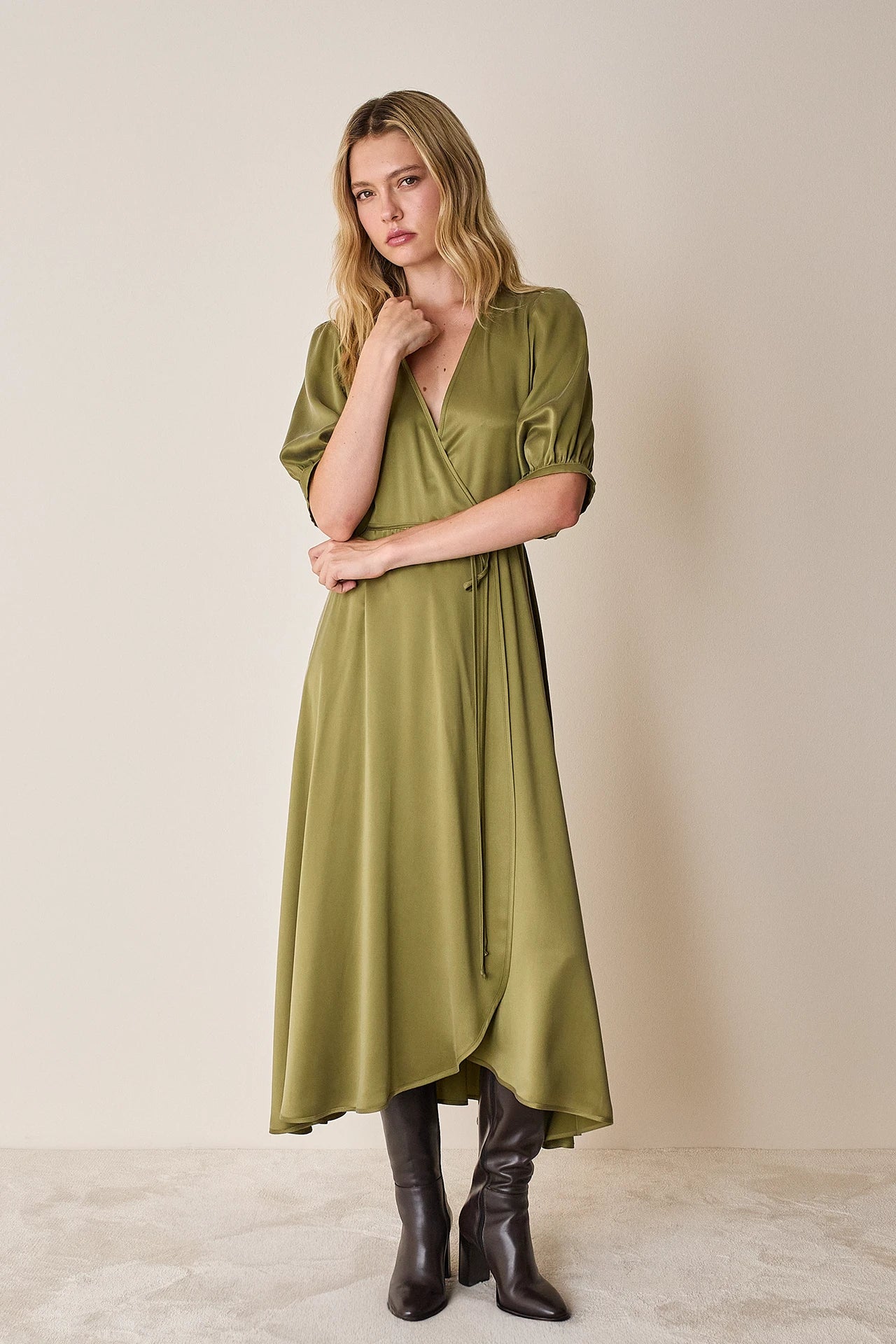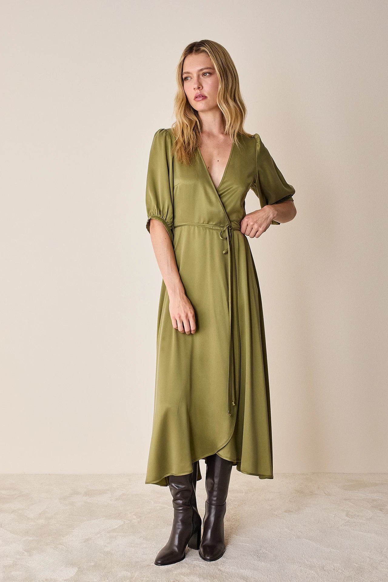 Ideale sia per le cerimonie che per l'ufficio, questo abito a portafoglio è realizzato in pura crêpe de chine di seta. Abbinalo a blazer e stivali per il giorno, oppure a sandali e tacchi per la sera. Disponibile in melanzana, verde e grigio.
