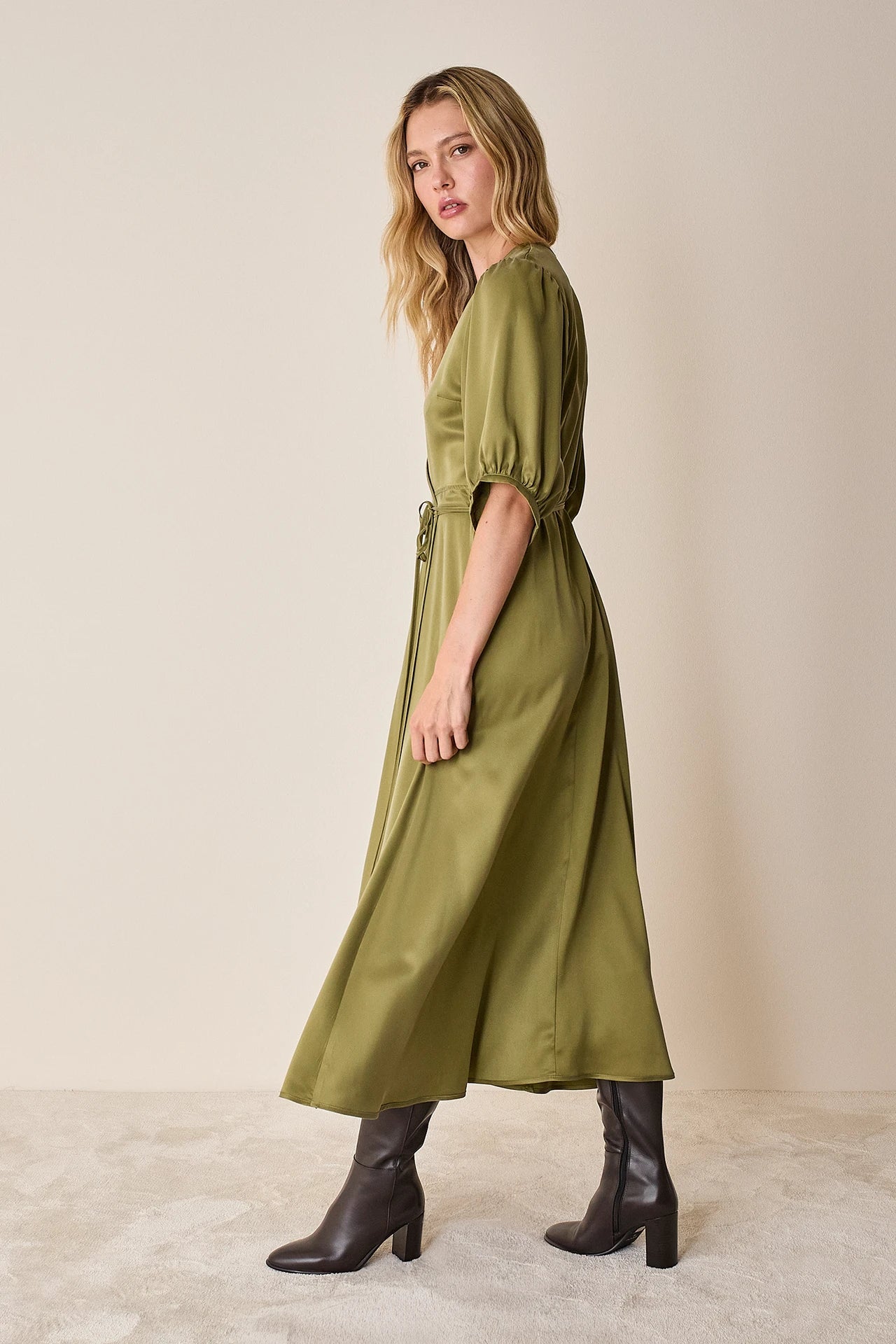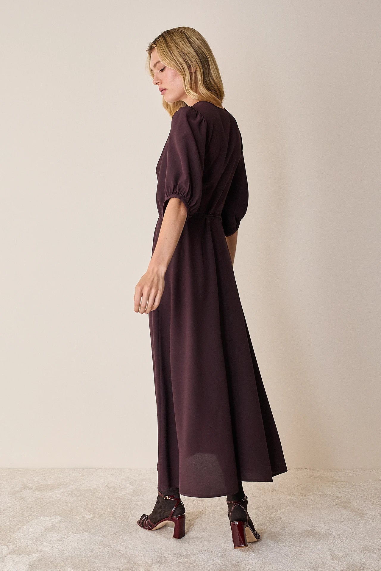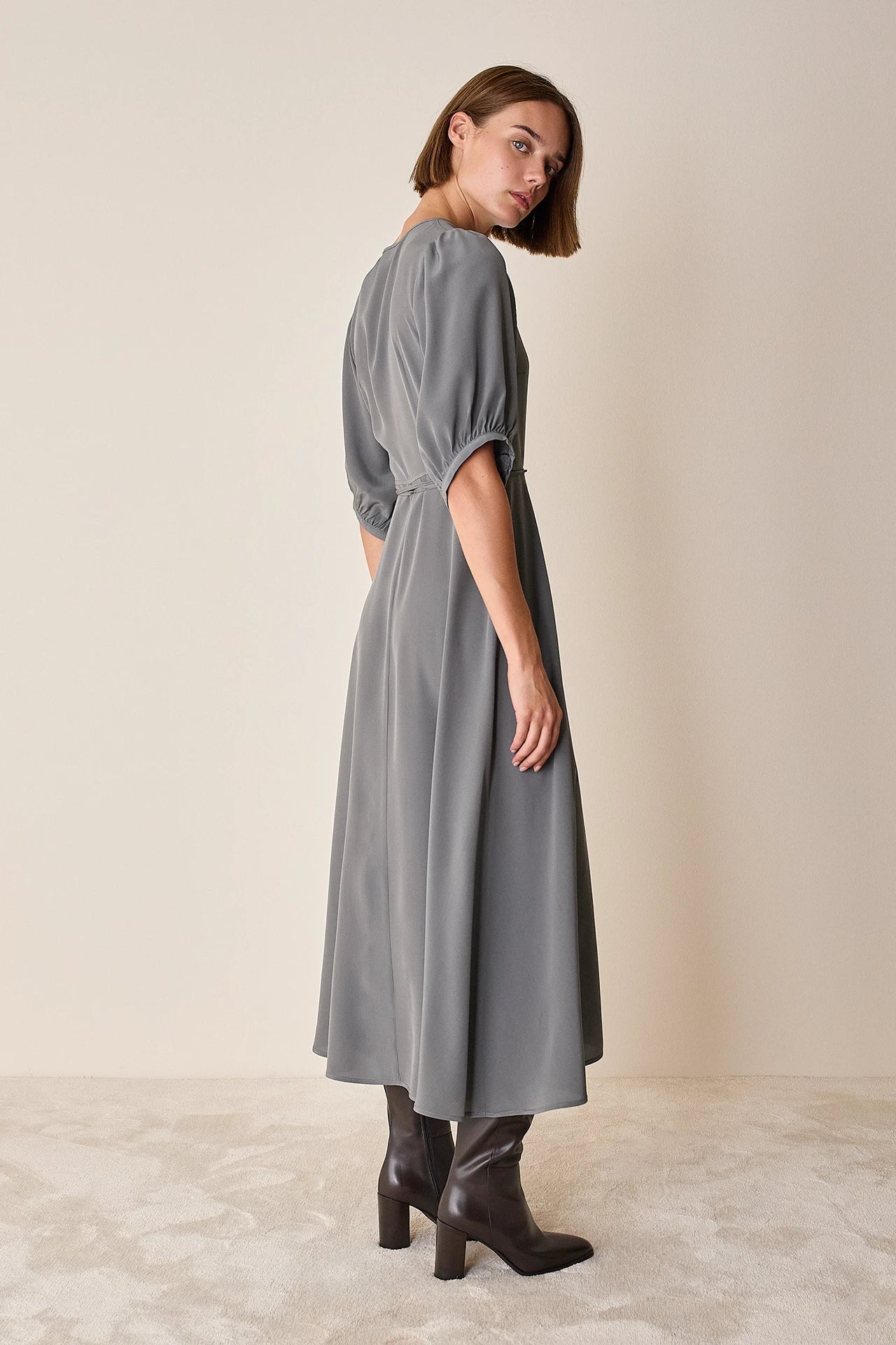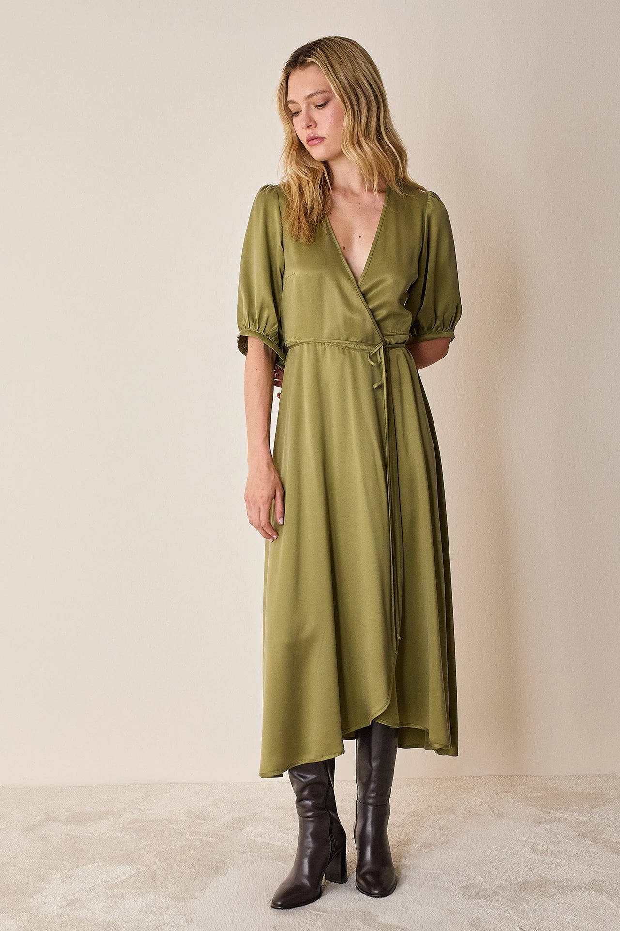 Ideale sia per le cerimonie che per l'ufficio, questo abito a portafoglio è realizzato in pura crêpe de chine di seta. Abbinalo a blazer e stivali per il giorno, oppure a sandali e tacchi per la sera. Disponibile in melanzana, verde e grigio.