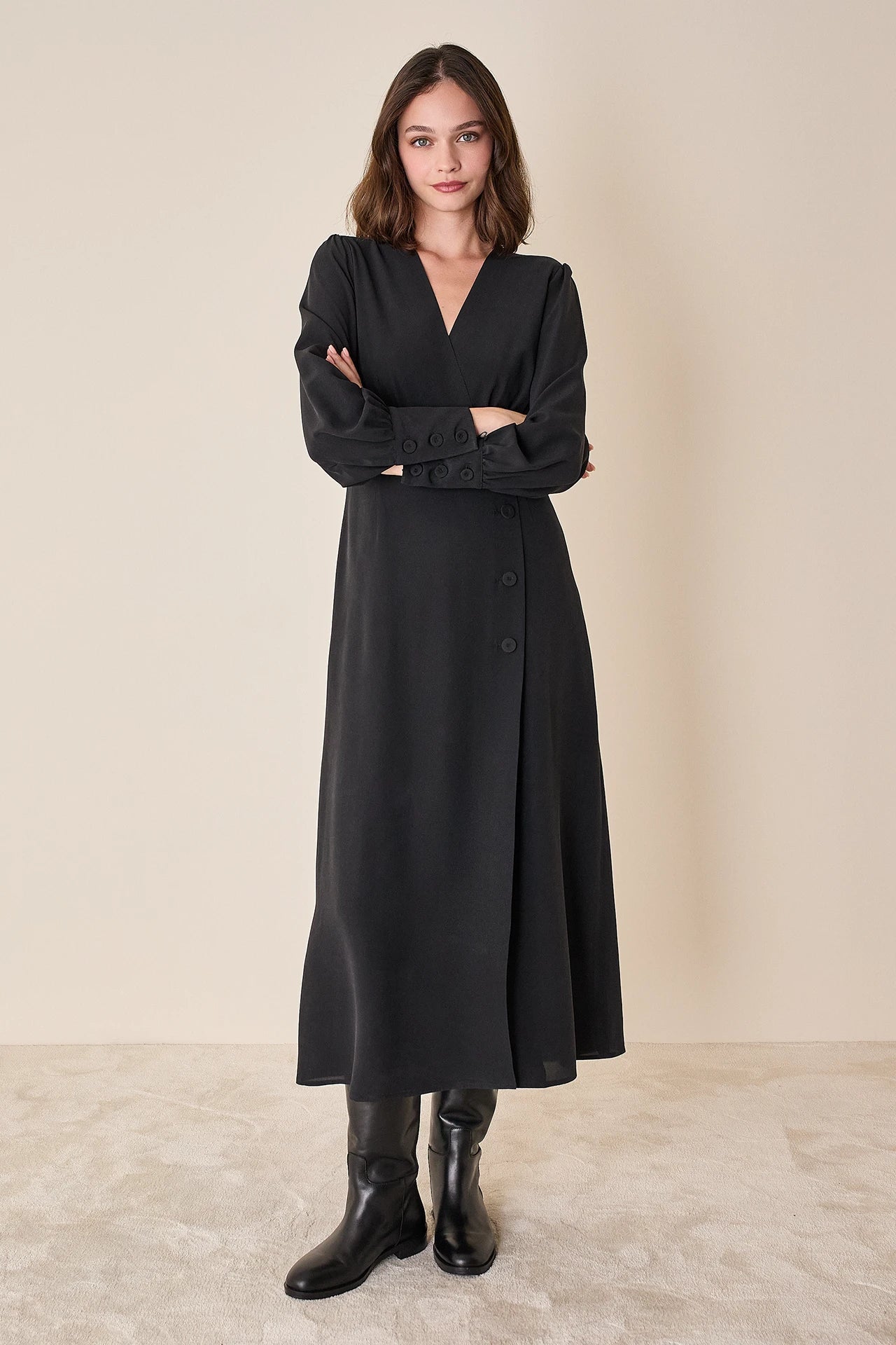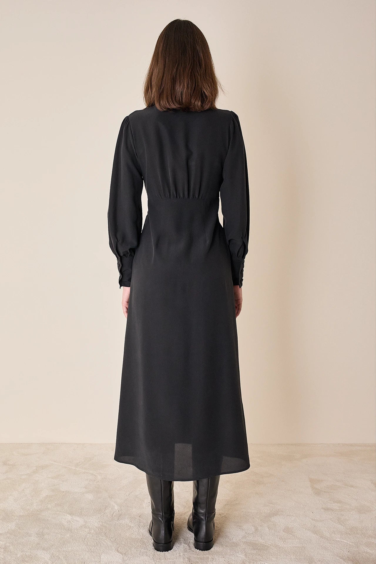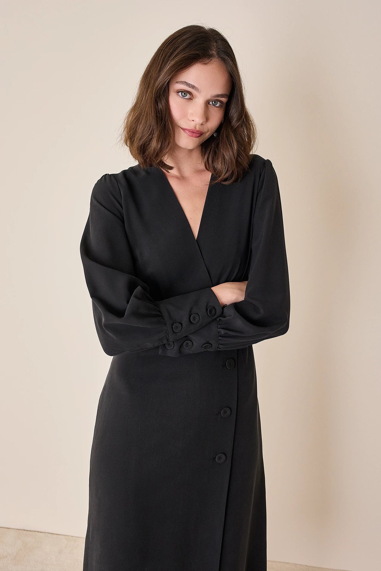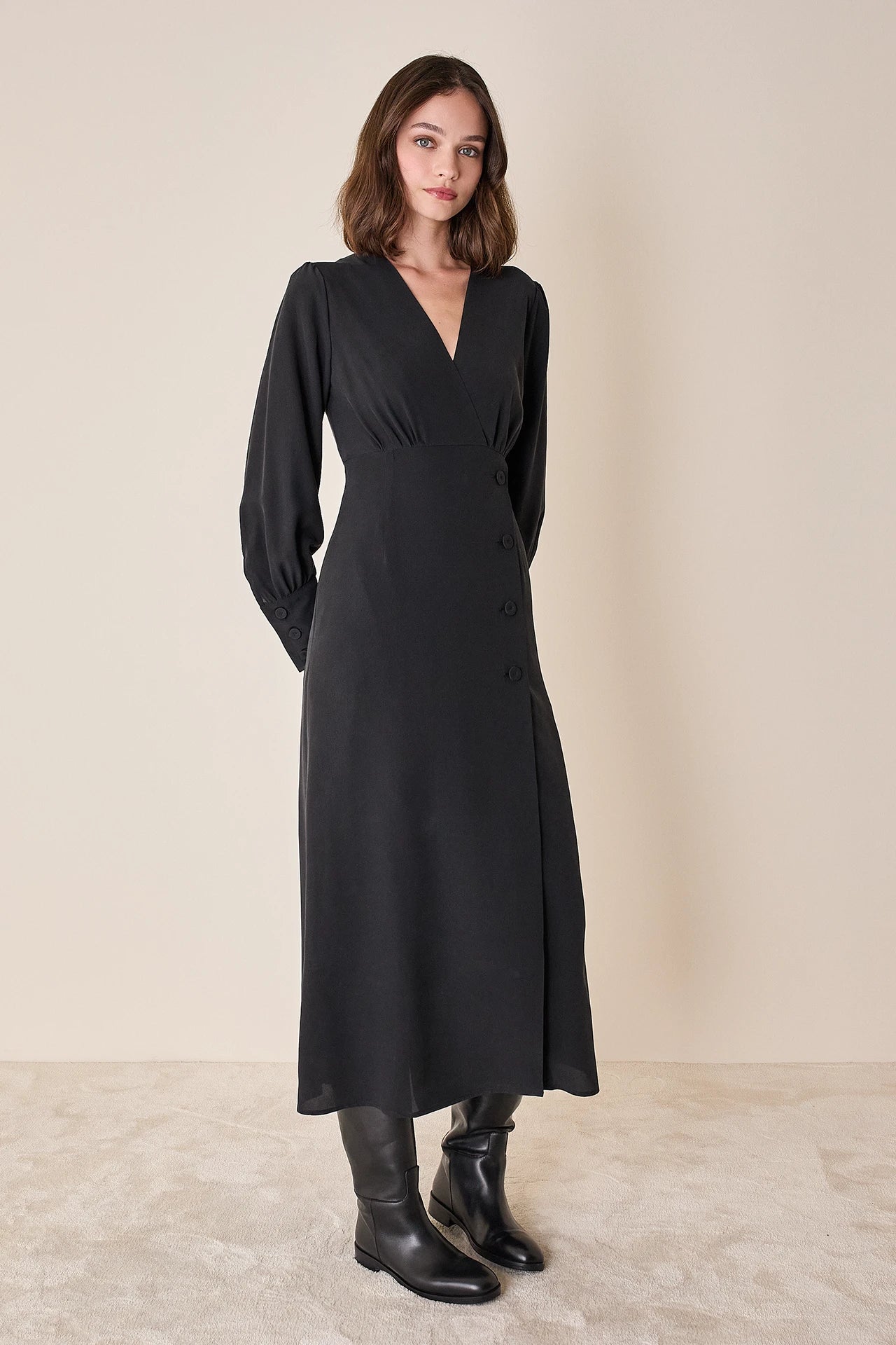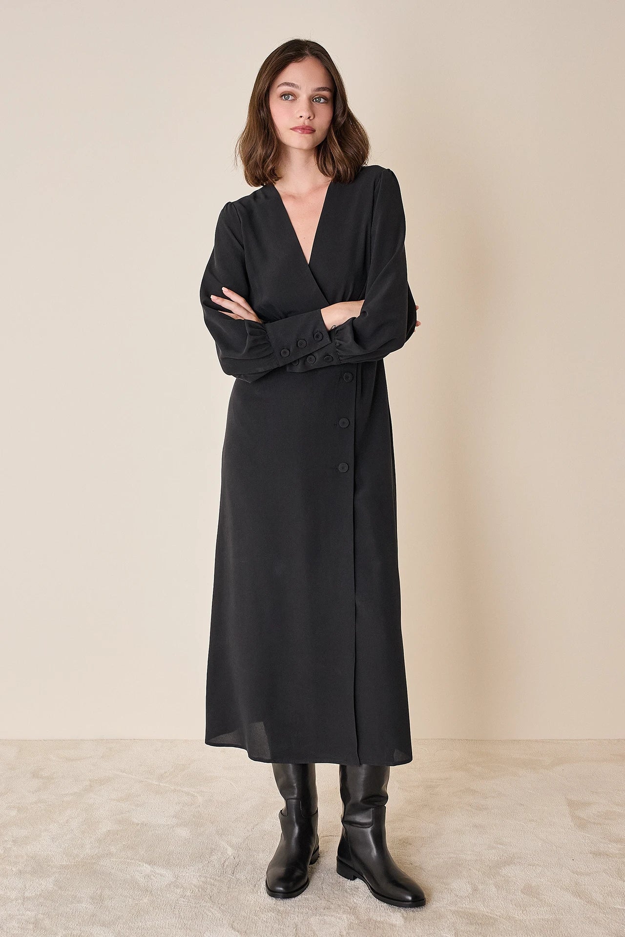 Come questo abito lungo in blend di seta: perfetto per una cerimonia con un paio di sandali eleganti (e grazie alle maniche lunghe non avrai bisogno di una giacca), ma altrettanto adatto all’ufficio se abbinato a un paio di stivali. Disponibile in nero.