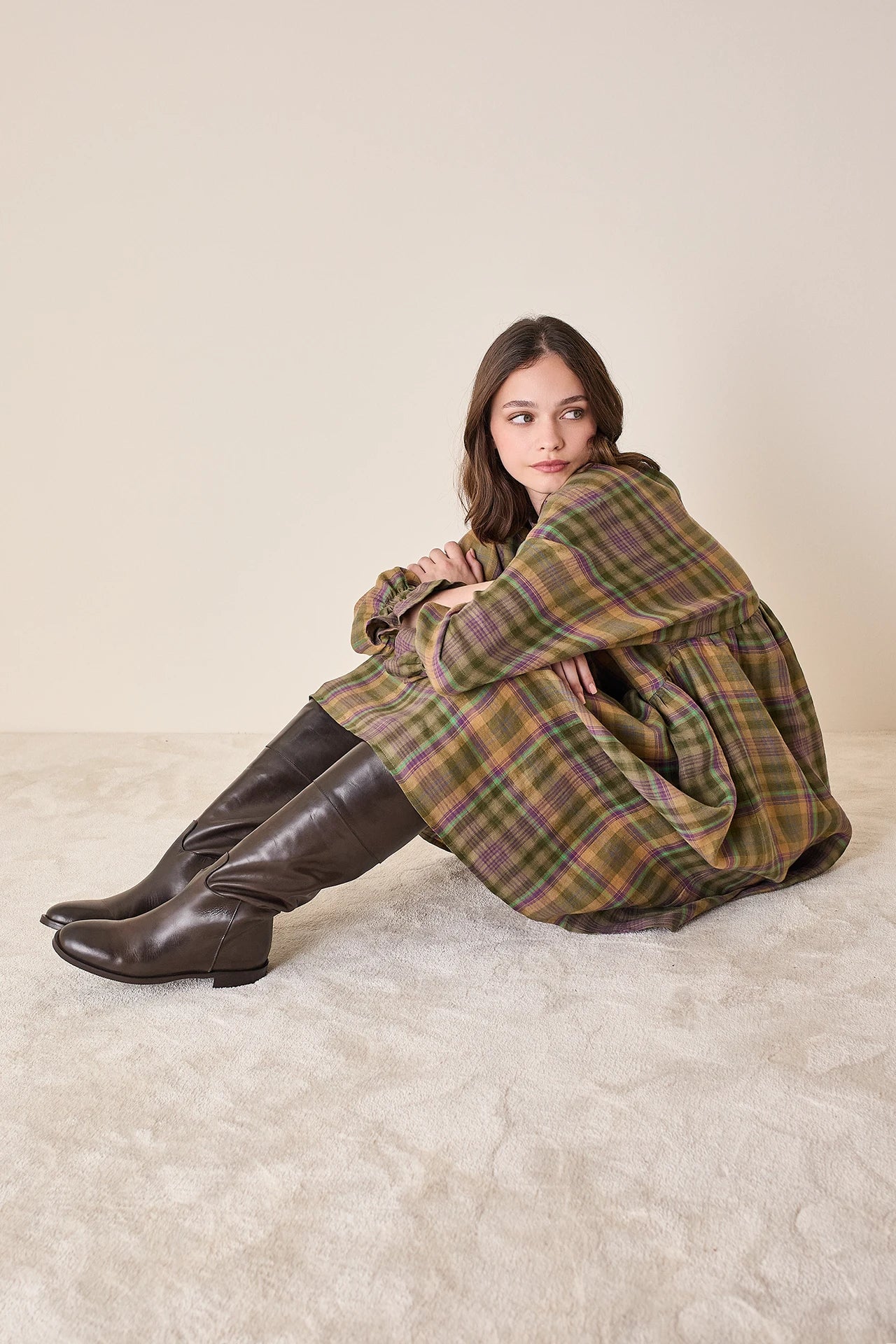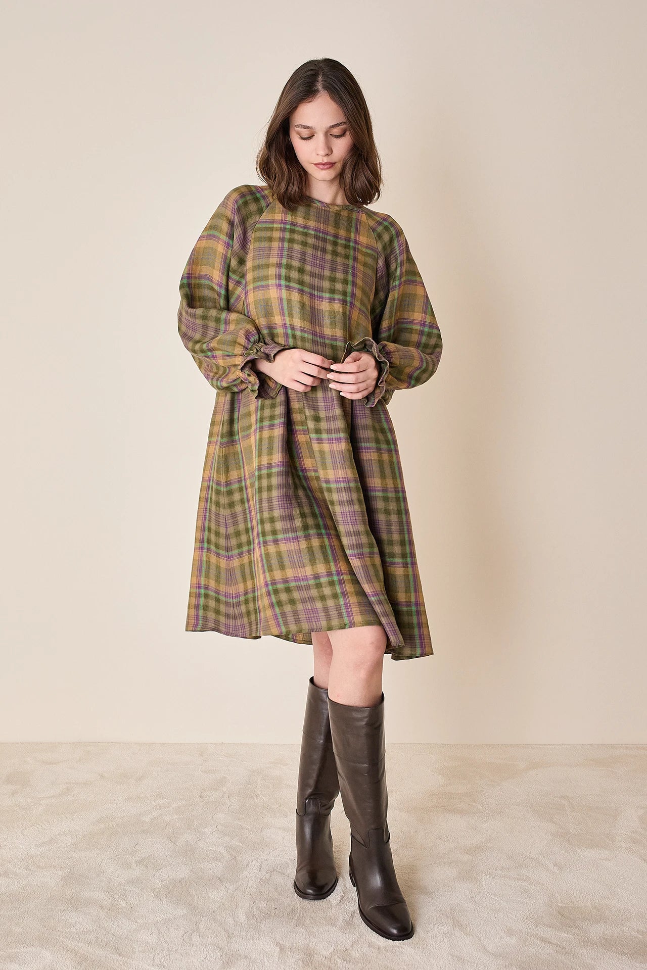 Per questo abito abbiamo scelto una costruzione morbida con maniche raglan, che lo rende comodo da indossare ogni giorno, e un tessuto scozzese nei colori dell’autunno.