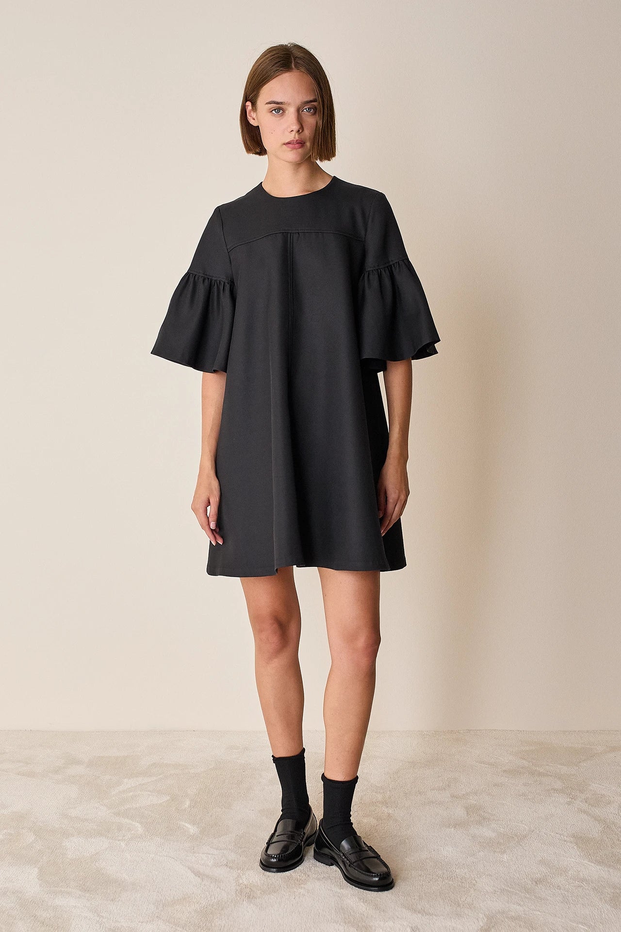 Questo abito, realizzato in un blend di seta strutturato, è caratterizzato da maniche corte a campanella. Perfetto per l'ufficio, abbinato a un paio di stivali o stivaletti, è disponibile in nero.