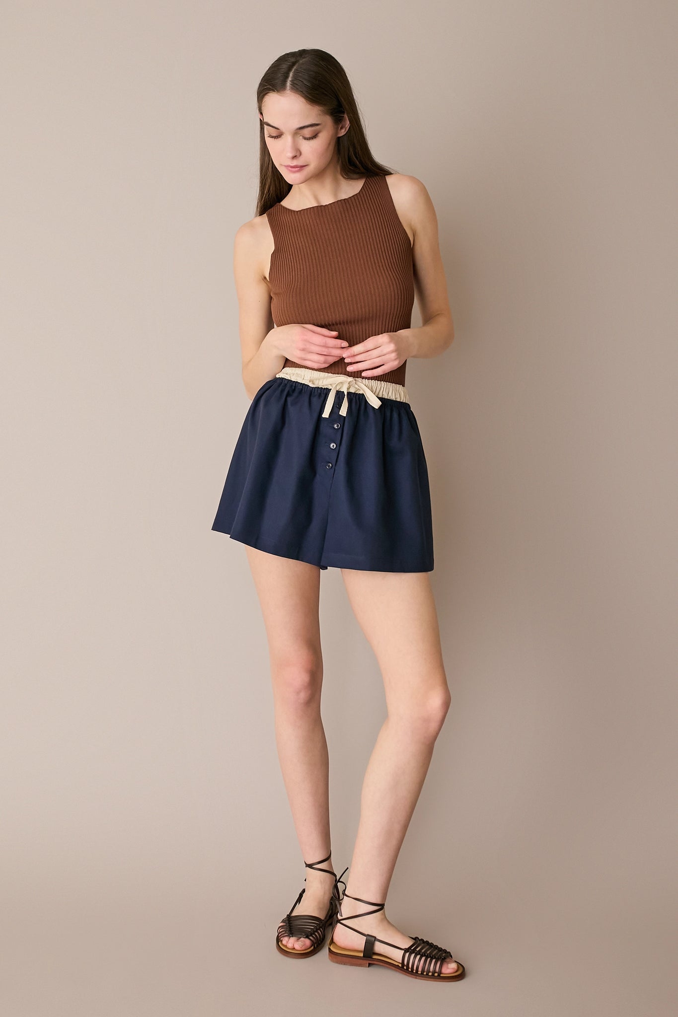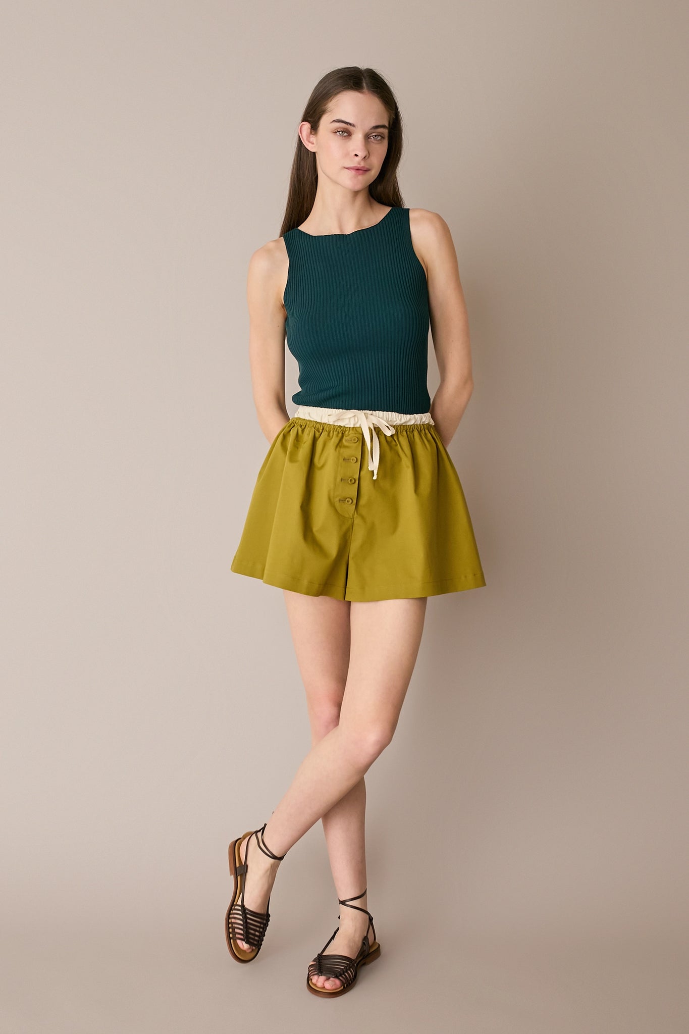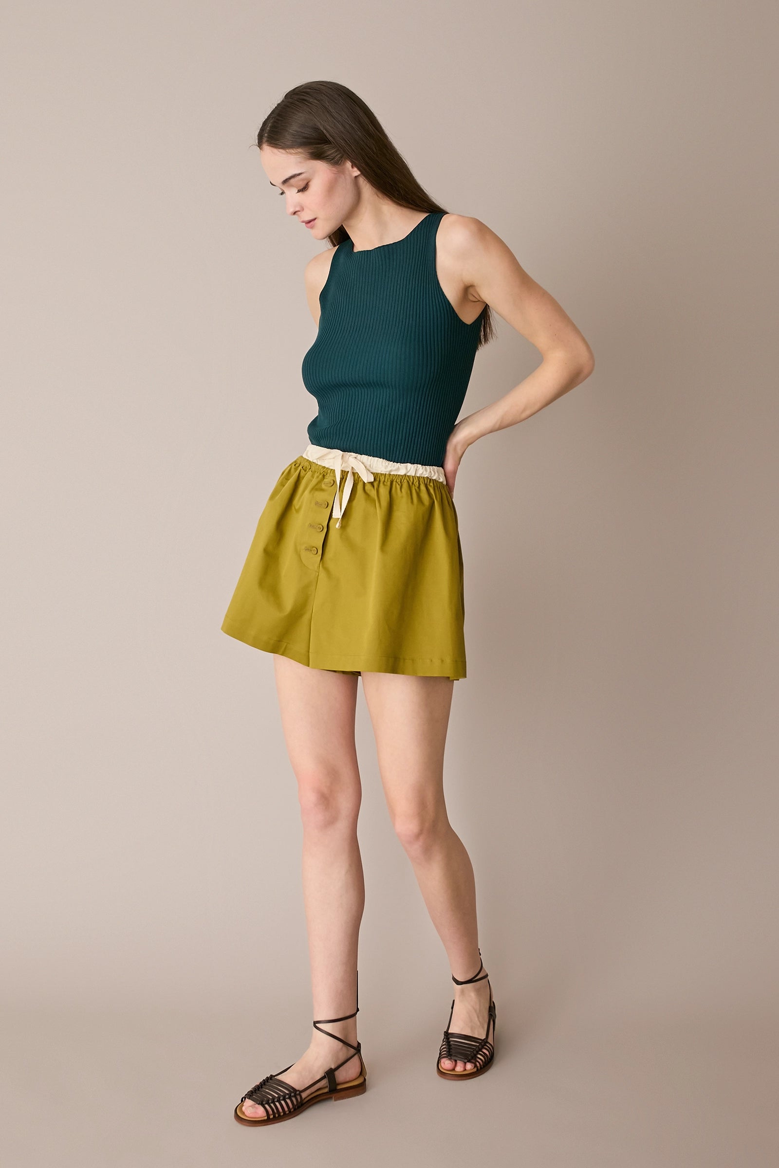L'ispirazione per questi shorts viene dai boxer maschili. Caratterizzati da una coulisse sportiva a contrasto che crea un effetto di sovrapposizione e da una finta abbottonatura frontale, sono disponibili in blu o verde oliva.