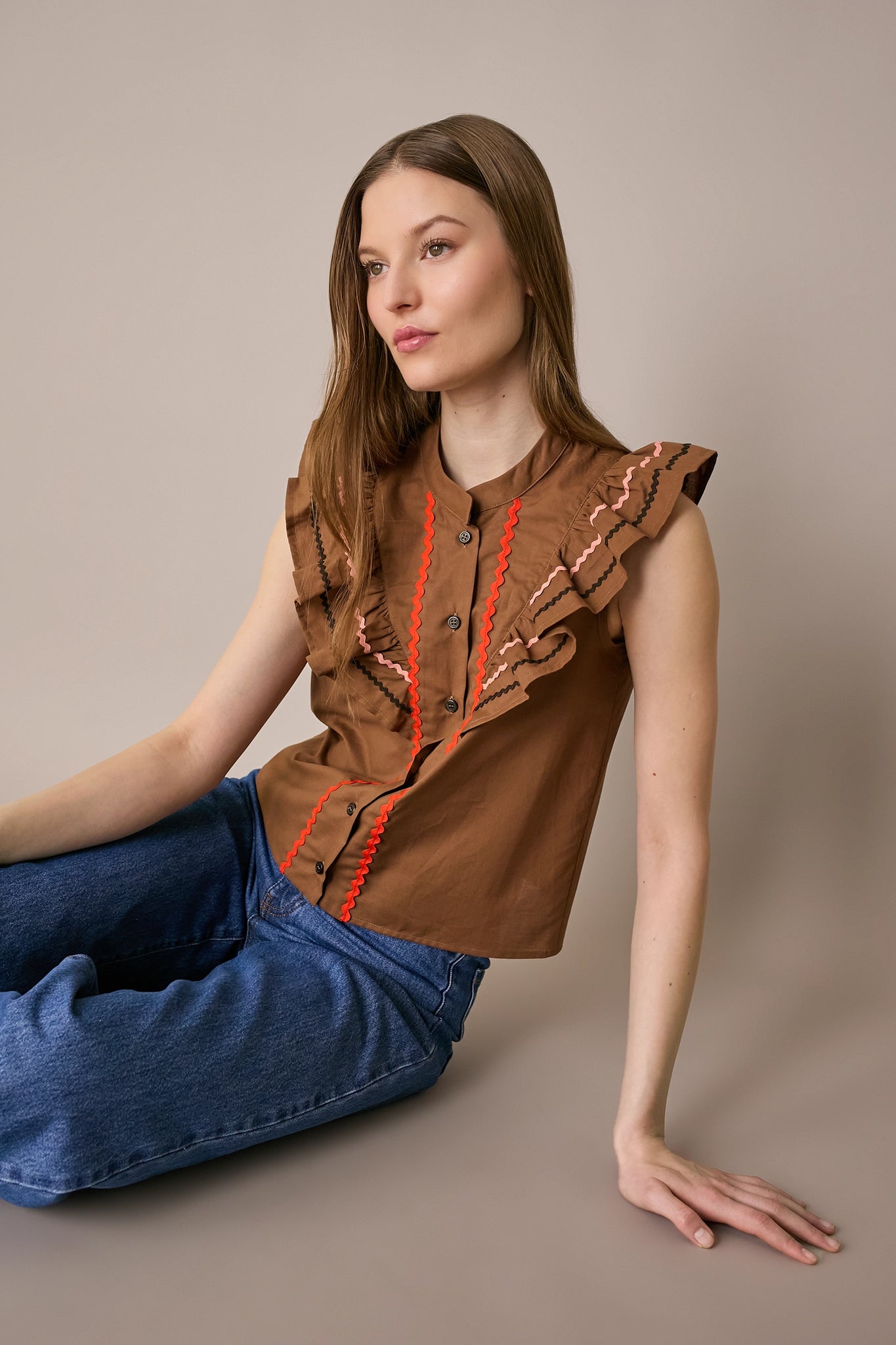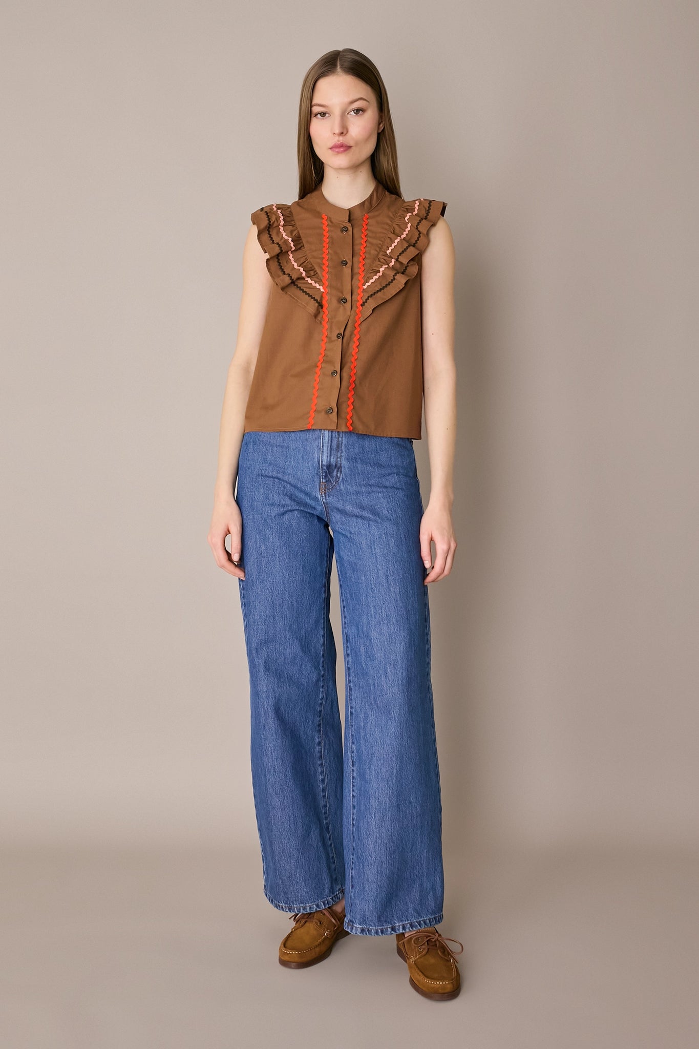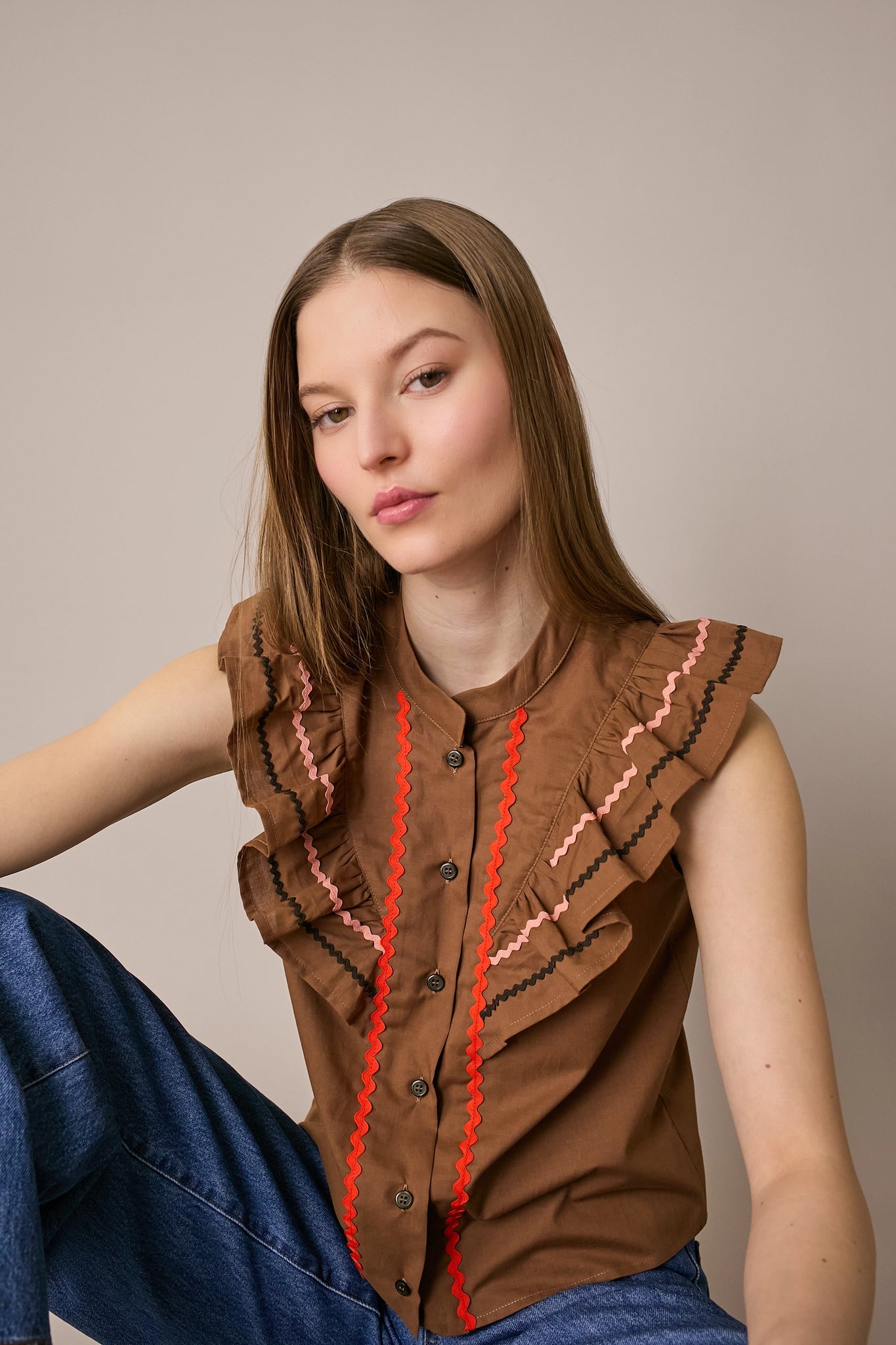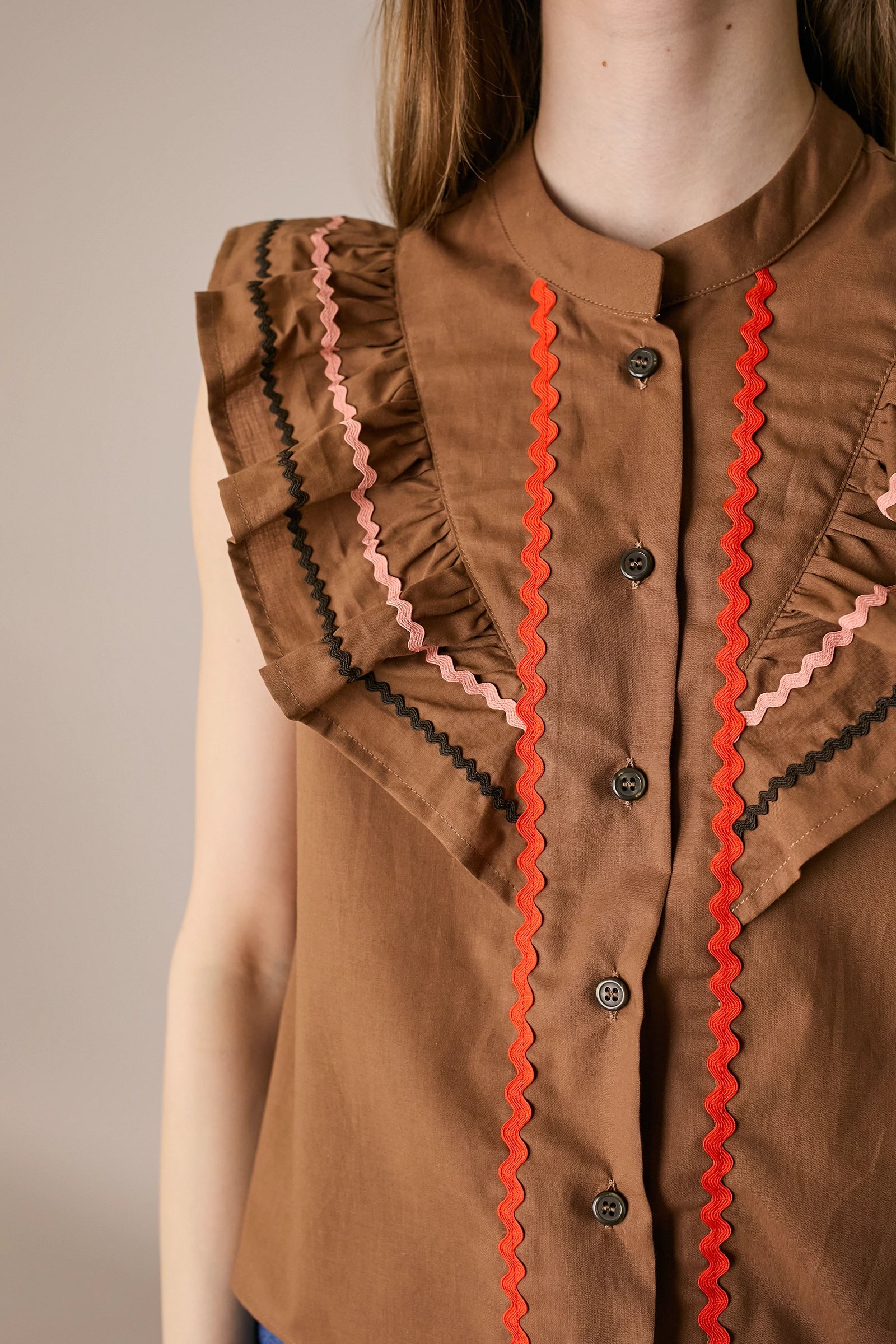 Per questa camicetta abbiamo scelto un cotone leggero, perfetto per l’estate, arricchito da passamanerie colorate. Indossala con un paio di pantaloni sartoriali in ufficio, oppure abbinala a un paio di shorts in denim quando la porterai in vacanza. Disponibile in biscotto.