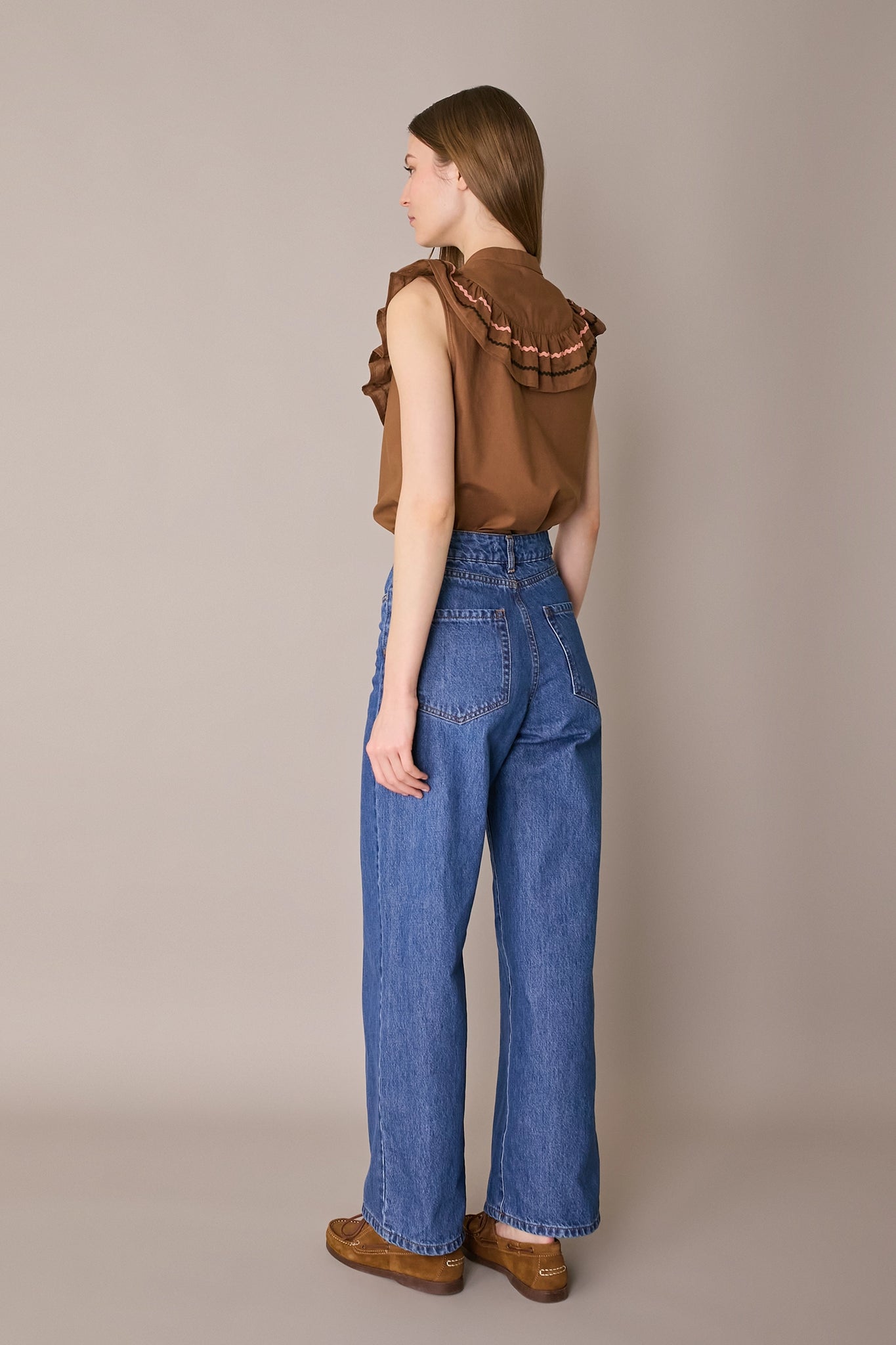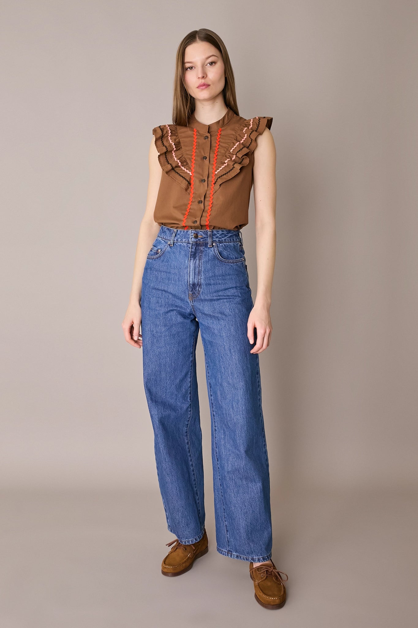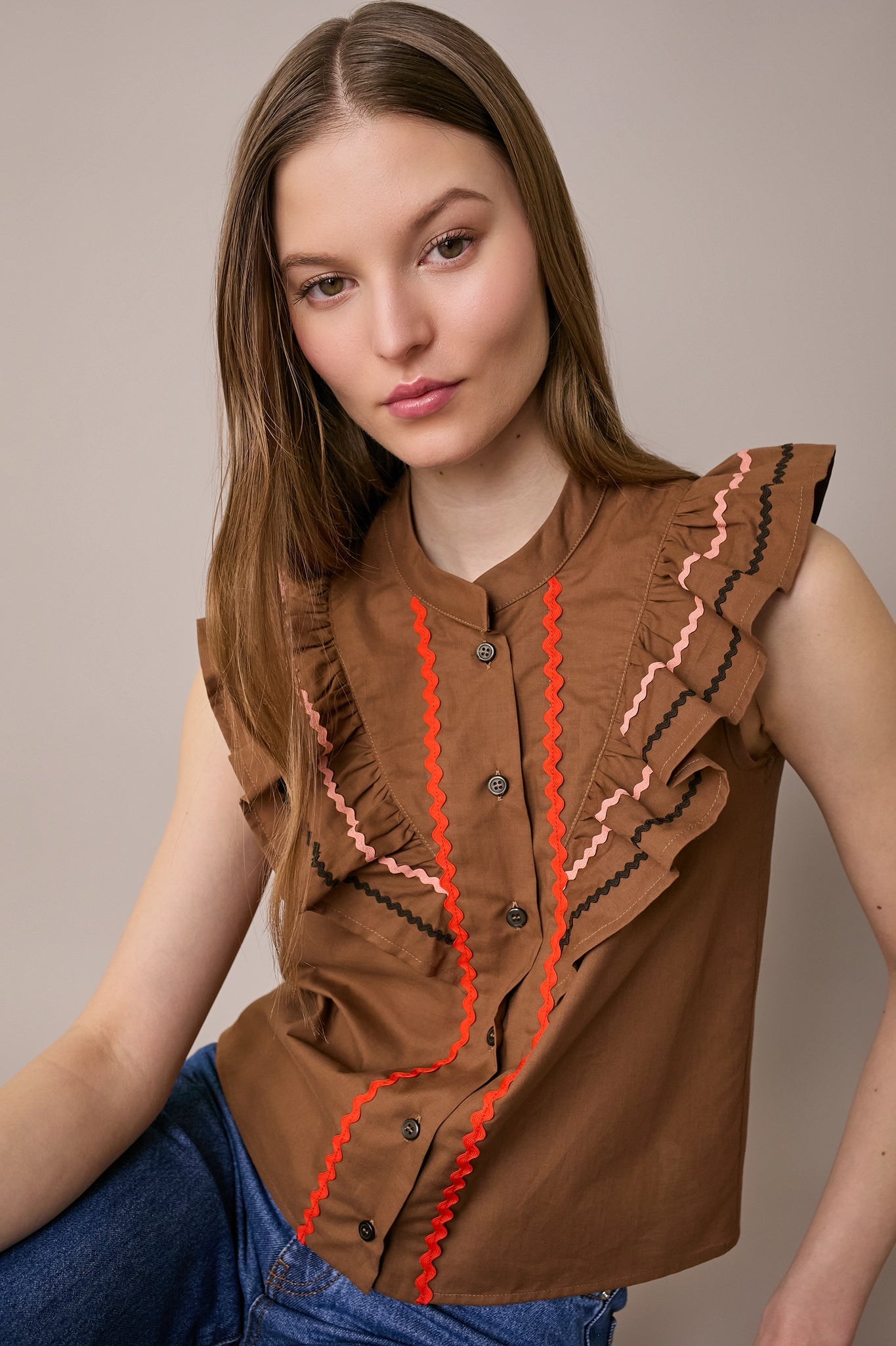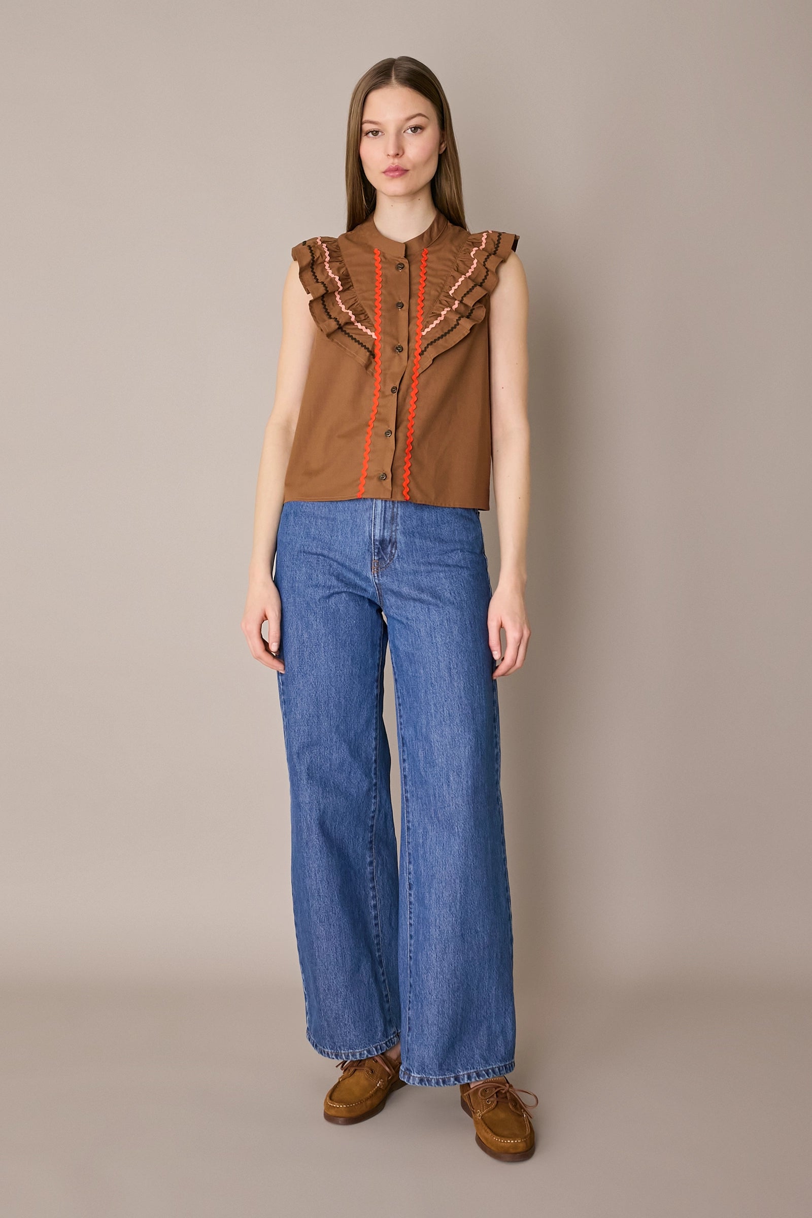 Per questa camicetta abbiamo scelto un cotone leggero, perfetto per l’estate, arricchito da passamanerie colorate. Indossala con un paio di pantaloni sartoriali in ufficio, oppure abbinala a un paio di shorts in denim quando la porterai in vacanza. Disponibile in biscotto.