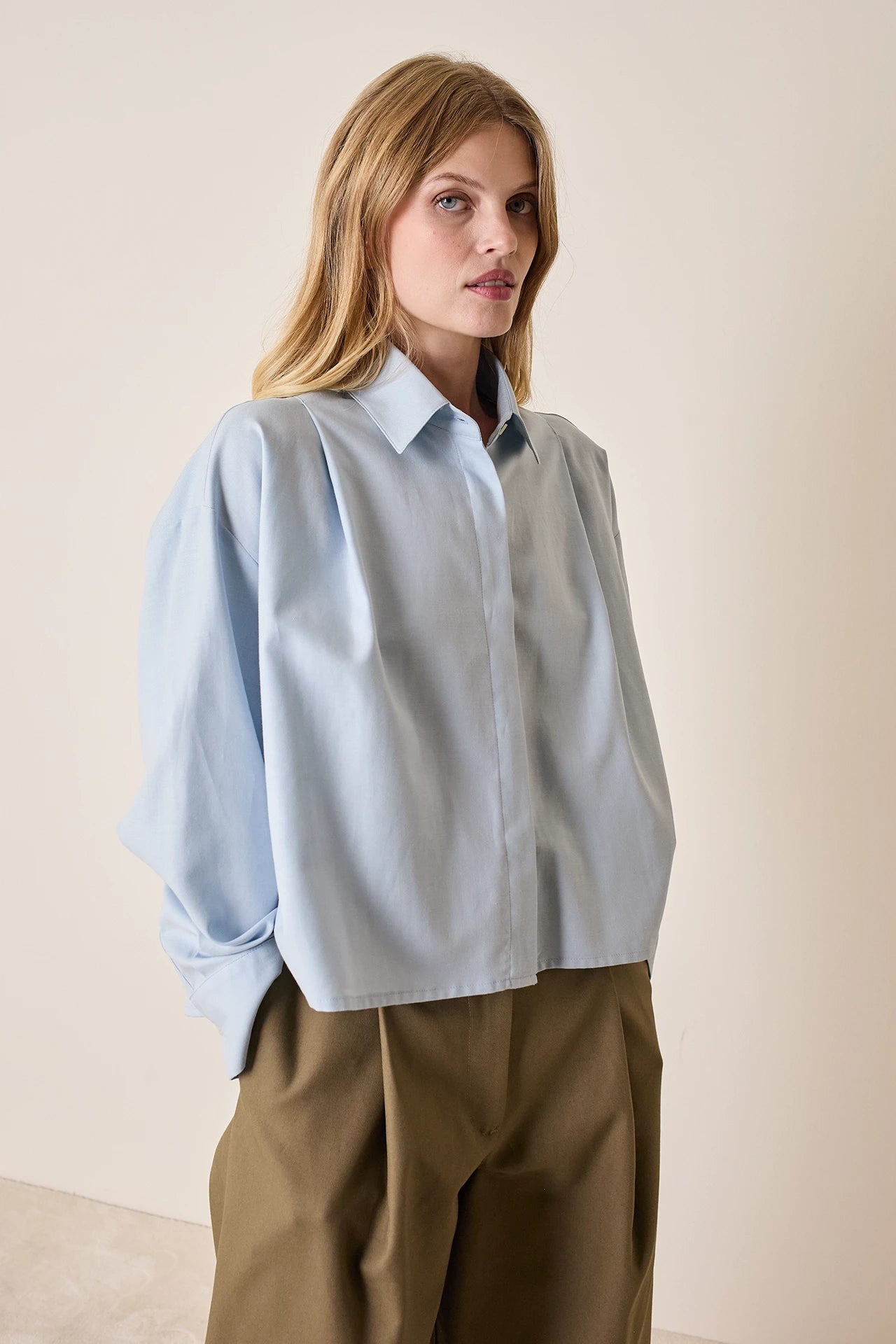 Questa camicia è caratterizzata da un taglio boxy a scatolina e dettagli a pieghe sul davanti, per un look più strutturato. Disponibile in bianco o azzurro.