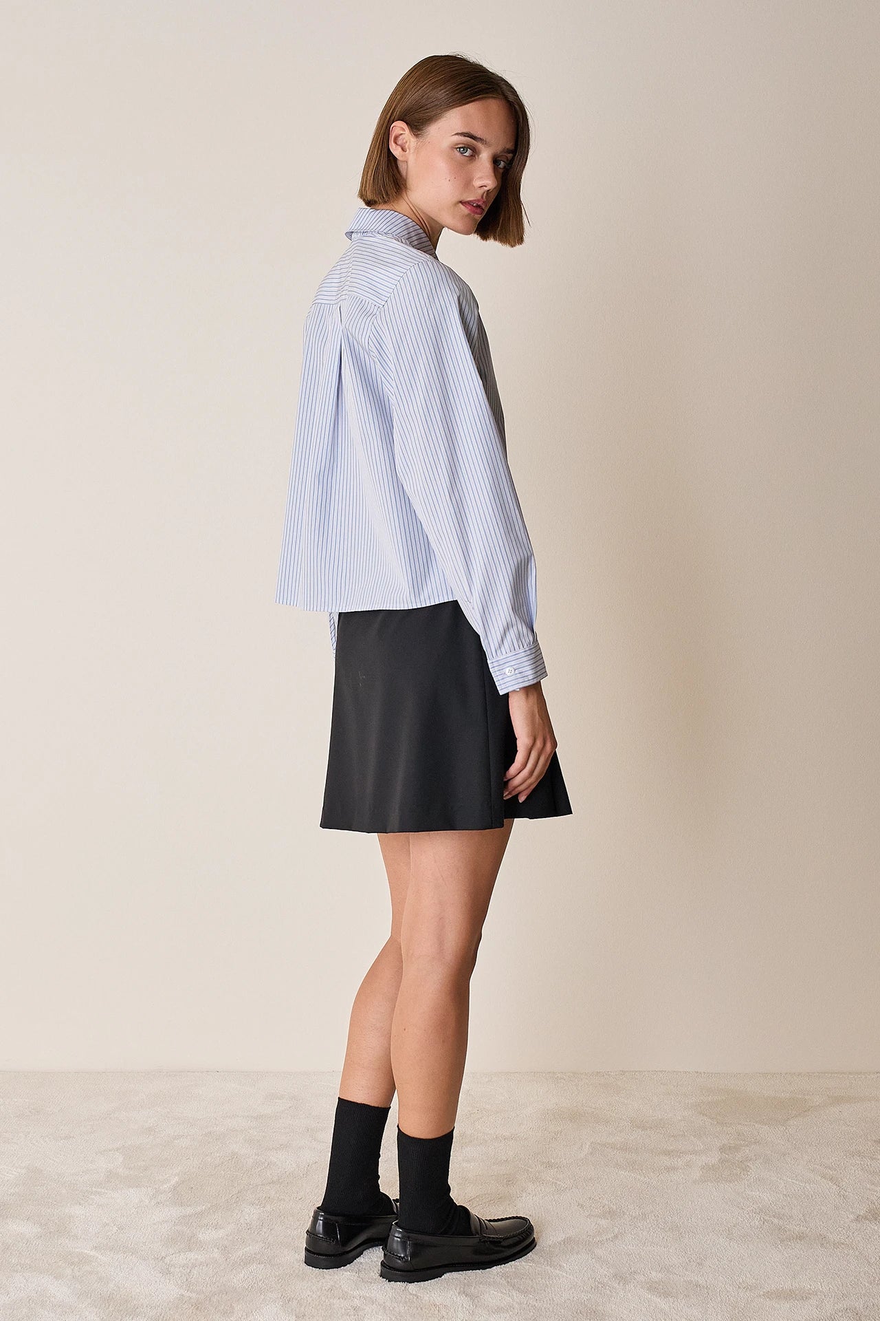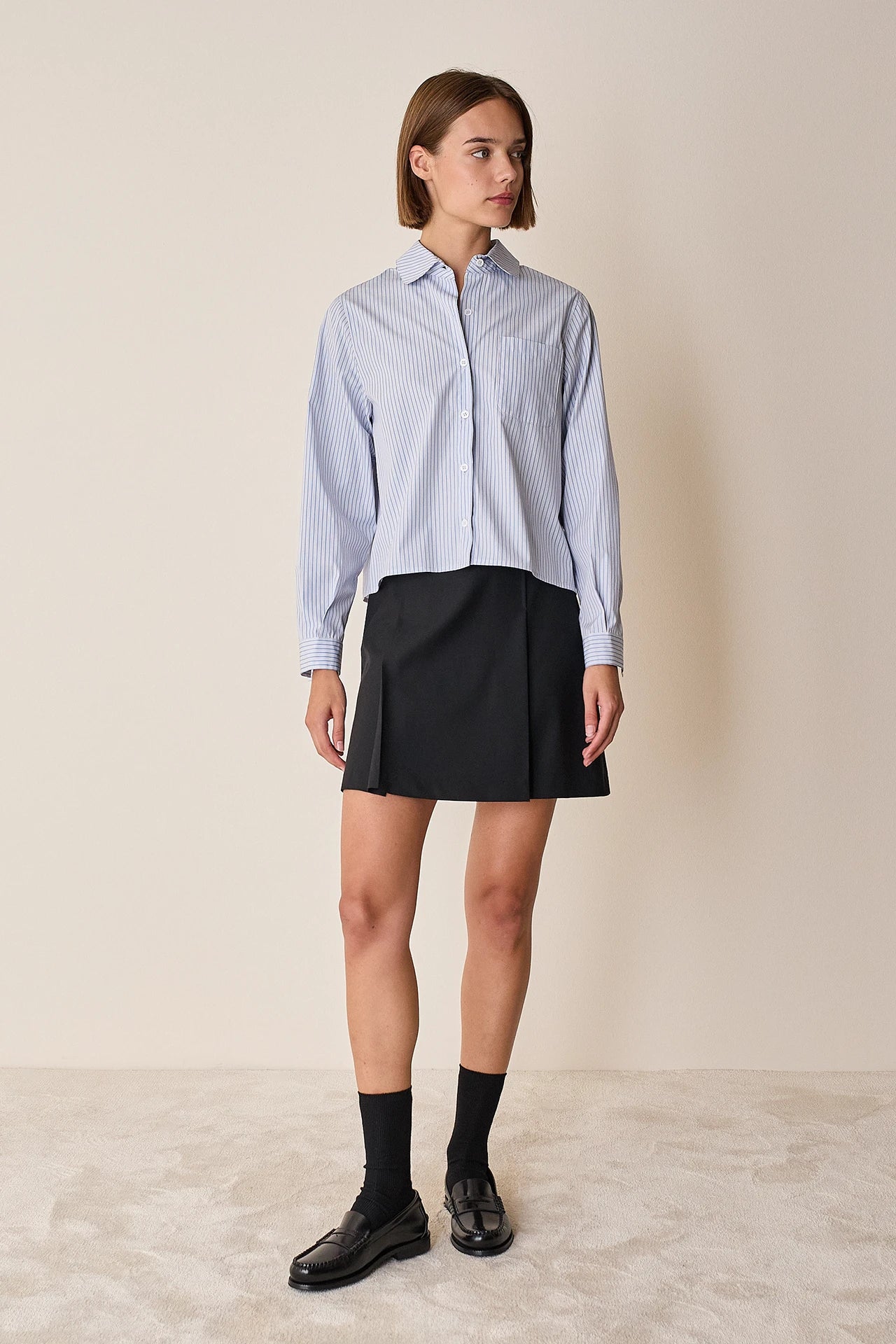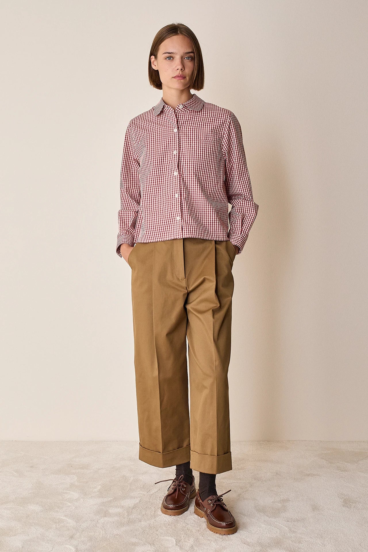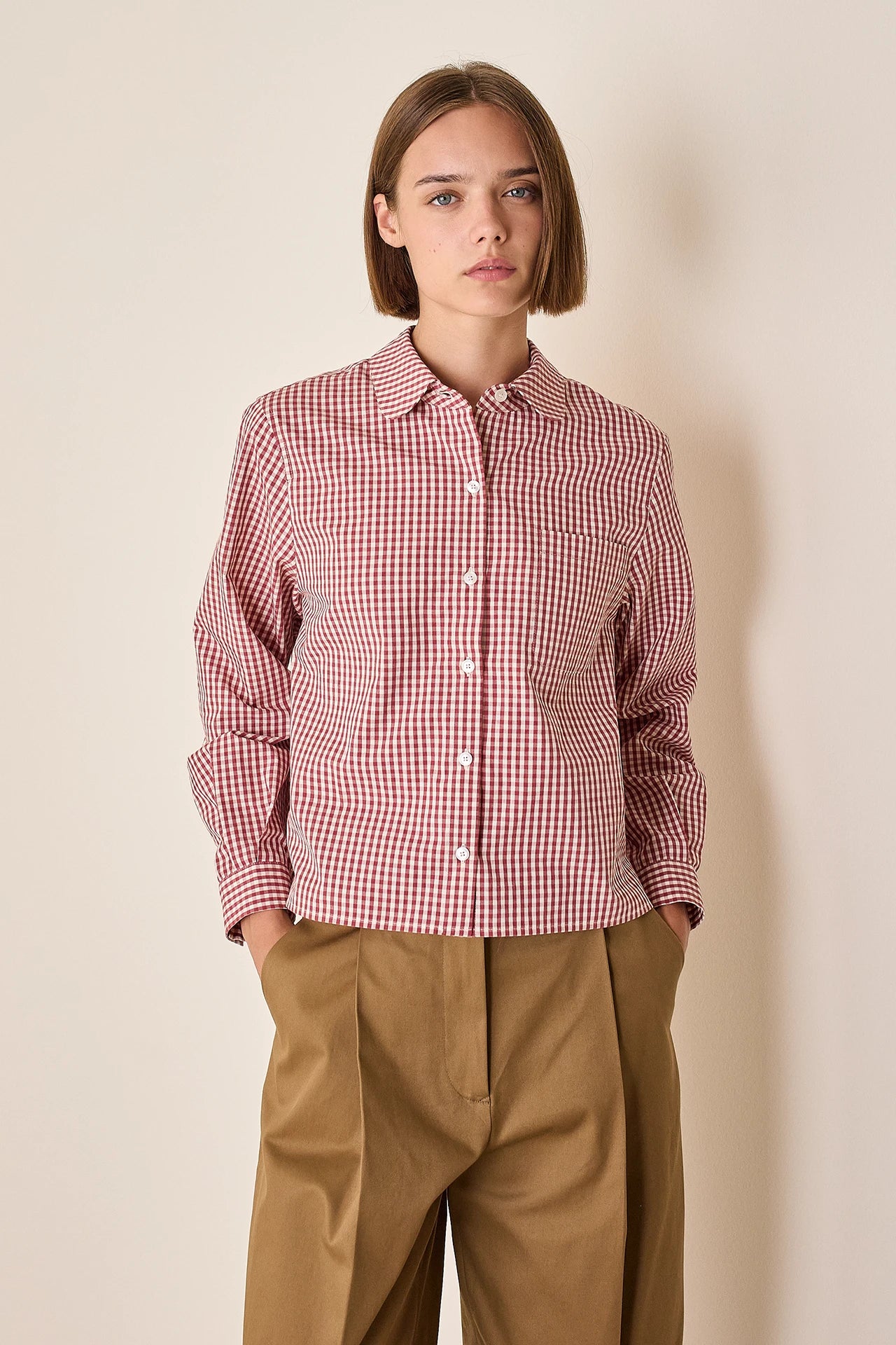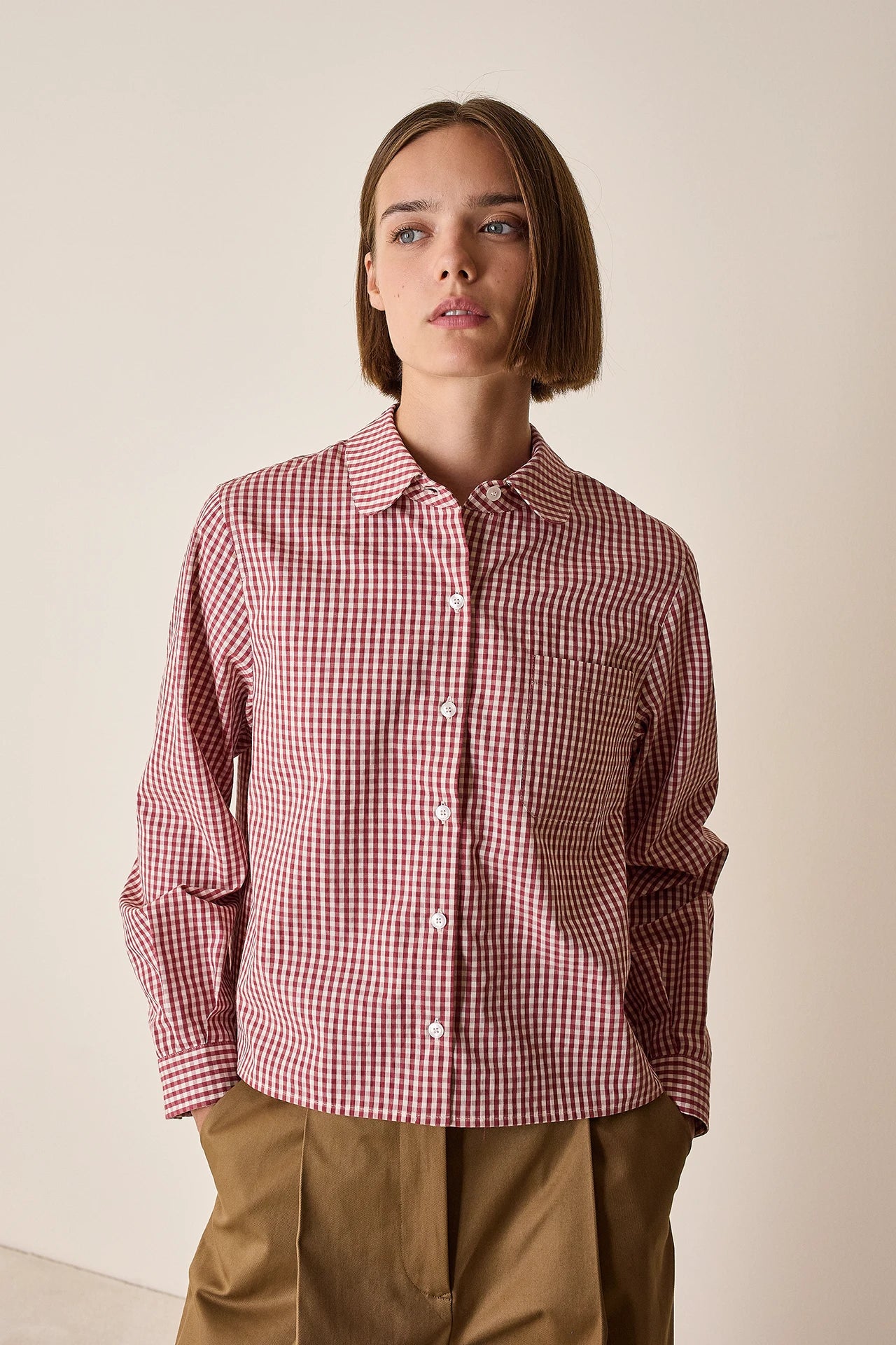 Questa camicia ha un taglio dritto e leggermente boxy che la rende perfetta sia con i pantaloni che con le gonne. Caratterizzata dal colletto stondatome realizzata in puro cotone, è disponibile in fantasia vichy rossa o in fantasia a righine azzurre.