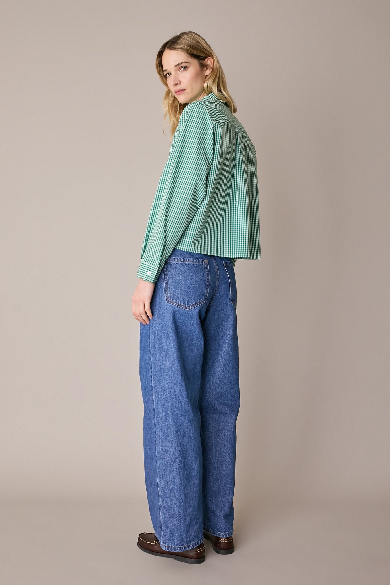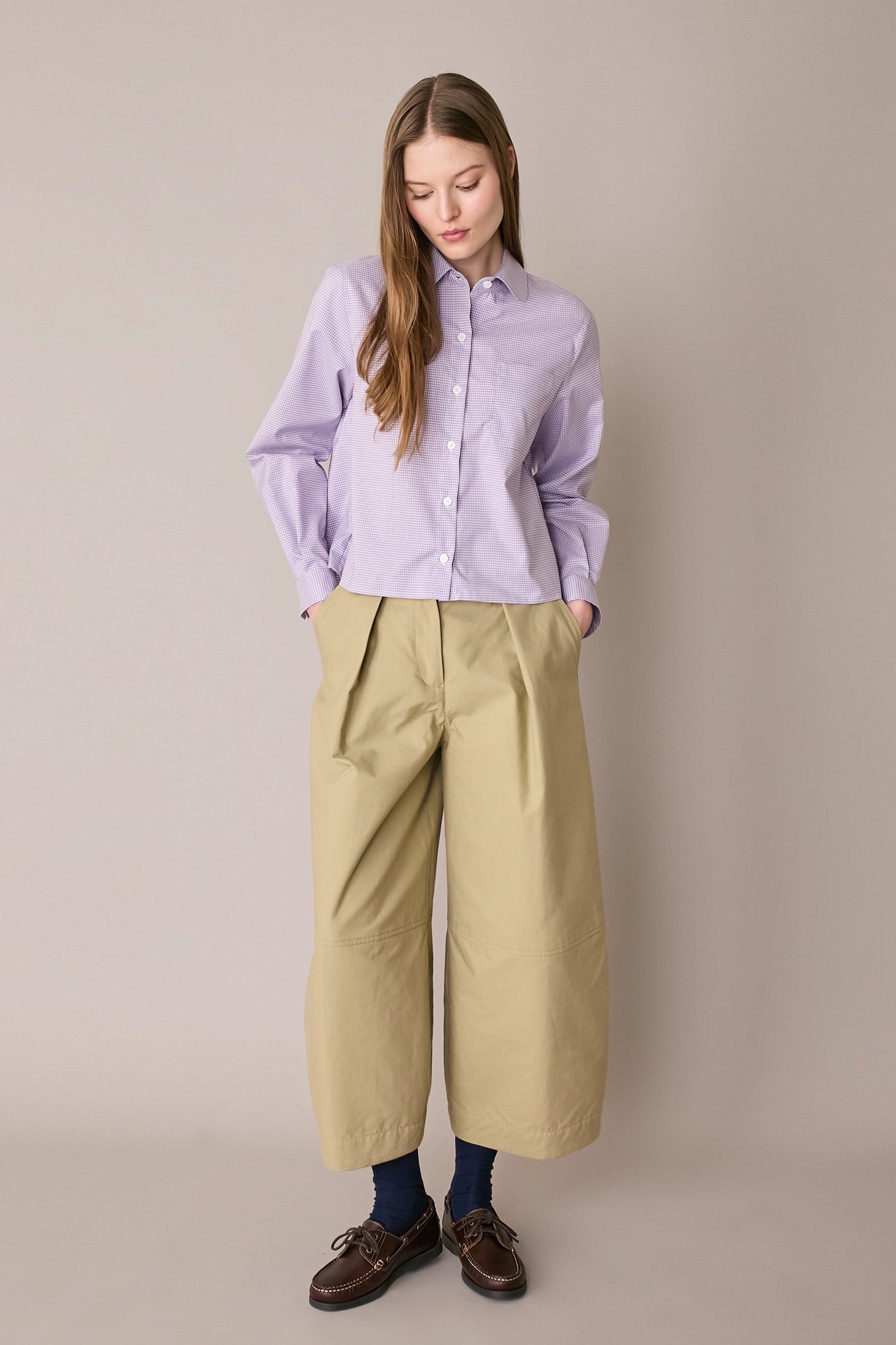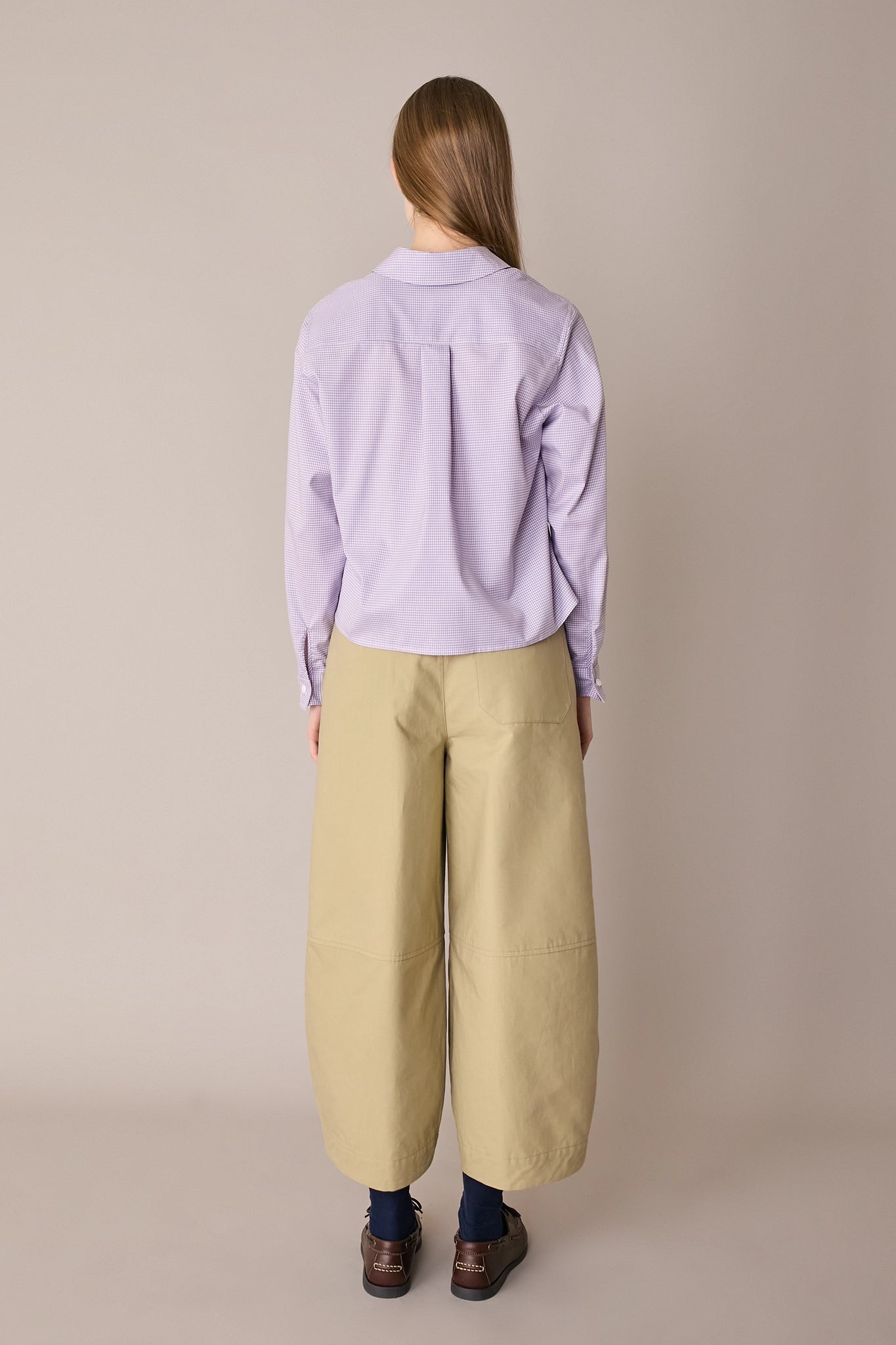 Questa camicia in cotone è caratterizzata da un colletto stondato. Semplice e versatile, è perfetta anche per l’ufficio. Disponibile in due varianti a quadretti: lilla o verdi.