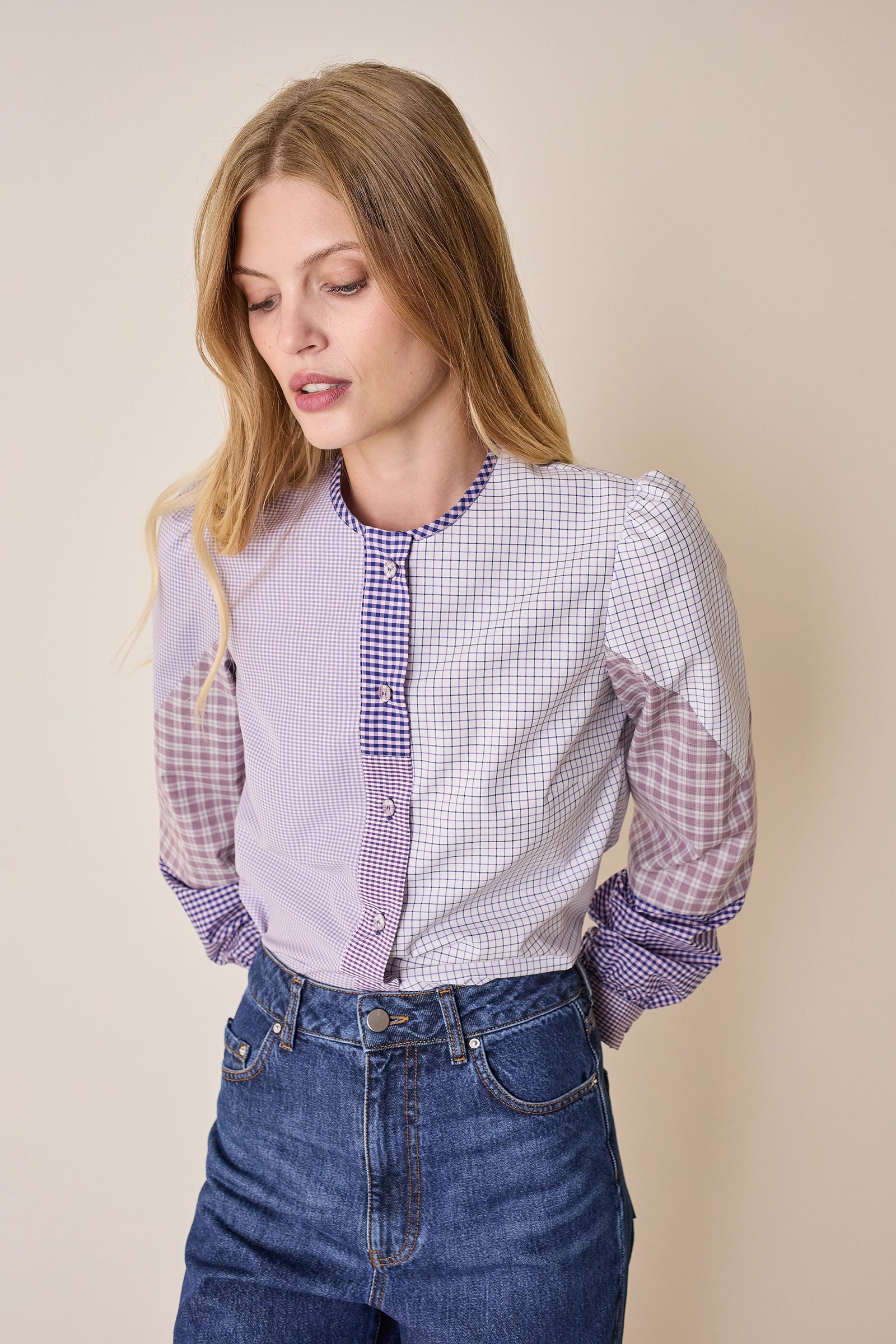 Su questa camicia patchwork si incontrano tessuti di camiceria in fantasie diverse, scelti per portare un po' di colore anche alle giornate in ufficio. Questa camicia paricollo è caratterizzato da maniche leggermente a palloncino e da bottoncini rivestiti.