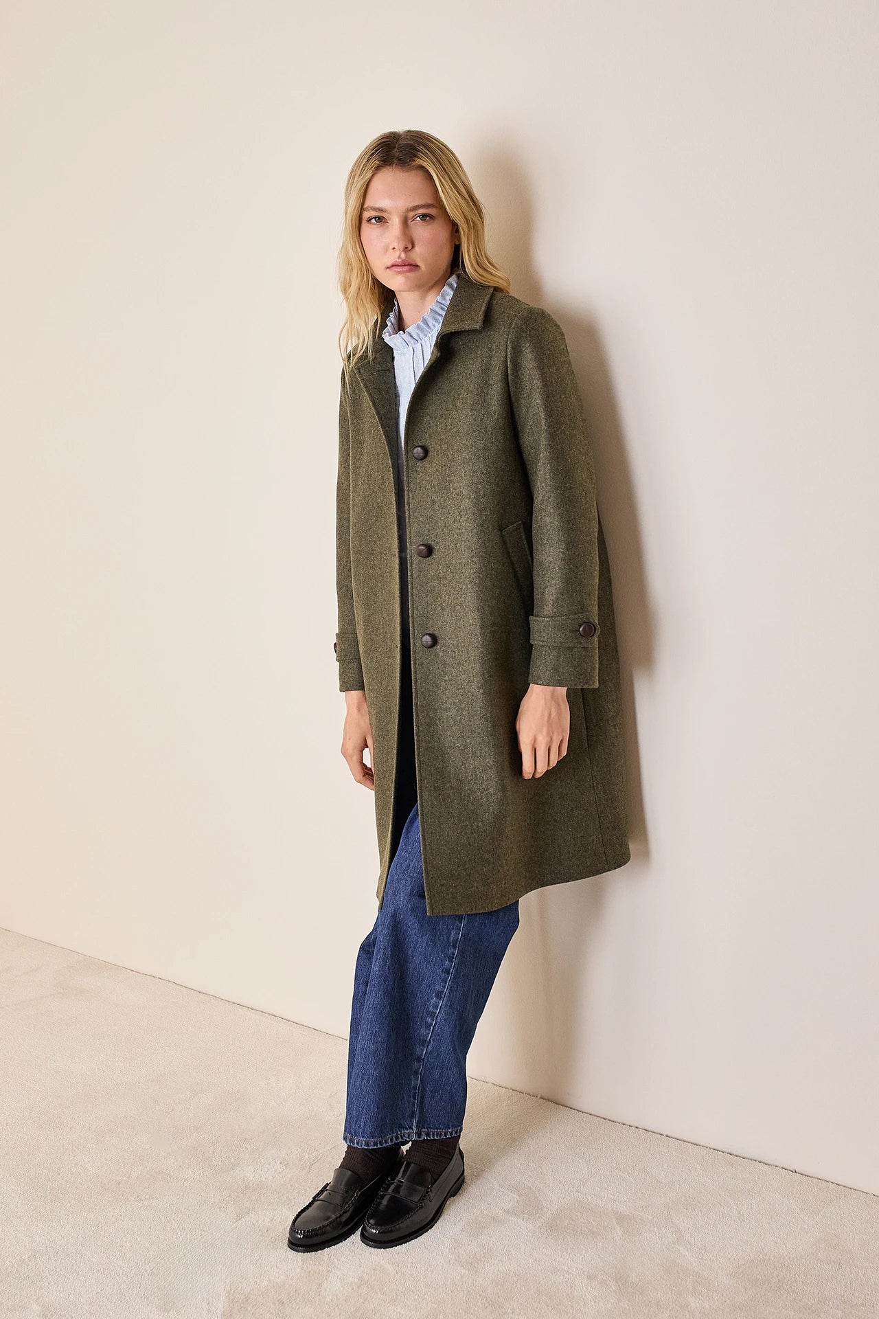 Questo cappotto è ispirato all'intramontabile loden. La linea è semplice e dritta, il colletto strutturato, i bottoni classici. Realizzato in una calda lana vergine, è disponibile in verde mélange.