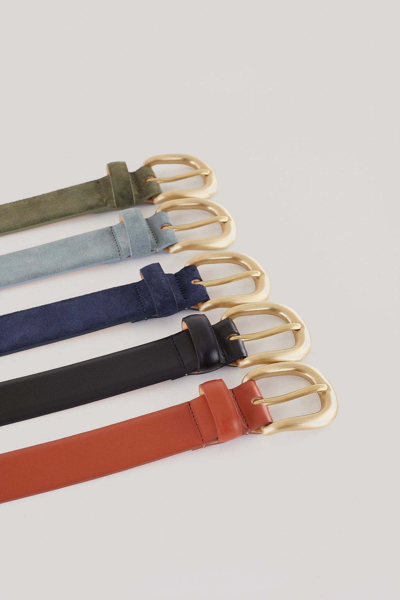 Una new entry nella nostra collezione di cinture. Per questa cintura classica in pelle abbiamo scelto una fibbia a mezzaluna. Disponibile in pelle liscia nera, cuoio, testa di moro o in pelle scamosciata cielo, verde o blu.