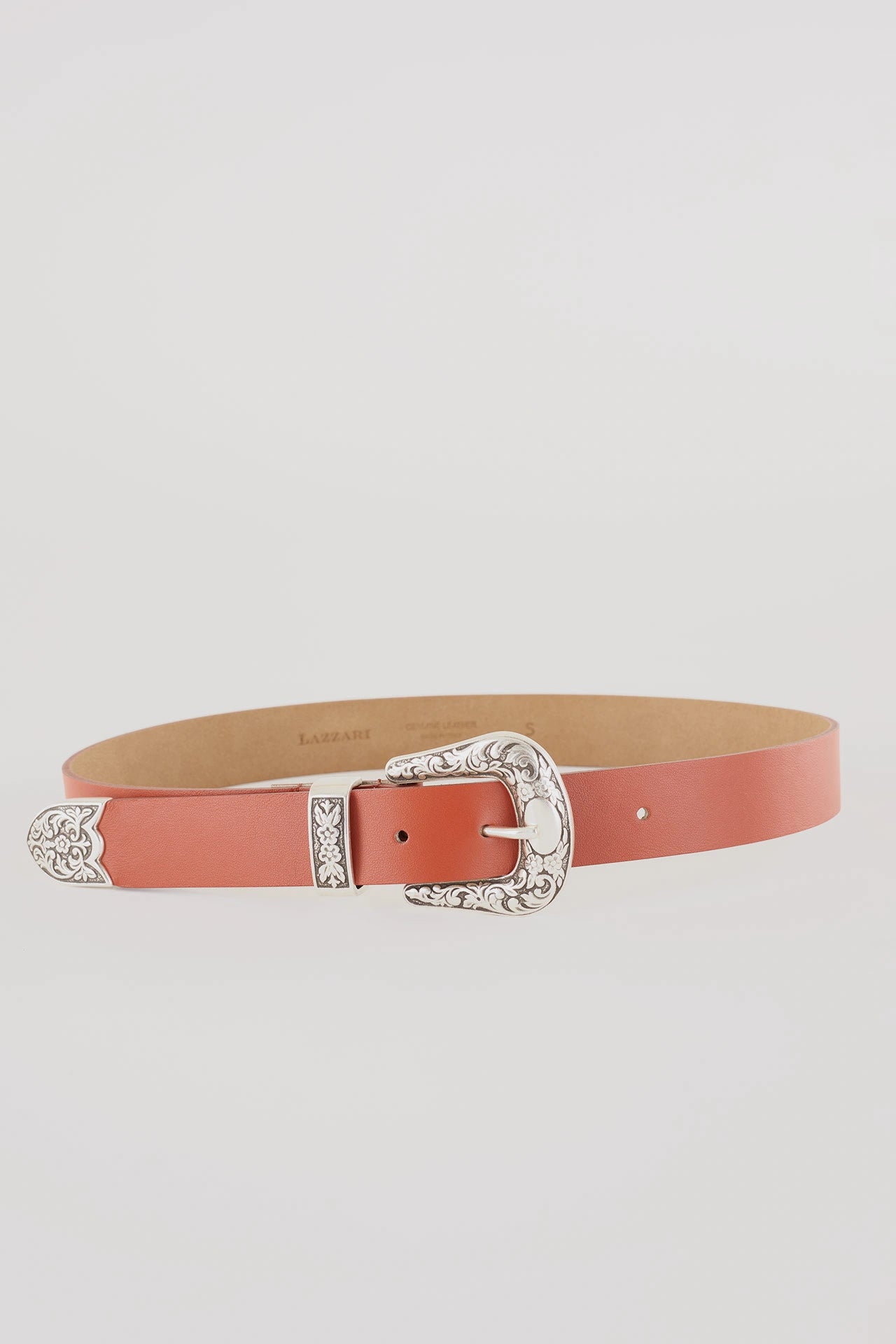 Questa cintura in pelle, di ispirazione wrangler, è caratterizzata dalla fibbia decorata.