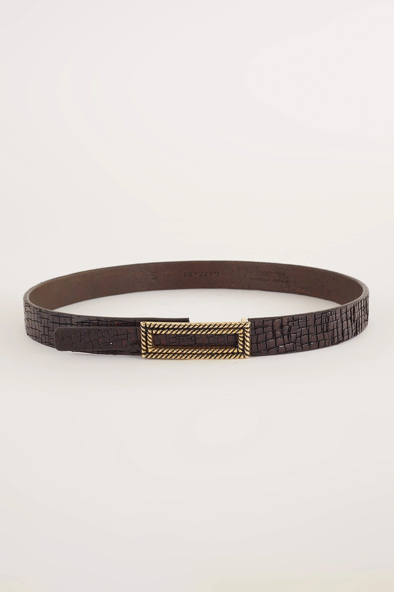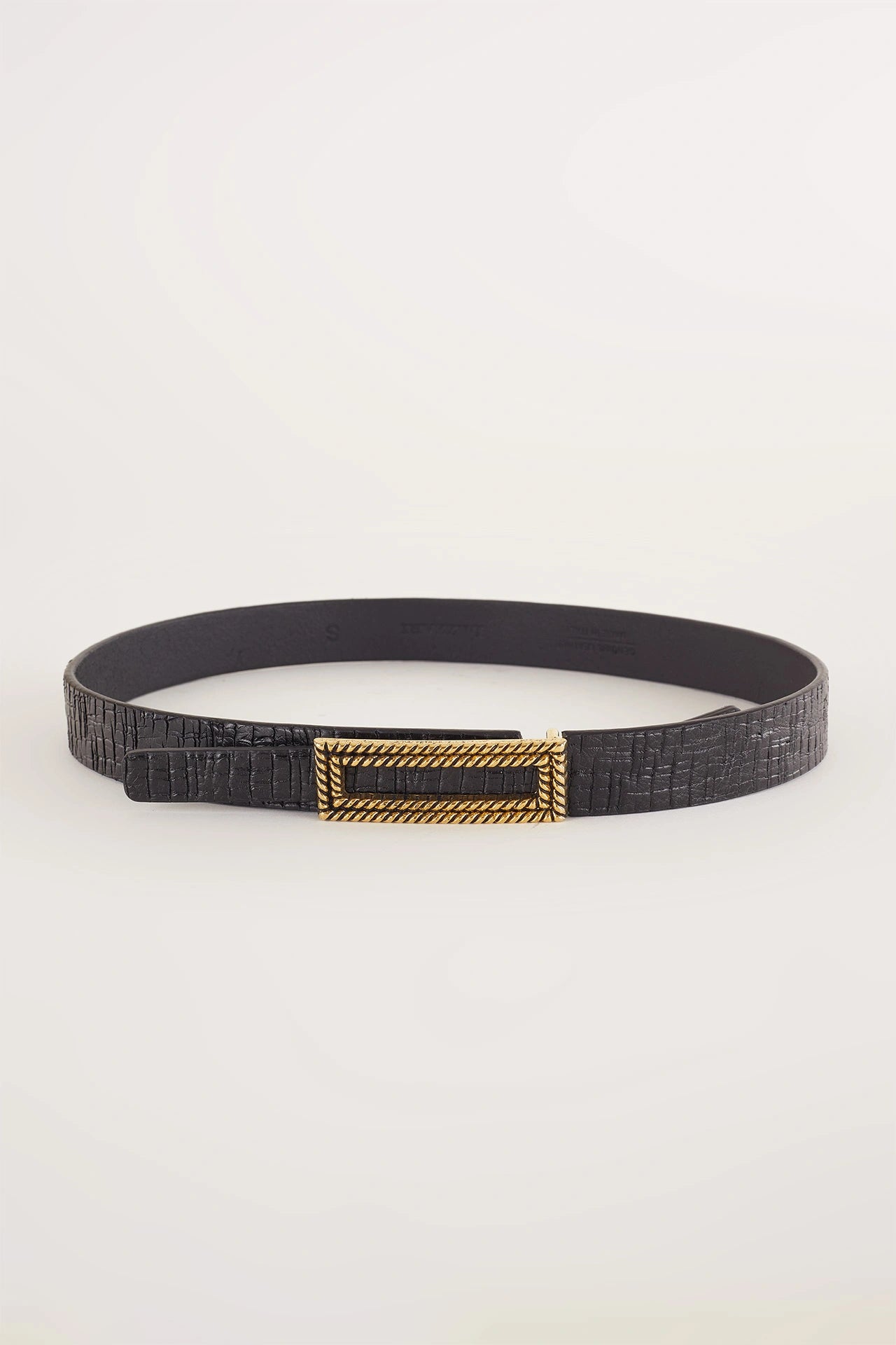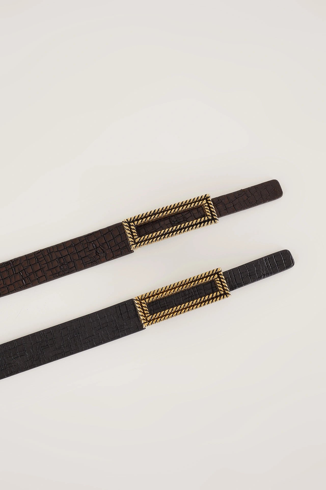 Questa cintura in pelle stampata effetto coccodrillo è caratterizzata da una cintura rètro rettangolare. Disponibile in nero o testa di moro.