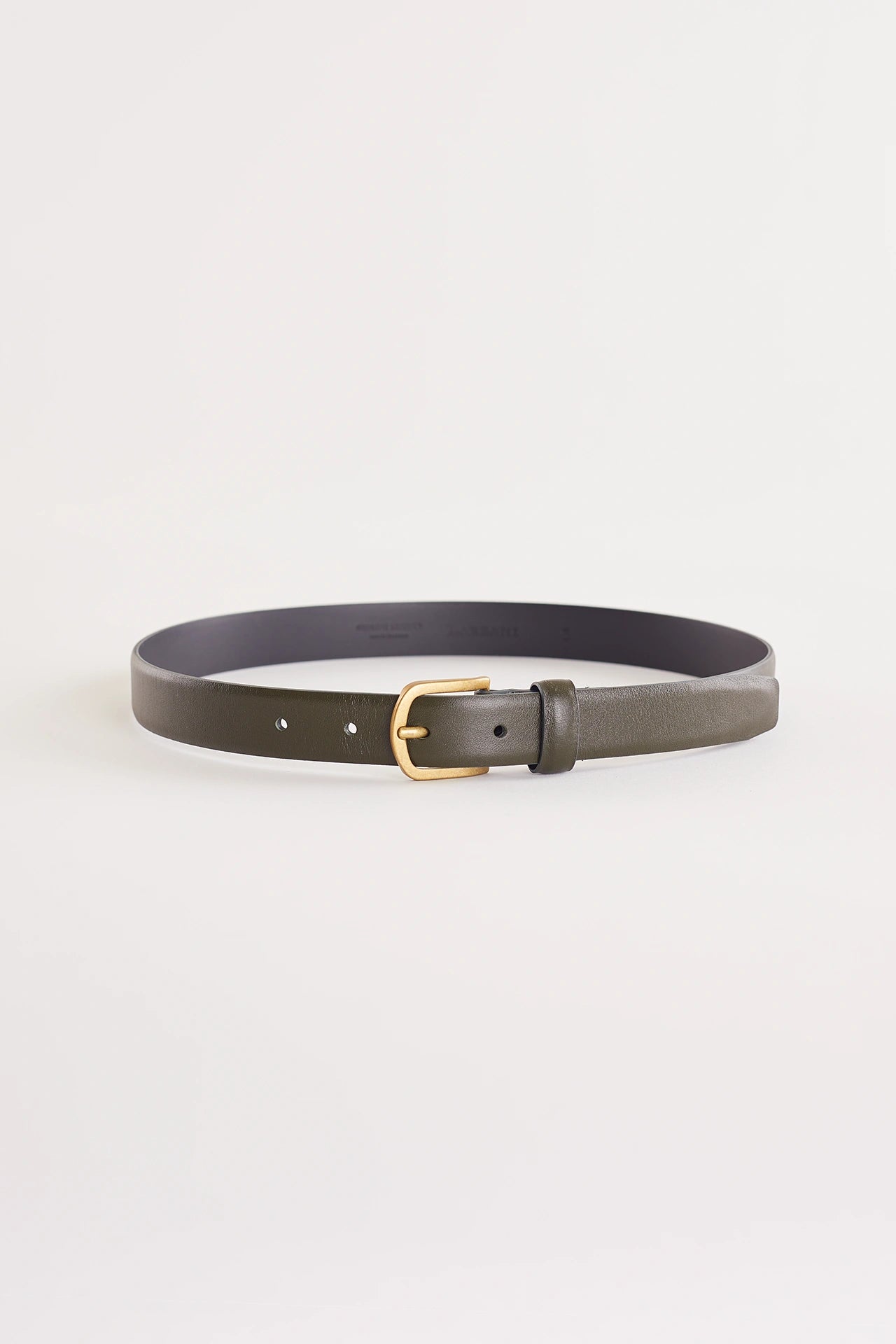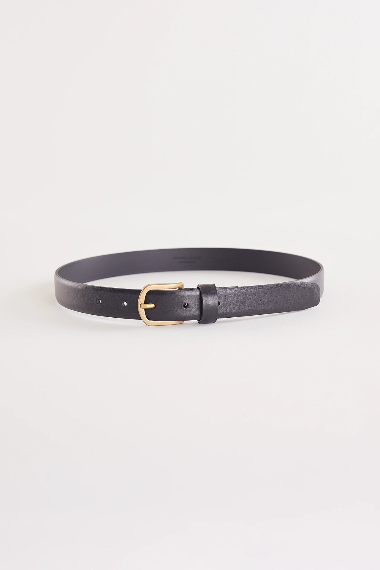 Questa cintura in pelle di ispirazione rètro è caratterizzata dalla fibbia rettangolare dorata.