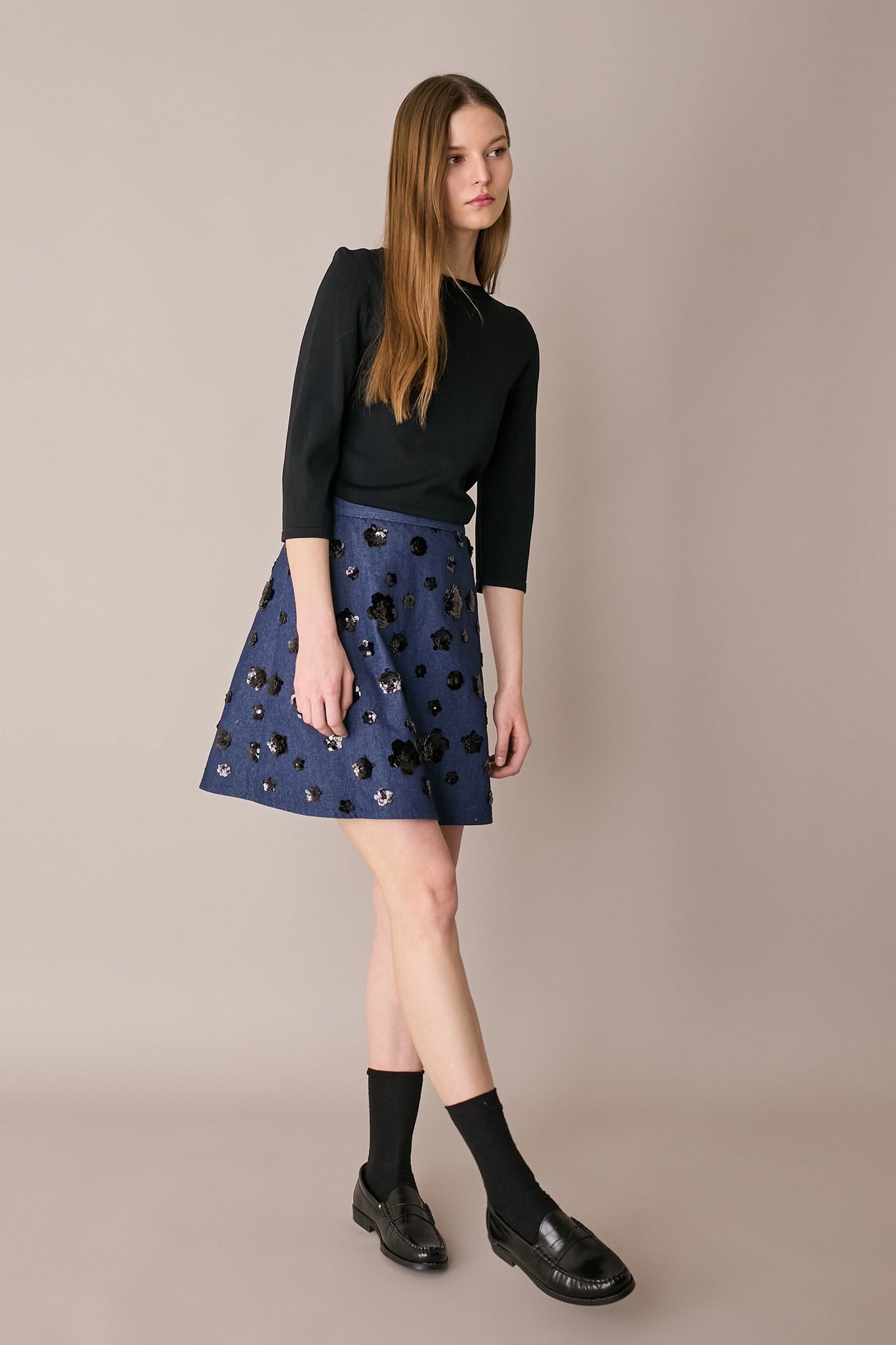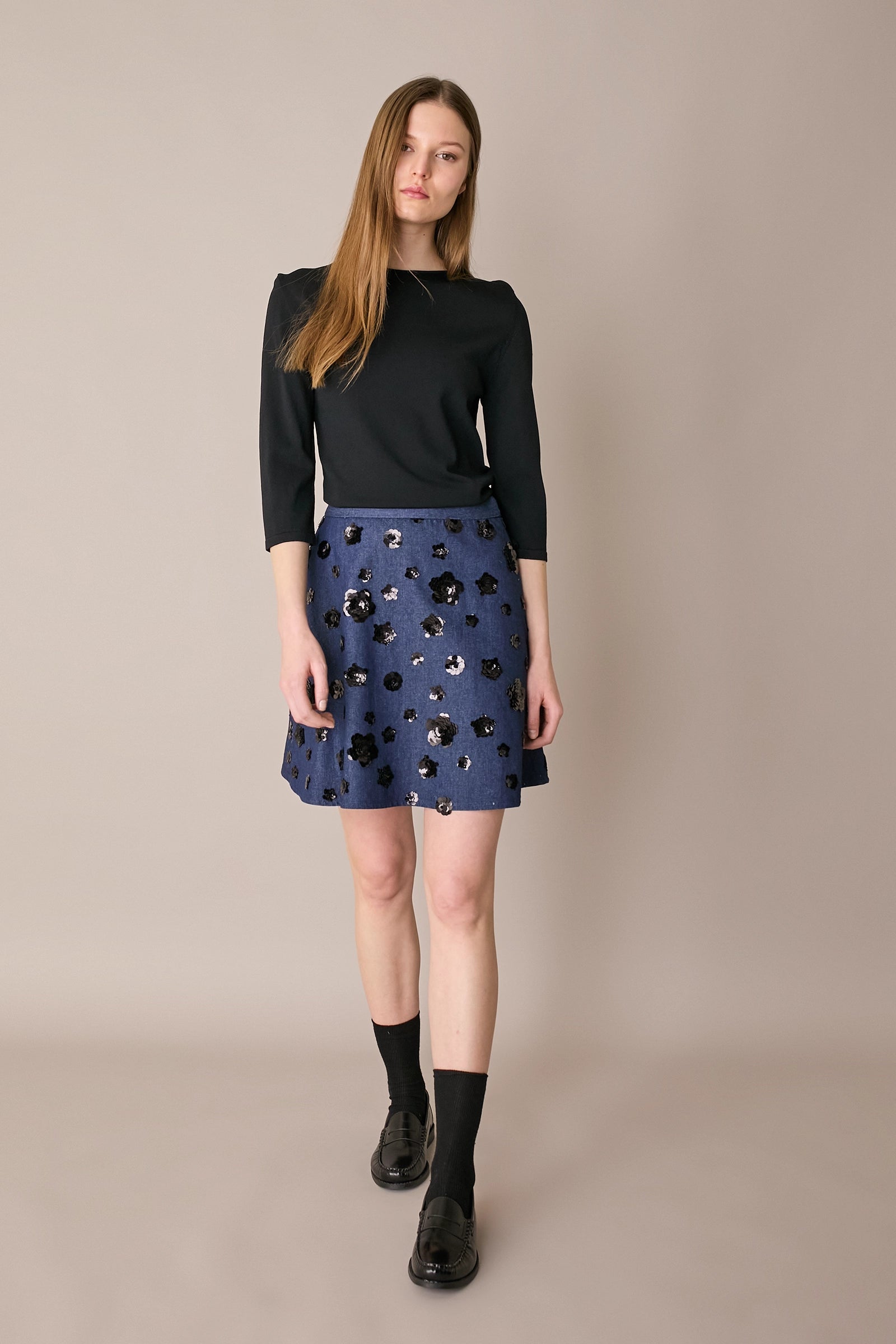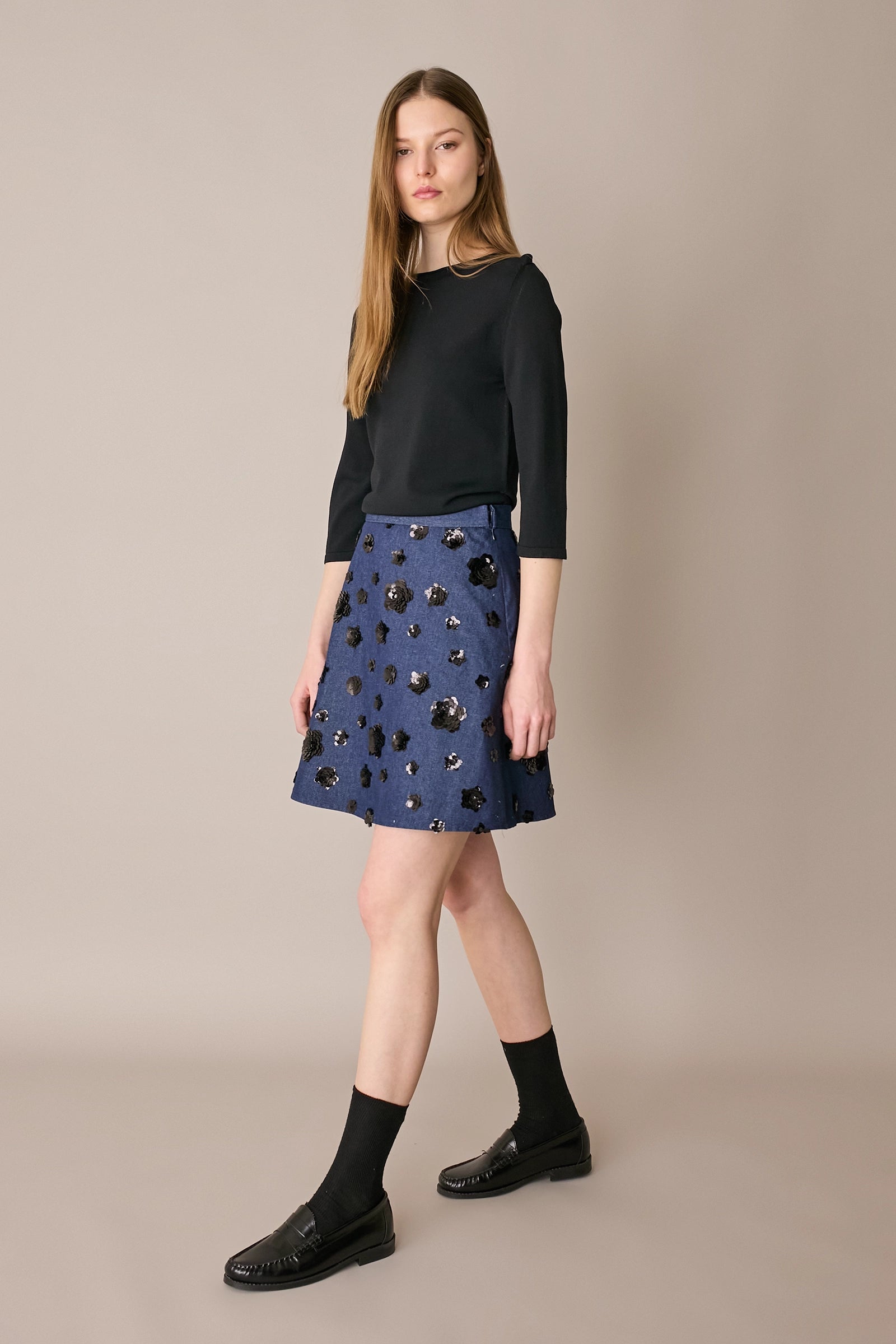 Questa gonna in denim con fiori ricamati in paillettes è la nostra risposta alle giornate grigie che non promettono nulla di speciale. Realizzata in un pratico denim, è disponibile in un’unica variante con fiori neri su base blu.
