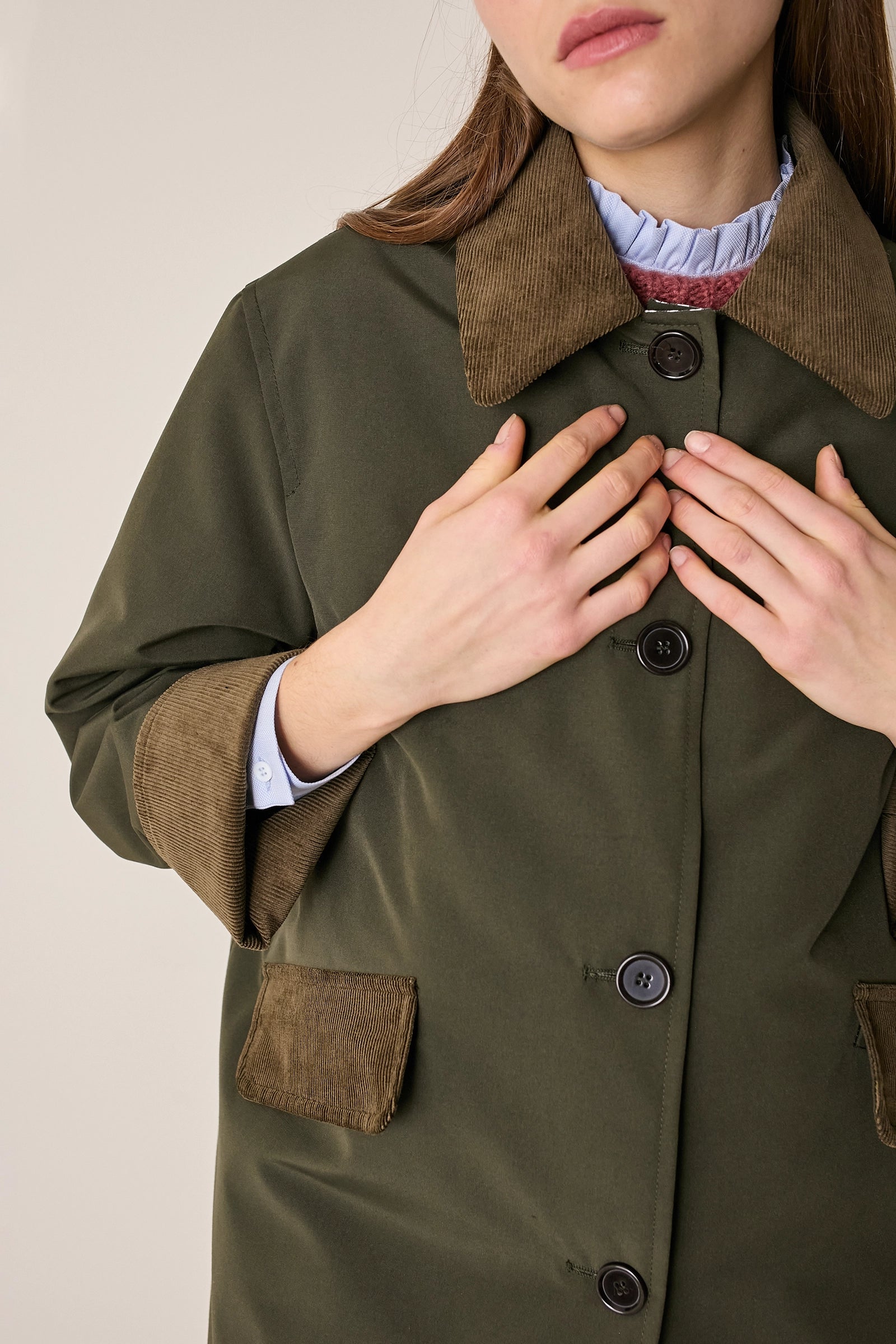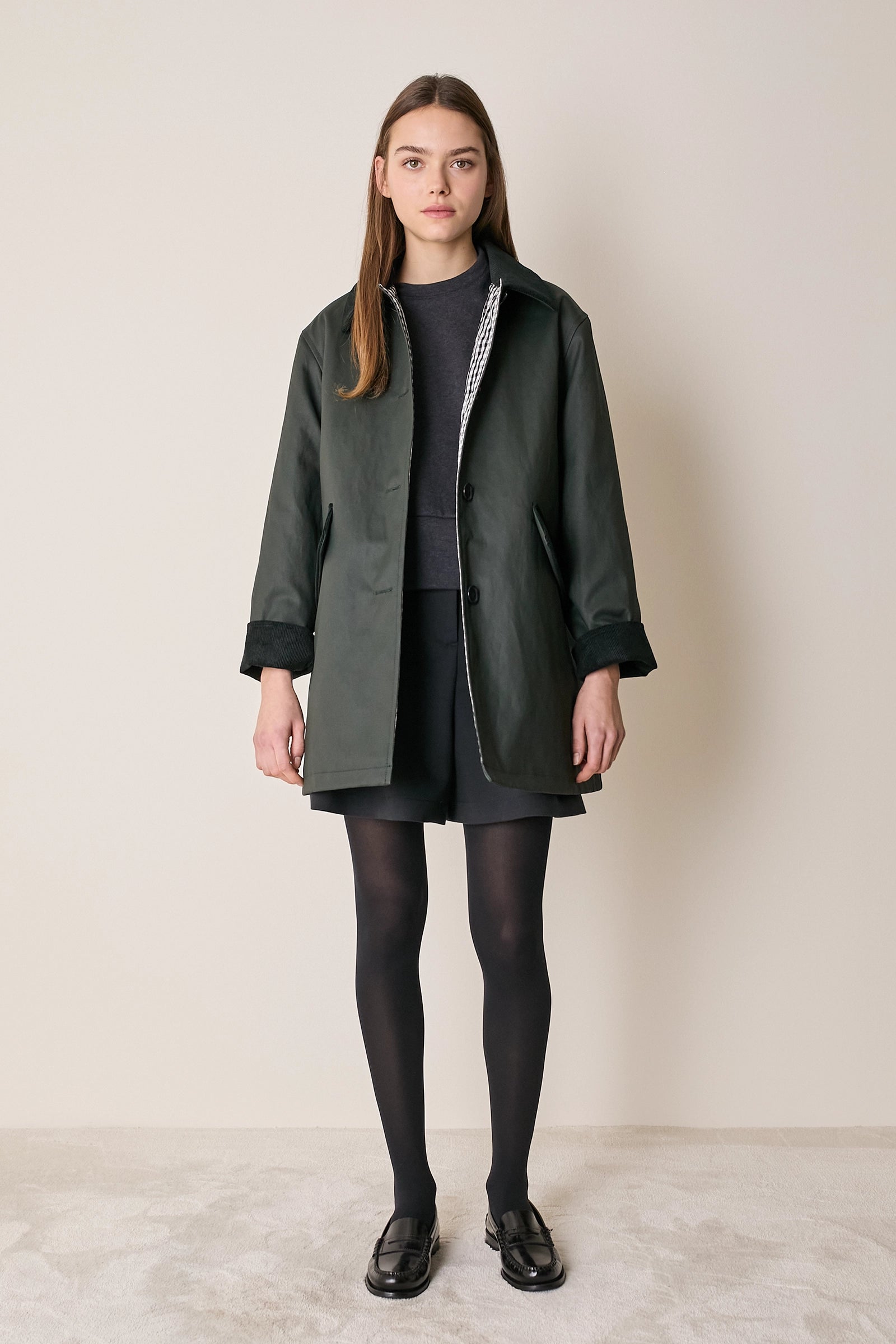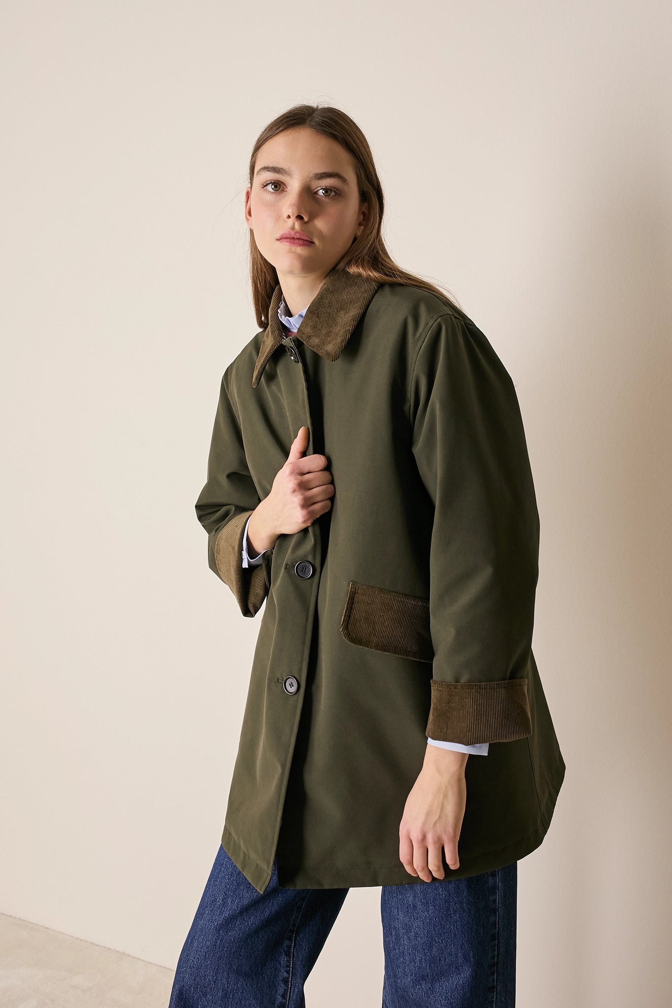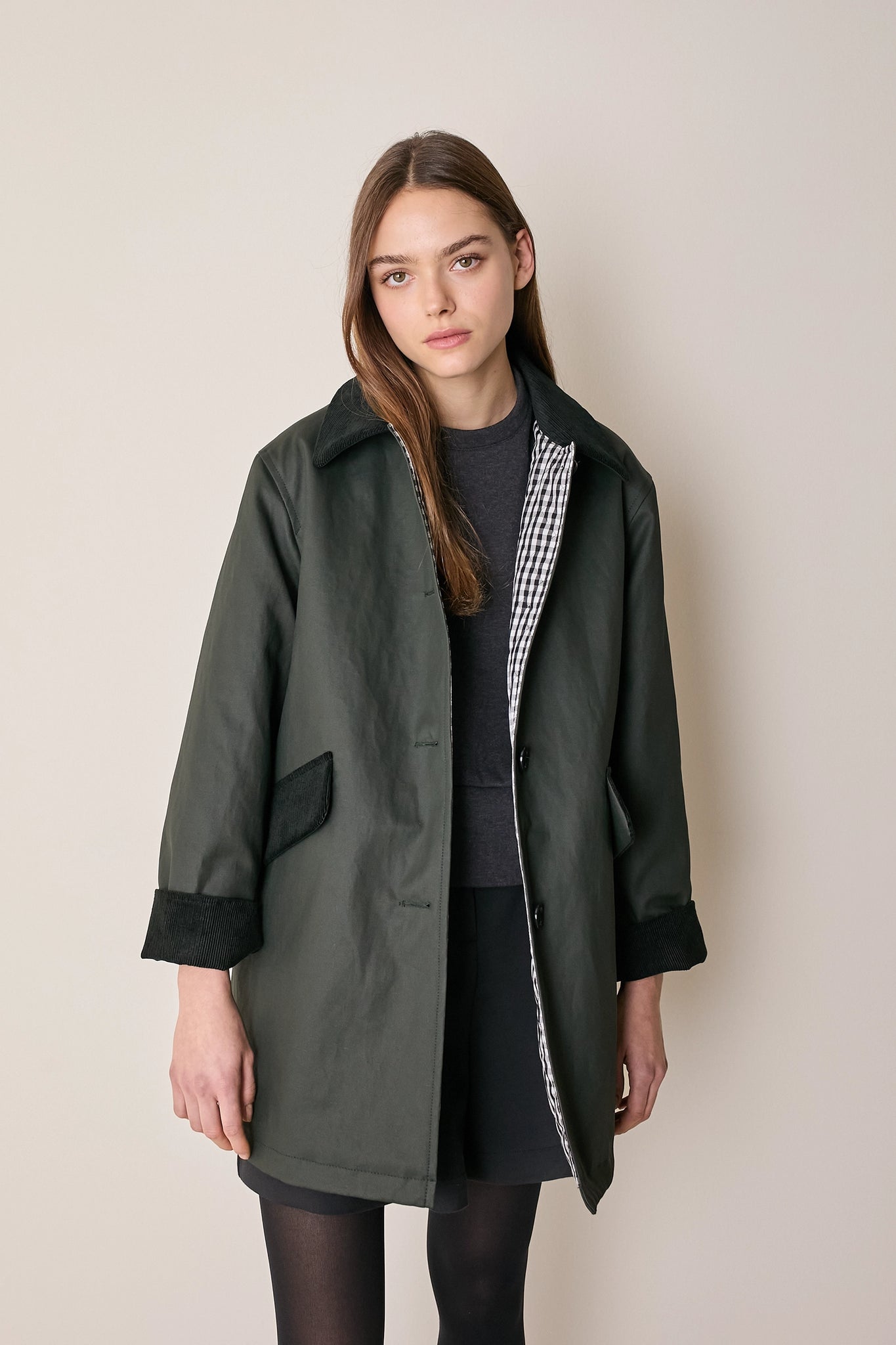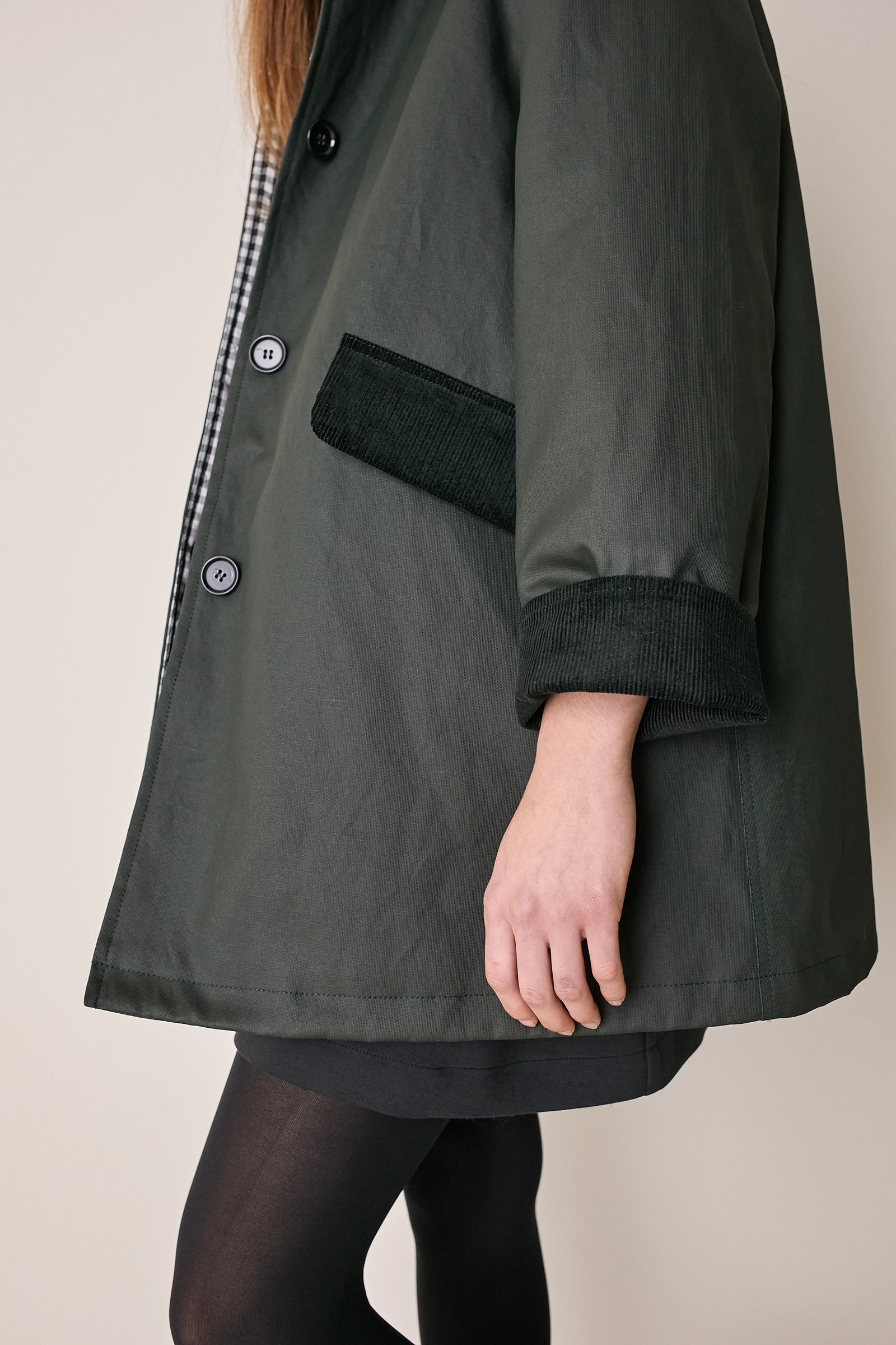 L'attenzione ai dettagli che poniamo nei nostri capi non si ferma solo agli aspetti estetici – come il colletto in velluto a contrasto o la fodera a quadretti – ma, soprattutto, nella scelta dei materiali. Per la trapuntatura di questo soprabito abbiamo optato per ovatta microvaltherm: un'ovatta speciale che, nonostante lo spessore ridotto, mantiene benissimo il calore. Per l'esterno invece abbiamo scelto un tessuto in cotone. Nella variante verdone il tessuto esterno, 100% cotone, è particolarmente sostenuto e leggermente resinato. Adatto per l'autunno – indossato con una camicia - questo soprabito sarà perfetto anche in inverno, sopra a un maglioncino in lana.