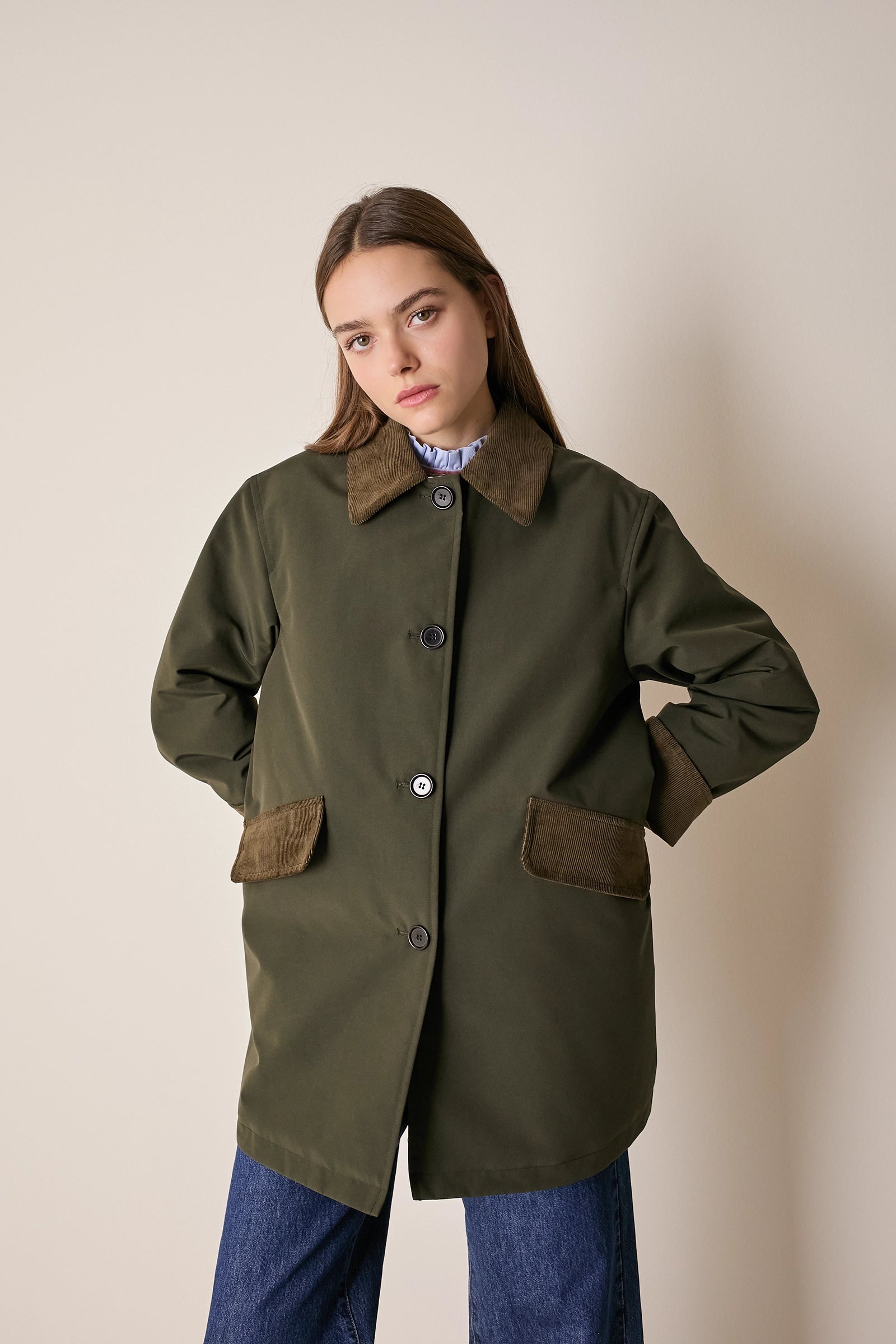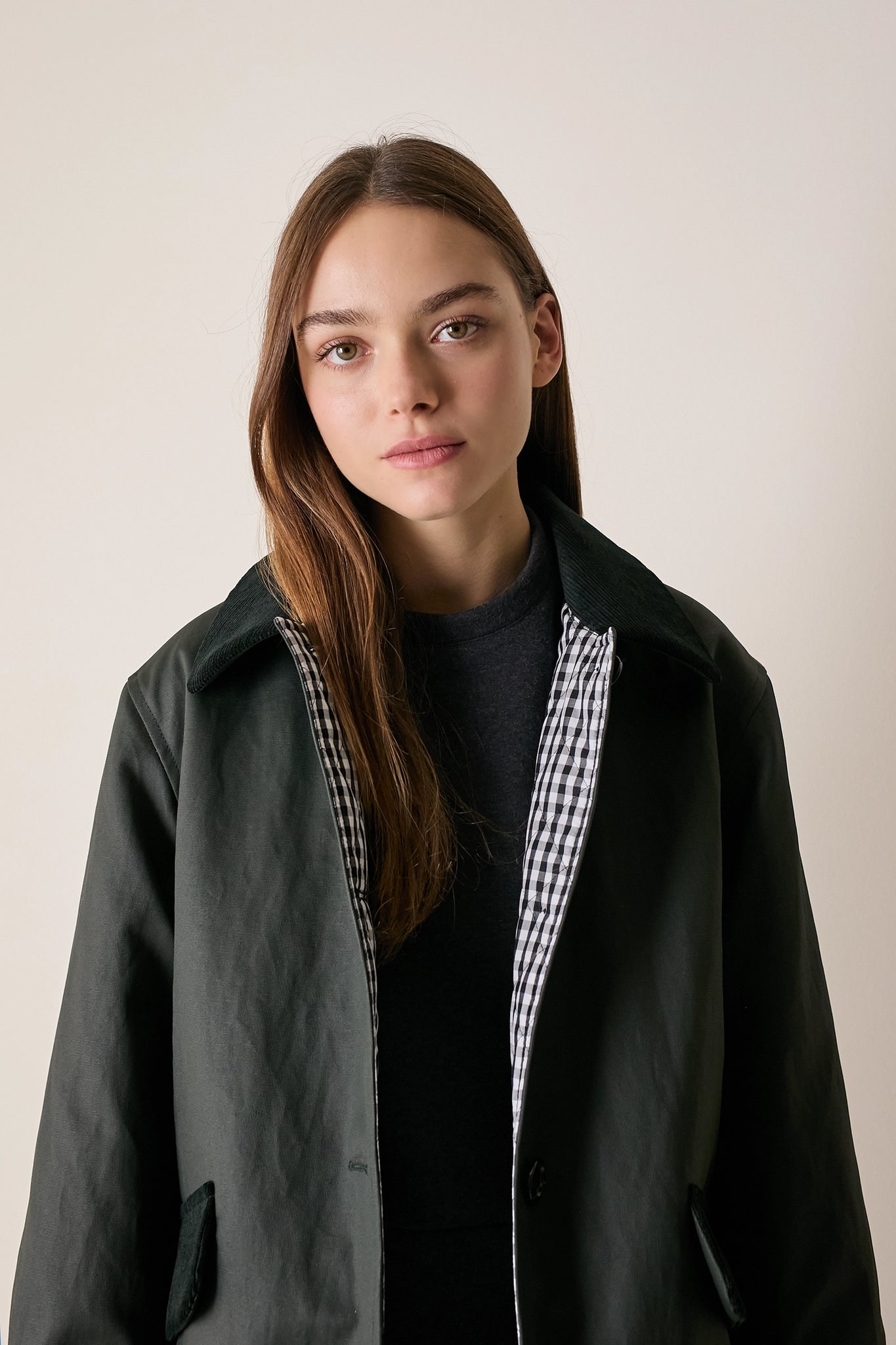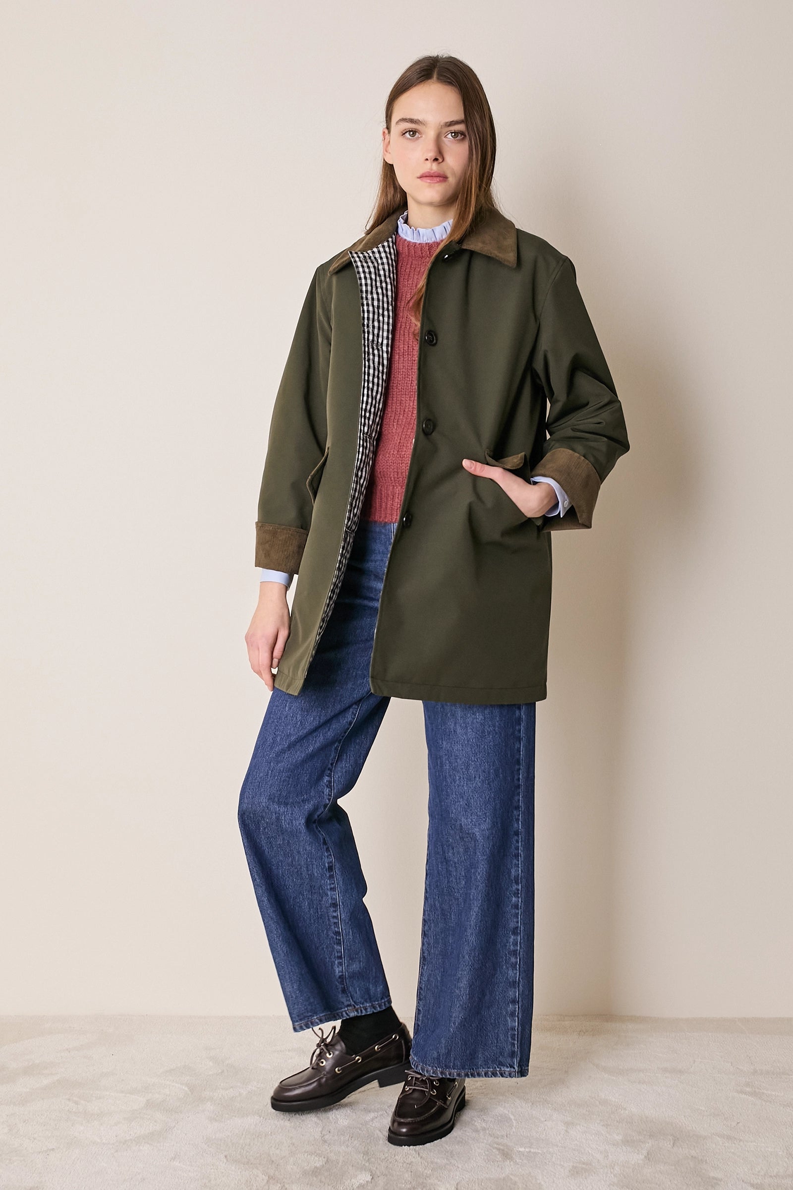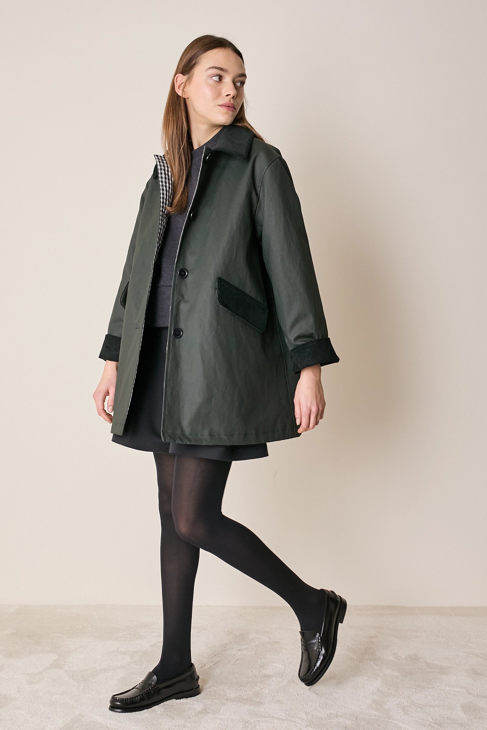 L'attenzione ai dettagli che poniamo nei nostri capi non si ferma solo agli aspetti estetici – come il colletto in velluto a contrasto o la fodera a quadretti – ma, soprattutto, nella scelta dei materiali. Per la trapuntatura di questo soprabito abbiamo optato per ovatta microvaltherm: un'ovatta speciale che, nonostante lo spessore ridotto, mantiene benissimo il calore. Per l'esterno invece abbiamo scelto un tessuto in cotone. Nella variante verdone il tessuto esterno, 100% cotone, è particolarmente sostenuto e leggermente resinato. Adatto per l'autunno – indossato con una camicia - questo soprabito sarà perfetto anche in inverno, sopra a un maglioncino in lana.