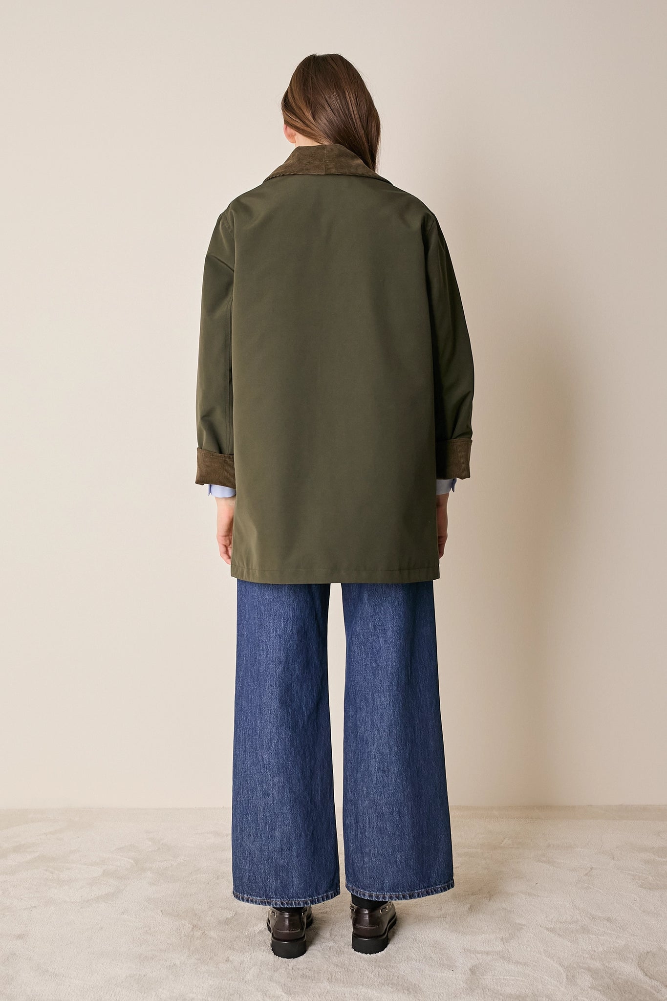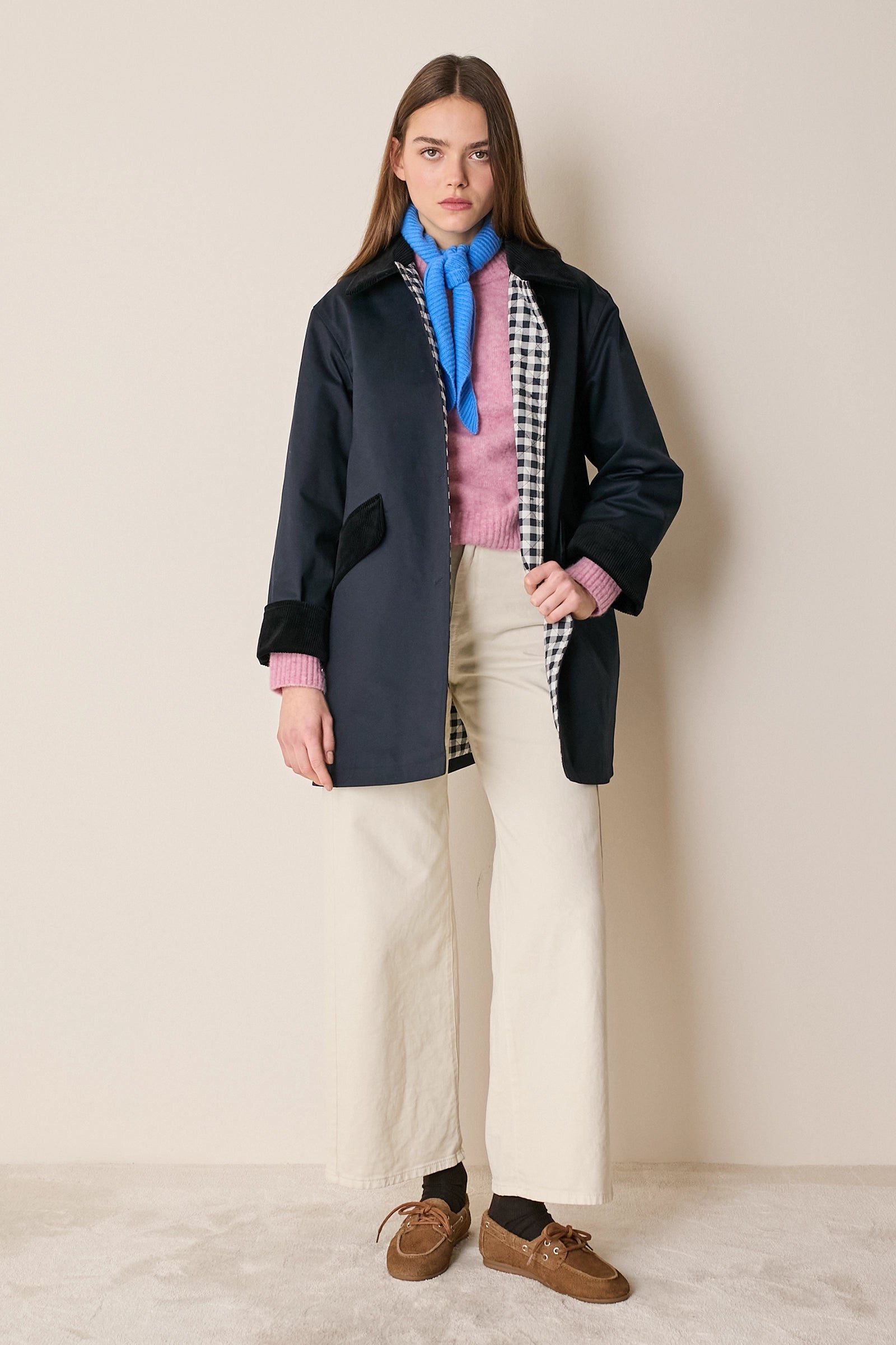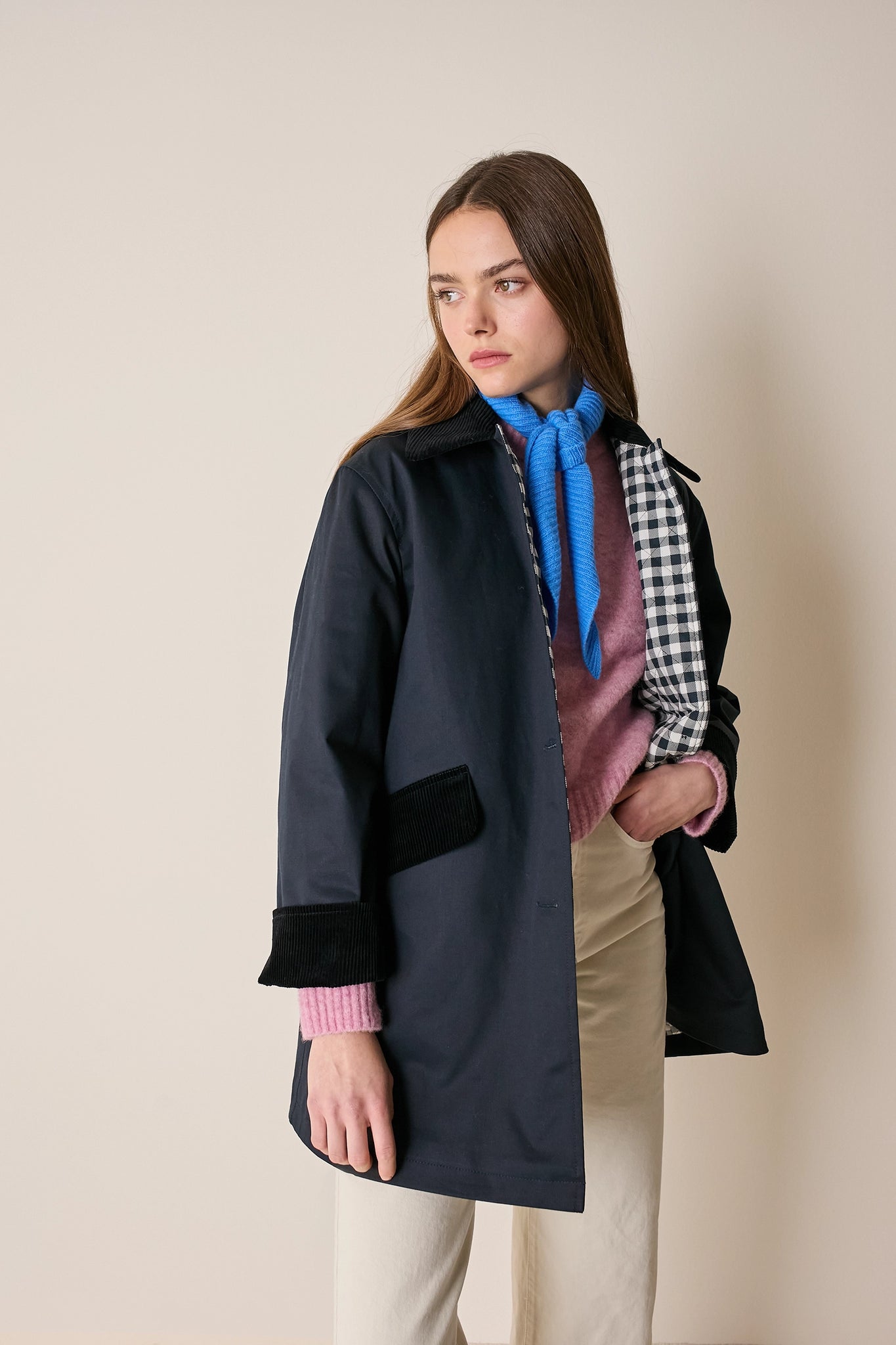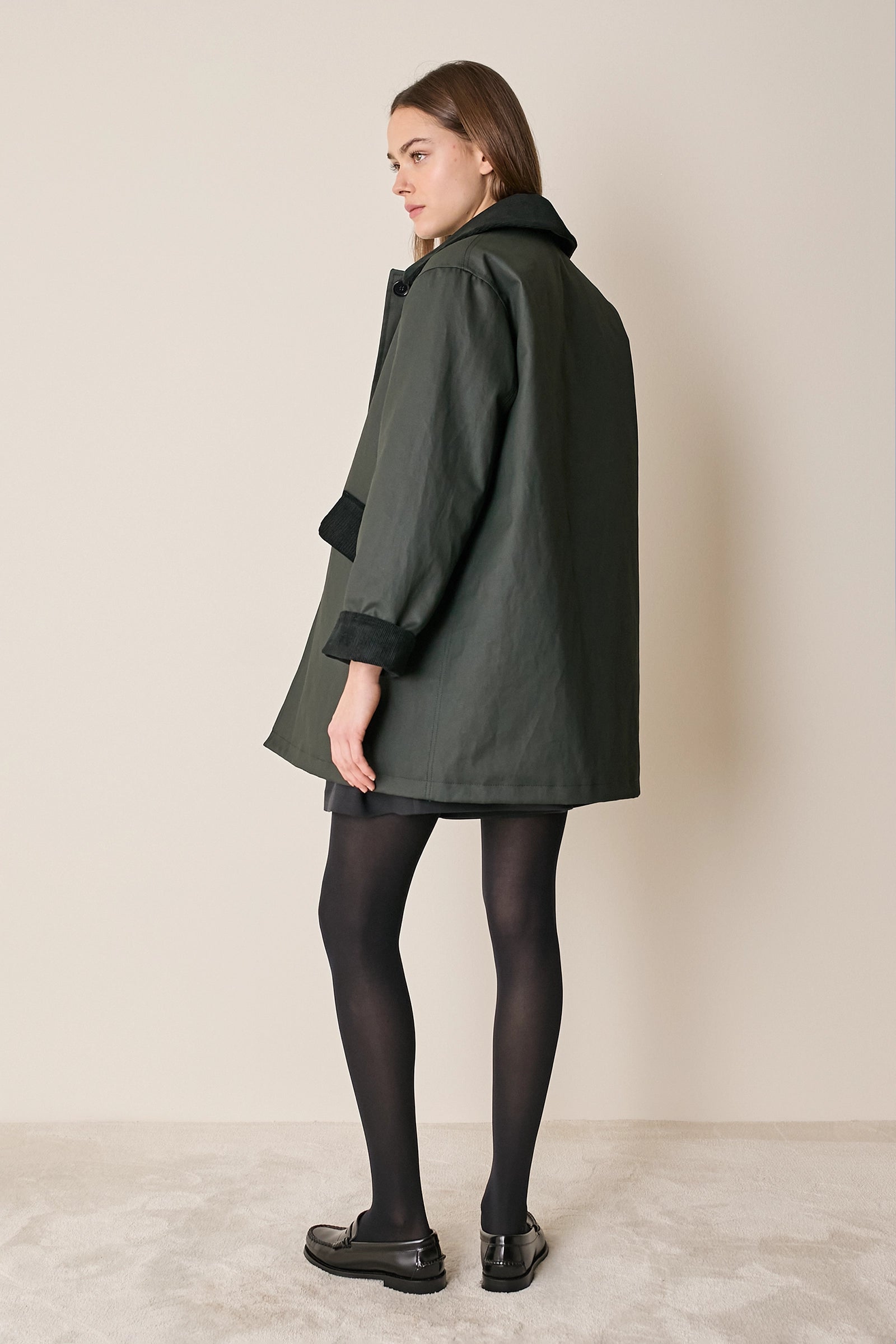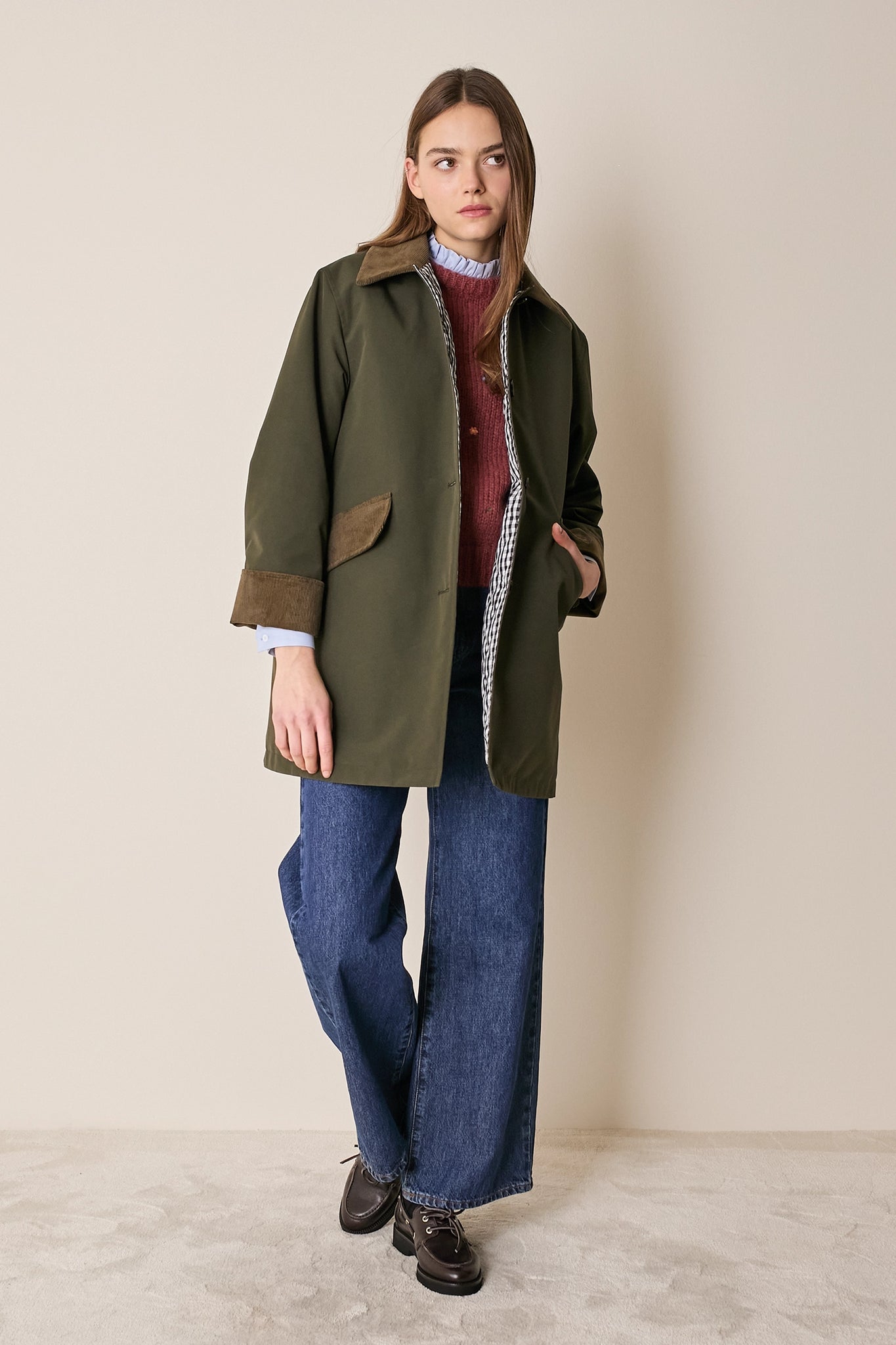 L'attenzione ai dettagli che poniamo nei nostri capi non si ferma solo agli aspetti estetici – come il colletto in velluto a contrasto o la fodera a quadretti – ma, soprattutto, nella scelta dei materiali. Per la trapuntatura di questo soprabito abbiamo optato per ovatta microvaltherm: un'ovatta speciale che, nonostante lo spessore ridotto, mantiene benissimo il calore. Per l'esterno invece abbiamo scelto un tessuto in cotone. Nella variante verdone il tessuto esterno, 100% cotone, è particolarmente sostenuto e leggermente resinato. Adatto per l'autunno – indossato con una camicia - questo soprabito sarà perfetto anche in inverno, sopra a un maglioncino in lana.