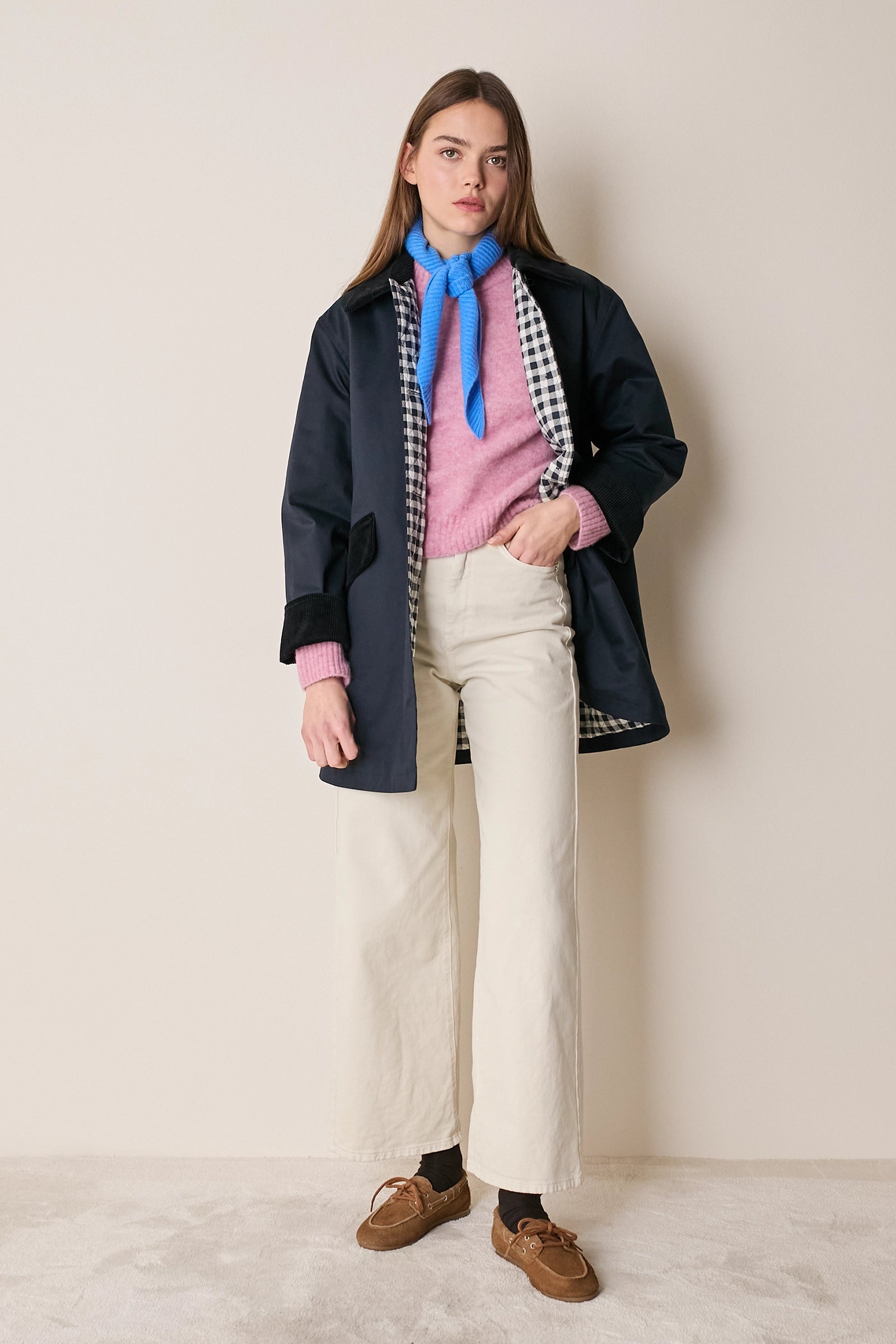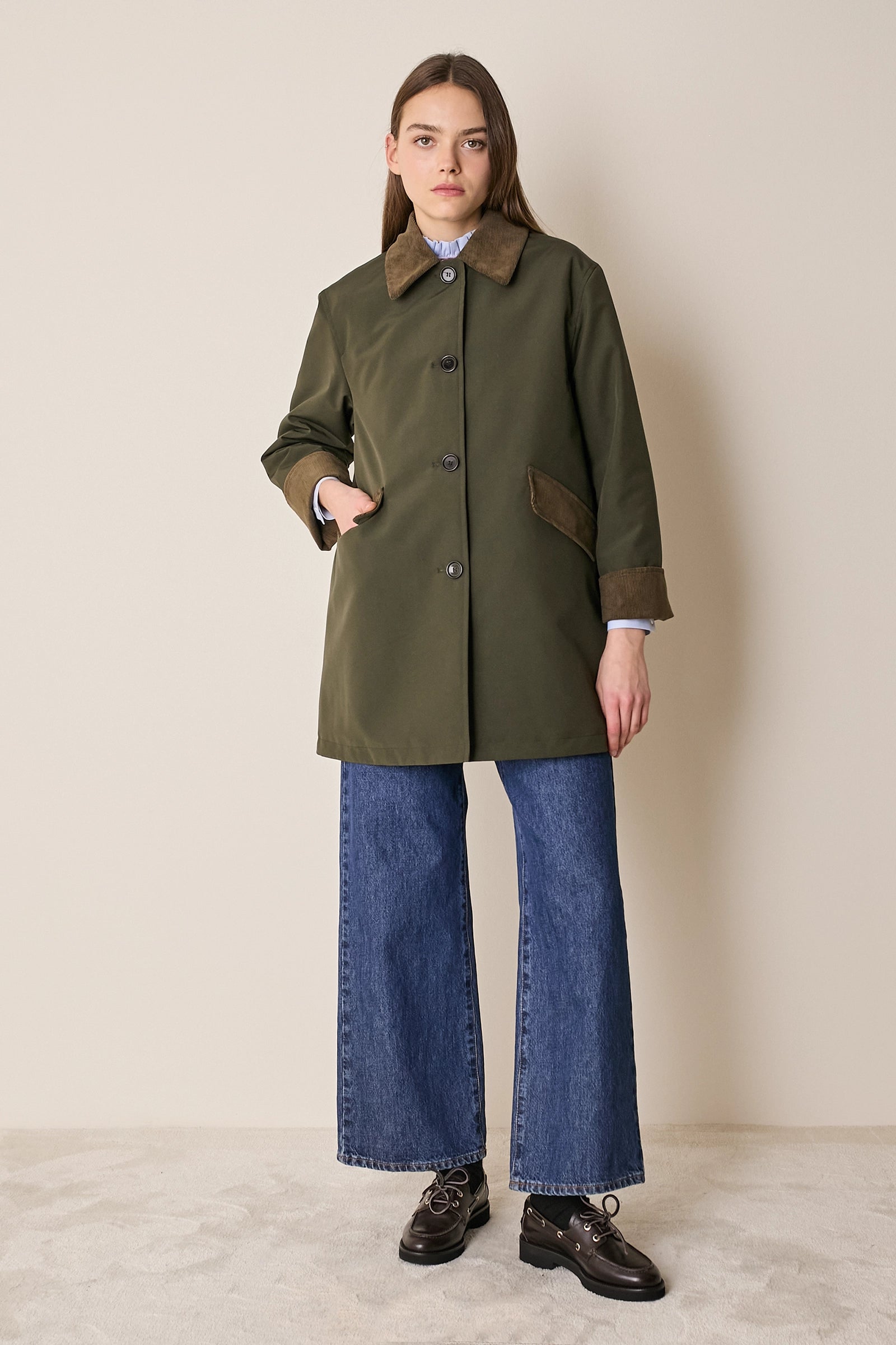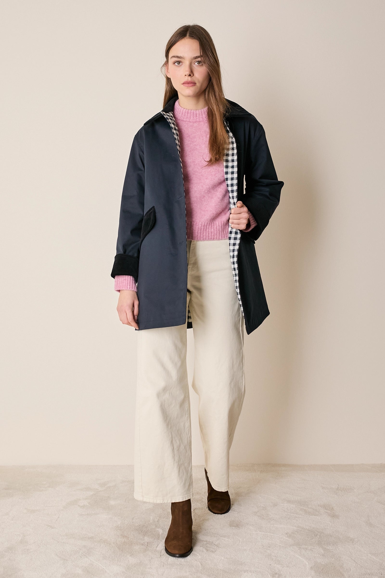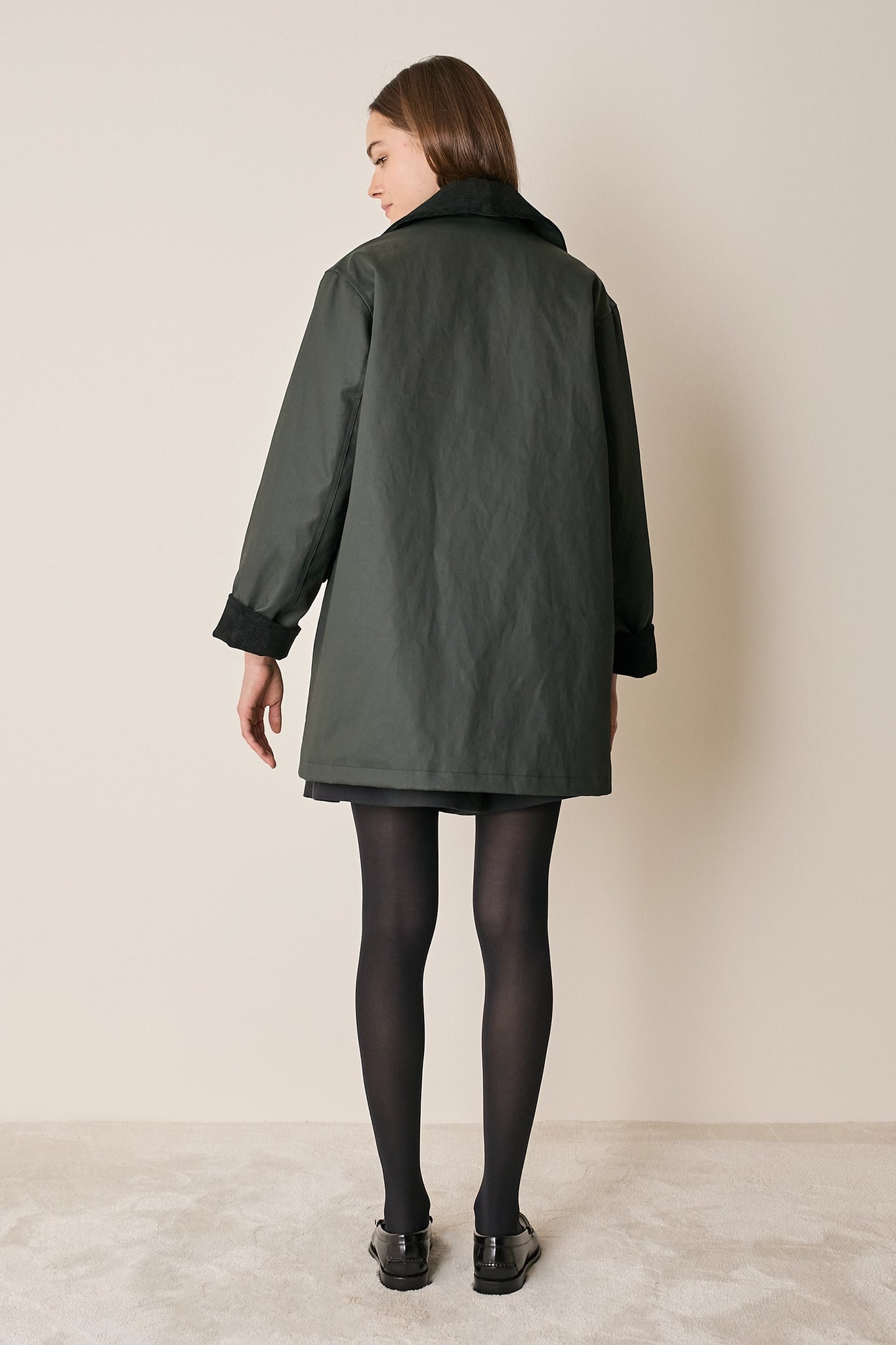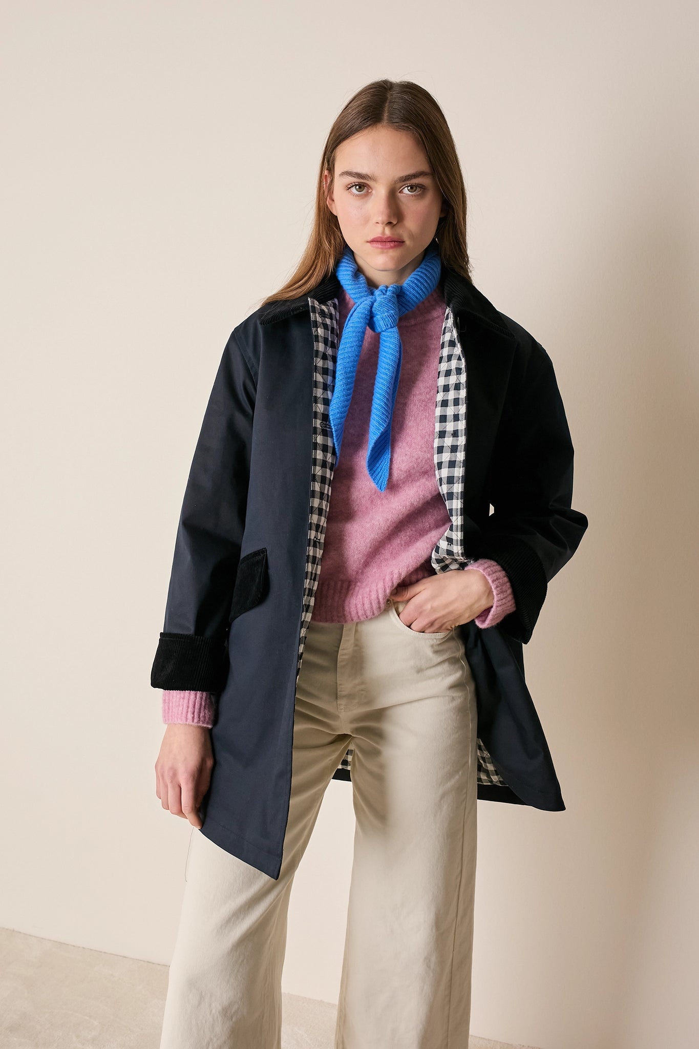 L'attenzione ai dettagli che poniamo nei nostri capi non si ferma solo agli aspetti estetici – come il colletto in velluto a contrasto o la fodera a quadretti – ma, soprattutto, nella scelta dei materiali. Per la trapuntatura di questo soprabito abbiamo optato per ovatta microvaltherm: un'ovatta speciale che, nonostante lo spessore ridotto, mantiene benissimo il calore. Per l'esterno invece abbiamo scelto un tessuto in cotone. Nella variante verdone il tessuto esterno, 100% cotone, è particolarmente sostenuto e leggermente resinato. Adatto per l'autunno – indossato con una camicia - questo soprabito sarà perfetto anche in inverno, sopra a un maglioncino in lana.