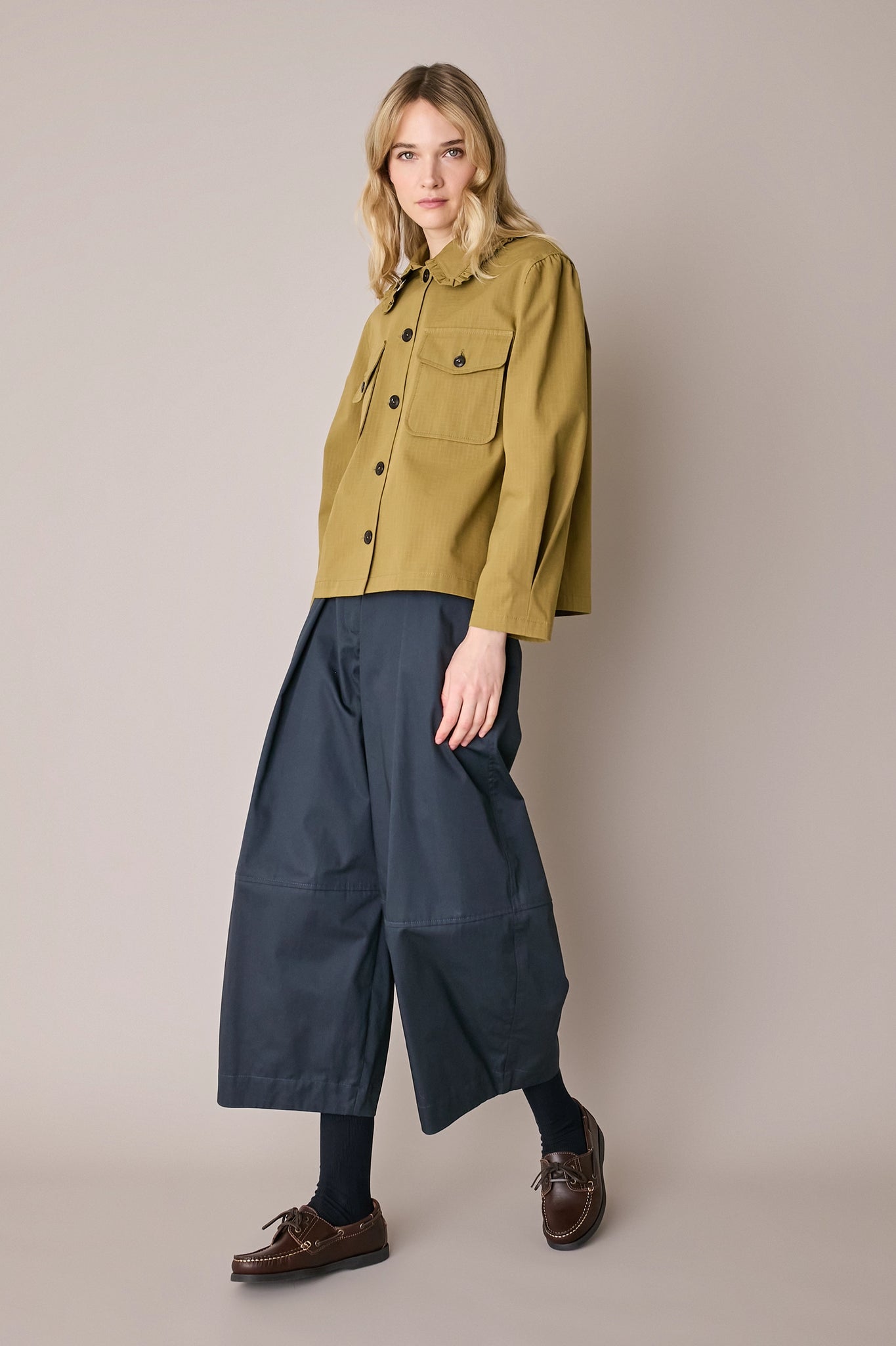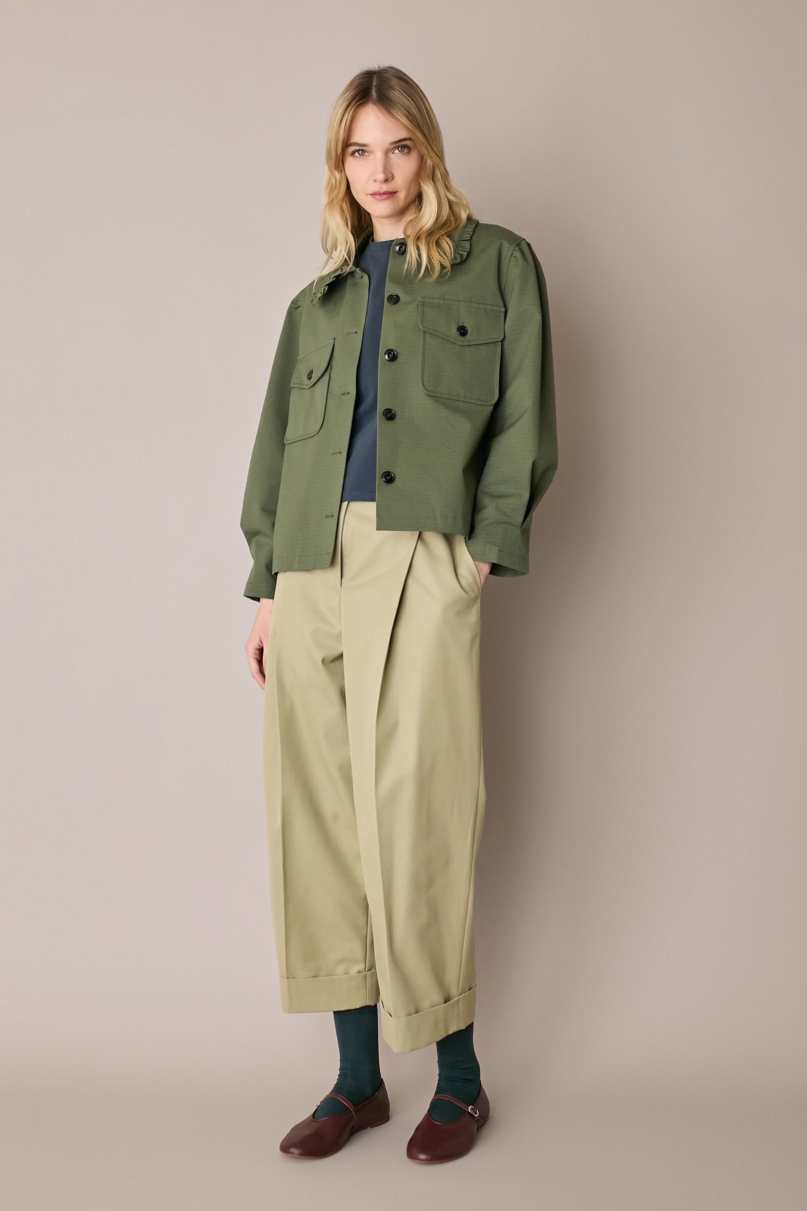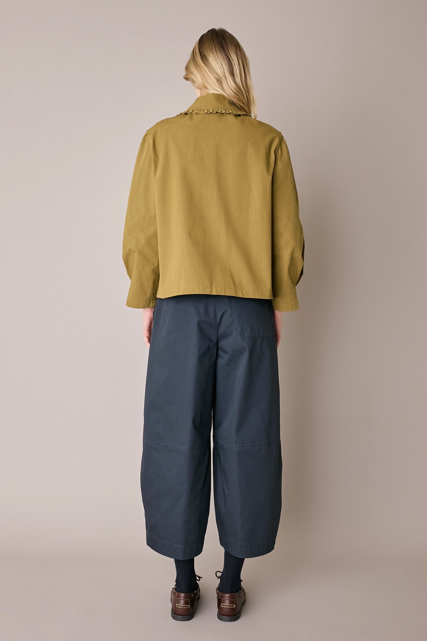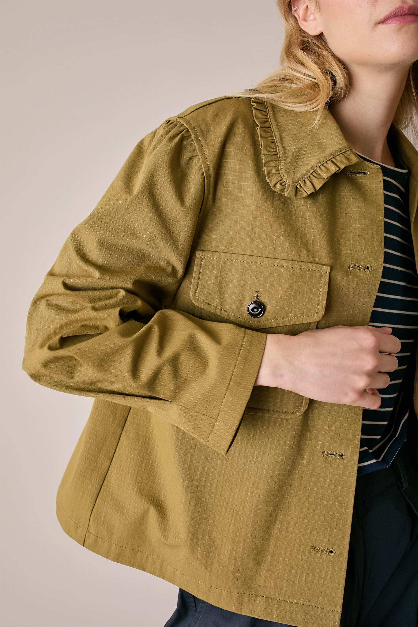 Questa giacca è definita dal contrasto tra il tessuto ripstop di ispirazione tecnica e i dettagli romantici dati dal colletto volant e dalle maniche scultoree a palloncino. Sportiva, ma alla nostra maniera. Disponibile in verde o fango.