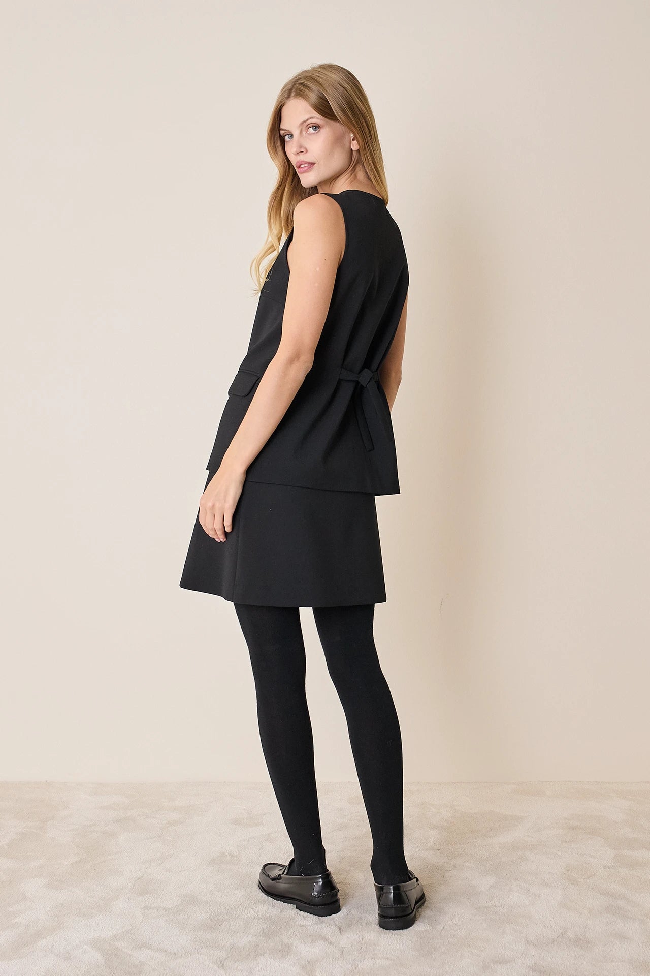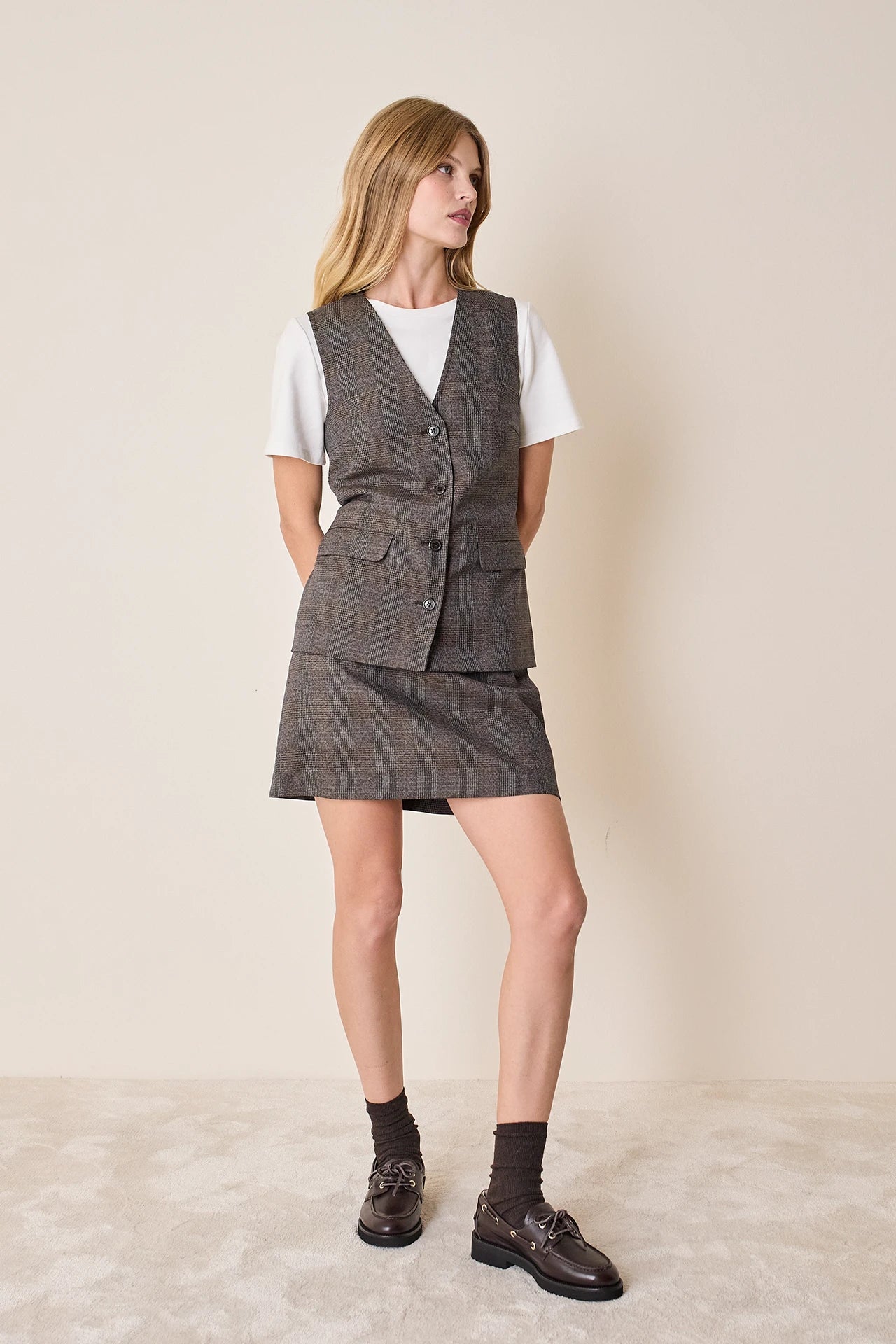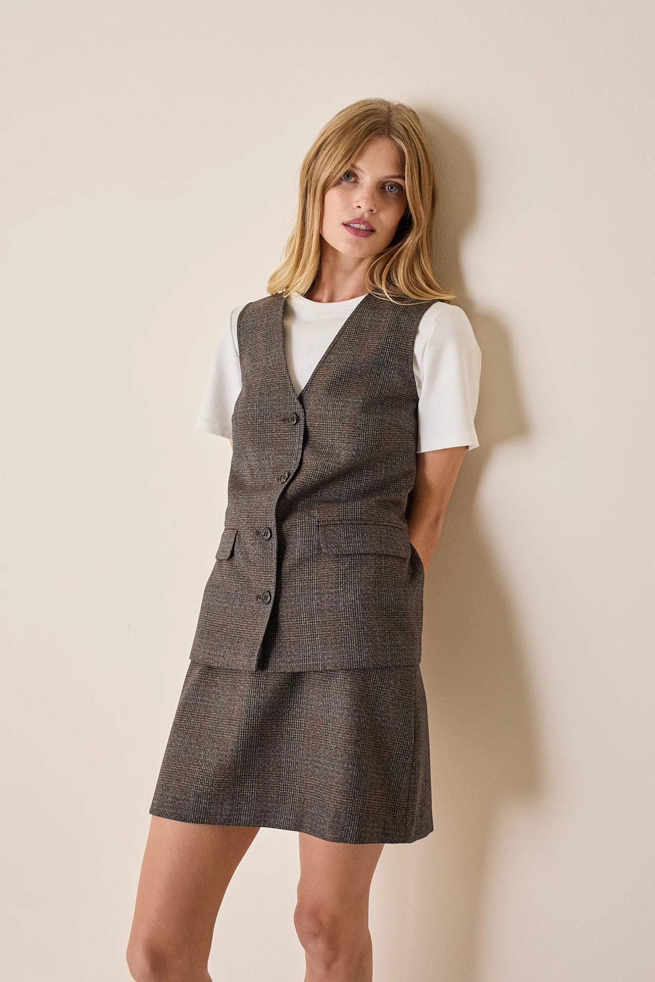 Un solo gilet, tanti look diversi. Questo gilet in lana può essere indossato a pelle ma anche sopra una t-shirt o un maglioncino extrafine. Perfetto con la gonna realizzata nello stesso tessuto ma anche con un paio di jeans per un look casual. Disponibile in nero o nel motivo principe di Galles marrone.