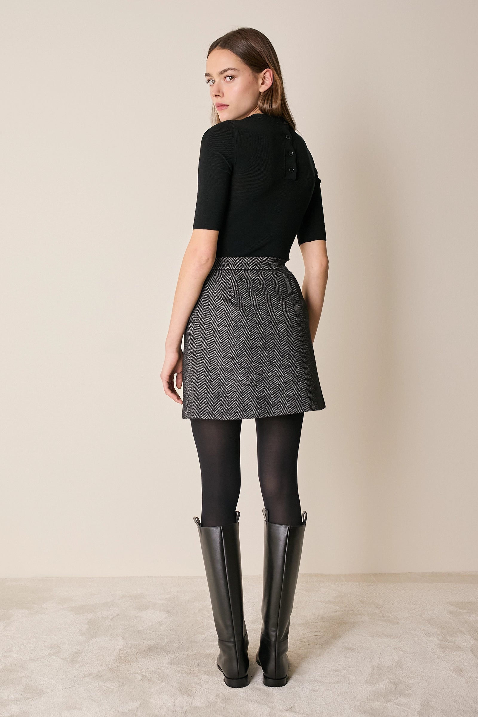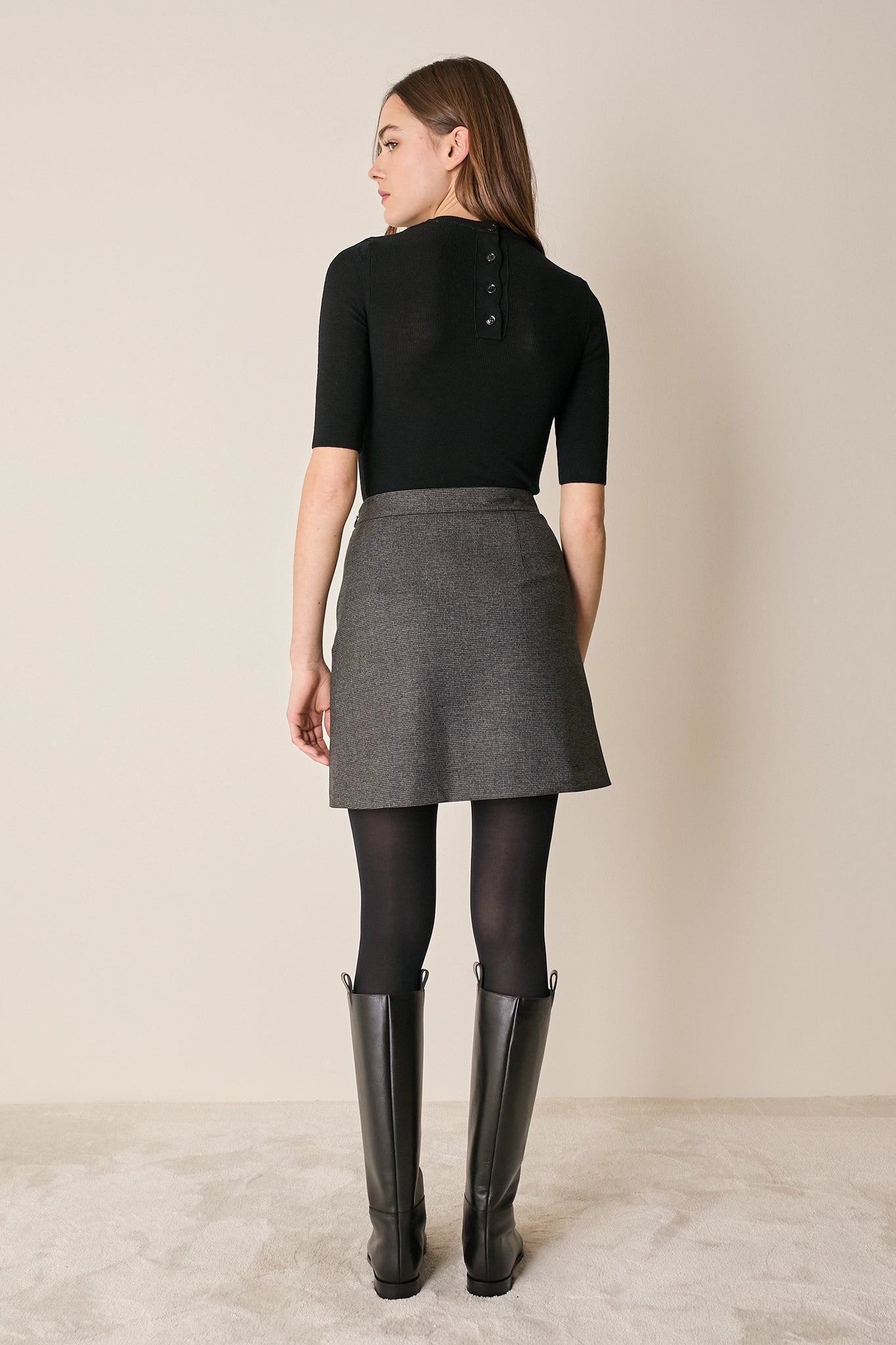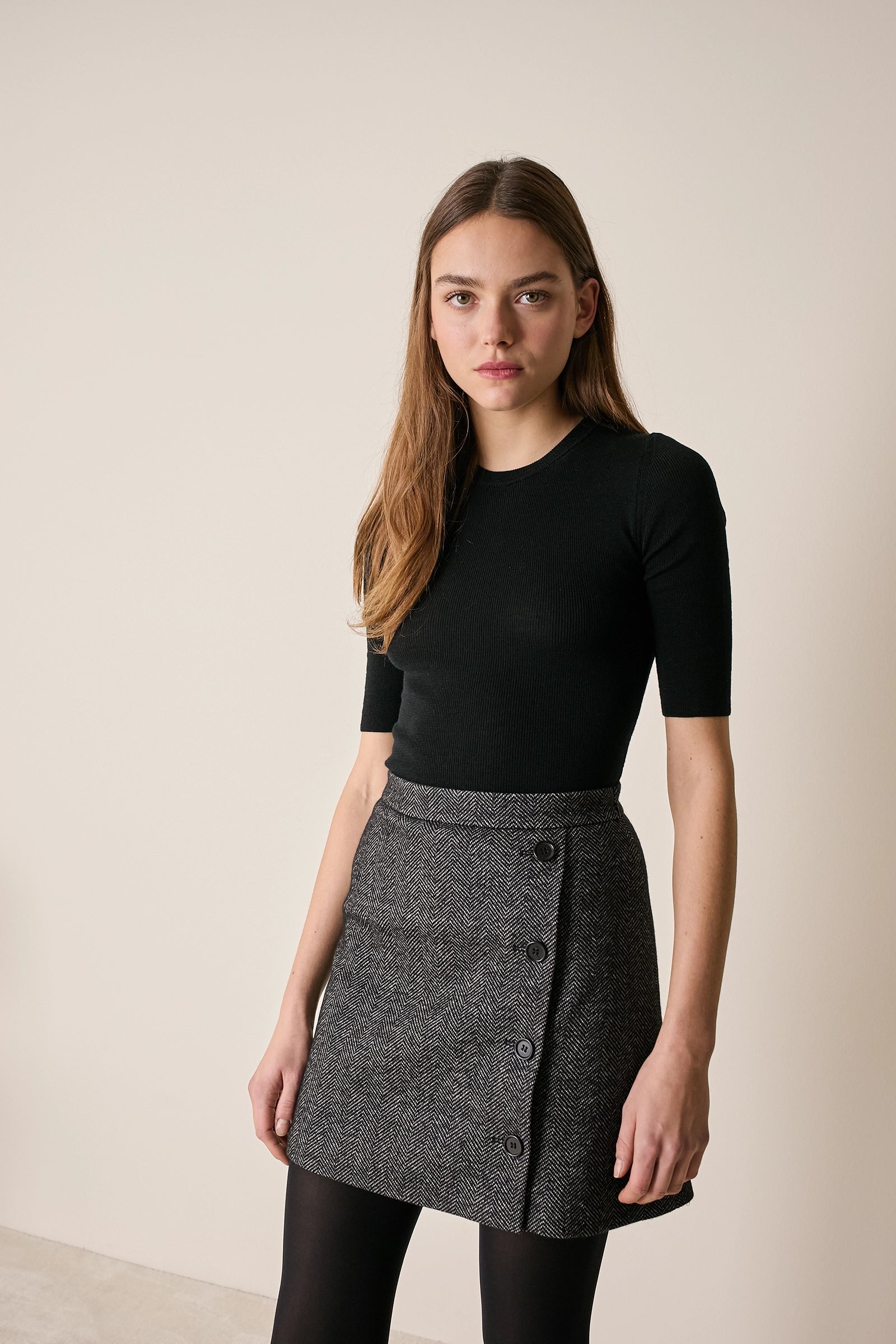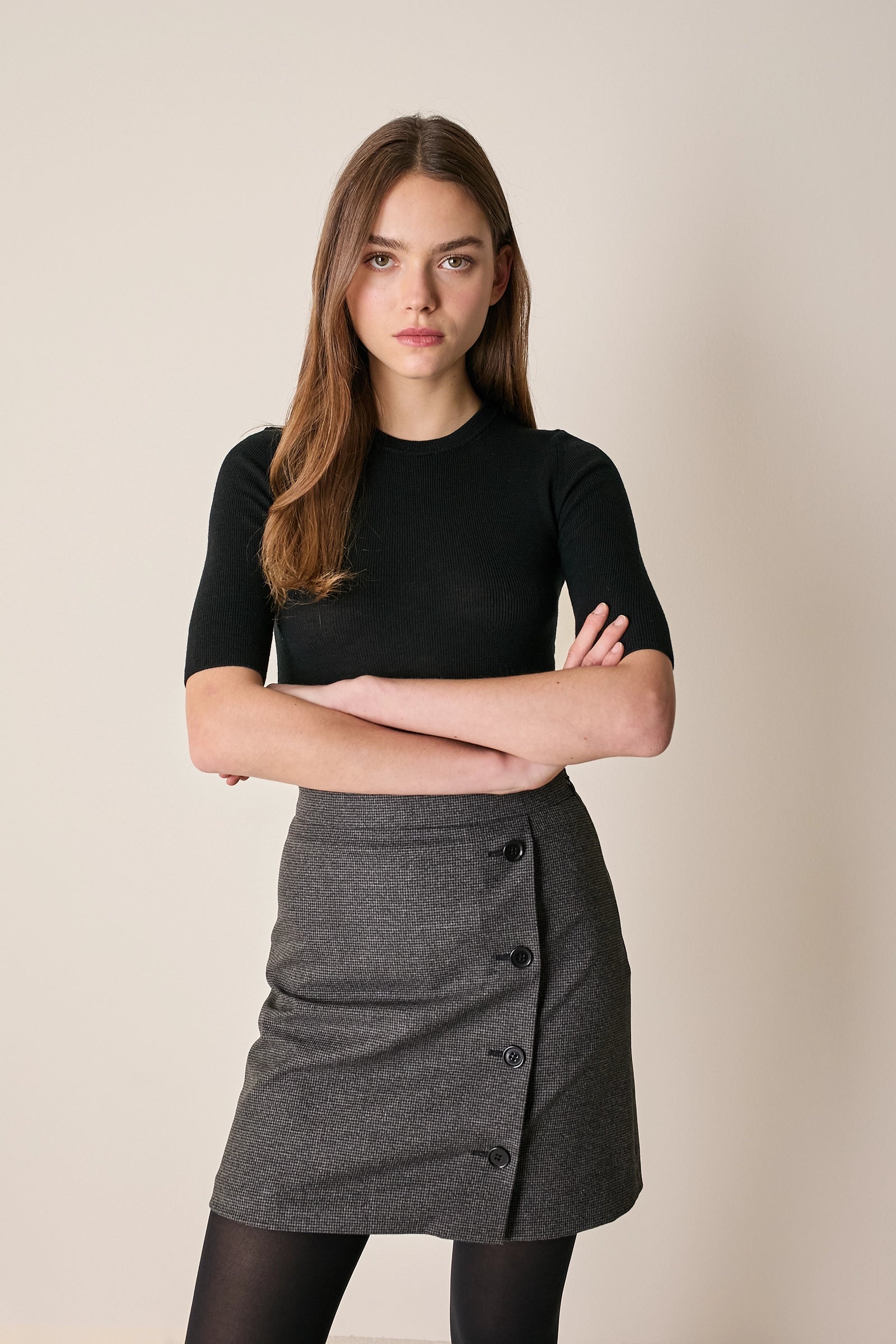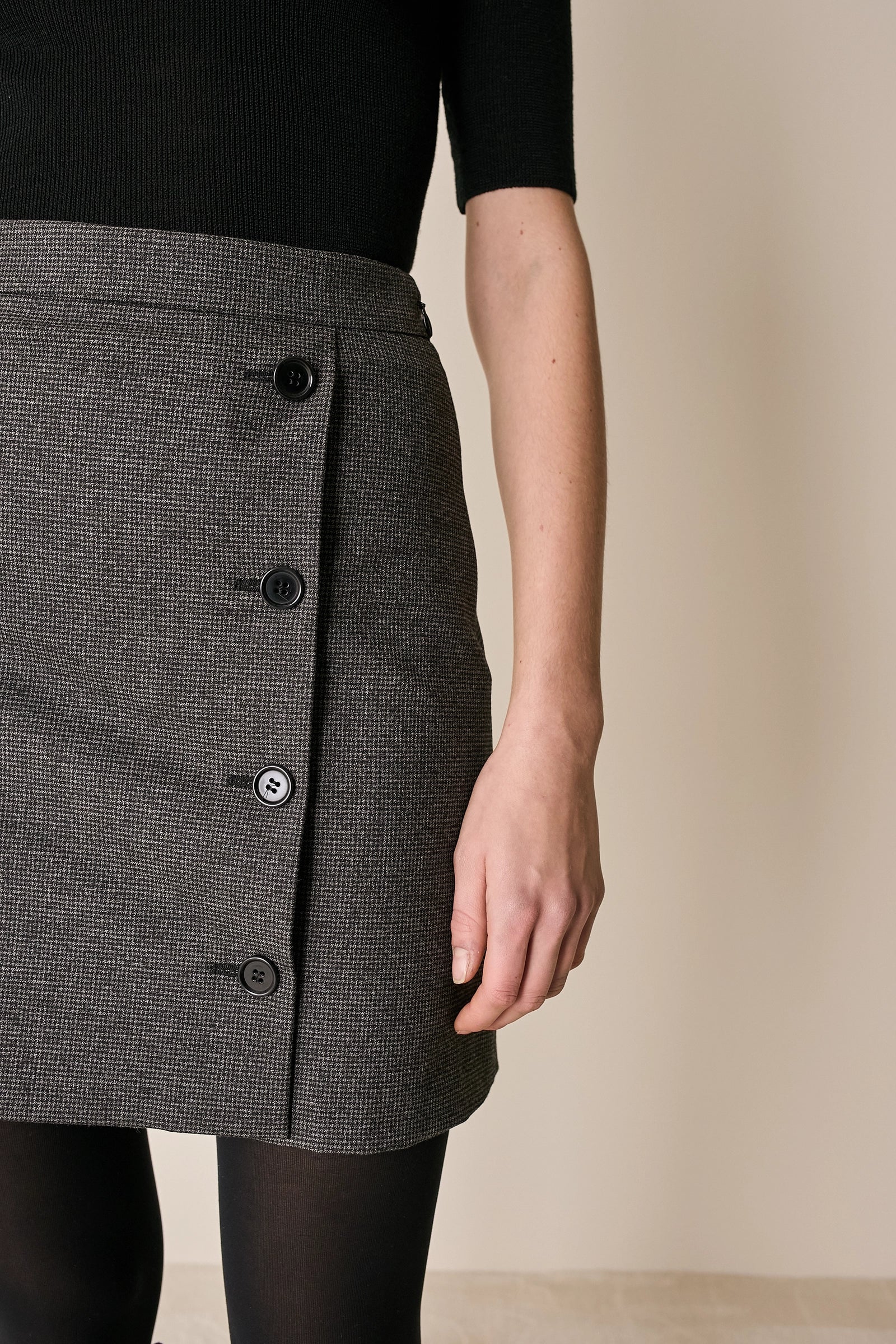Questa minigonna è caratterizzata da una finta abbottonatura laterale.