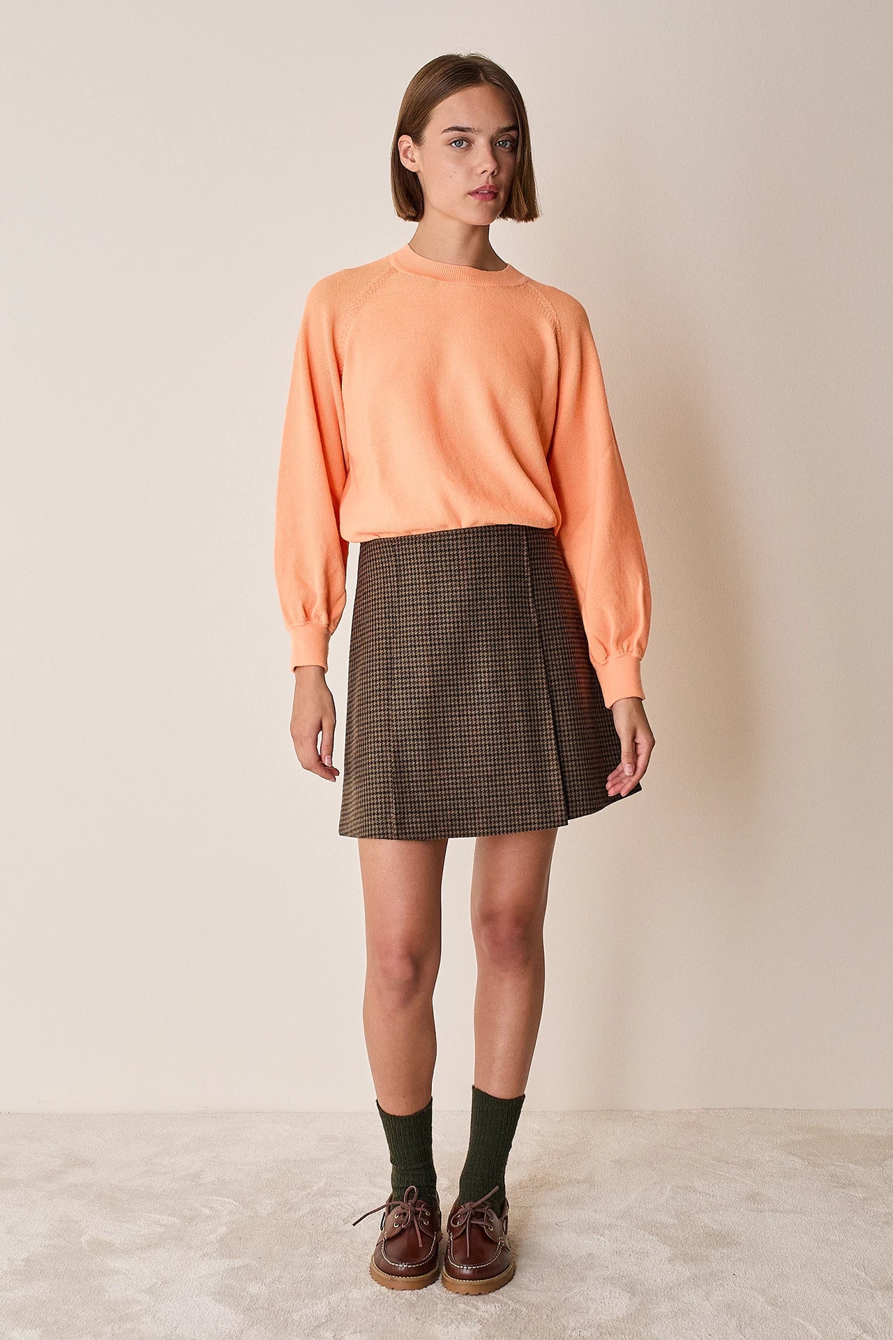 Questa gonna è caratterizzata dal dettaglio delle pieghe a cannoncino che, creando volume, delineano la silhouette a trapezio. Disponibile in blu, grigio, marrone o pied-de-poule.