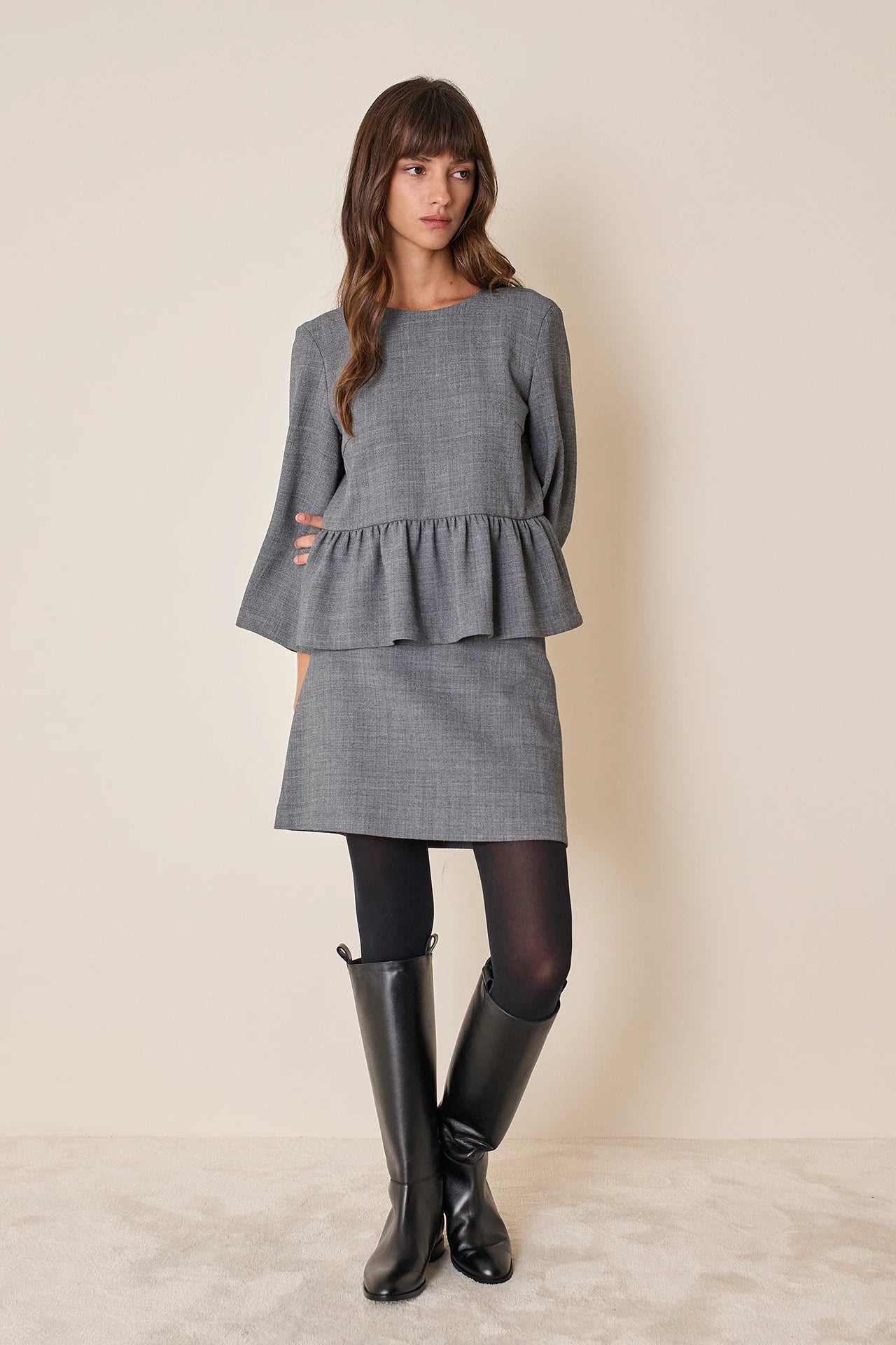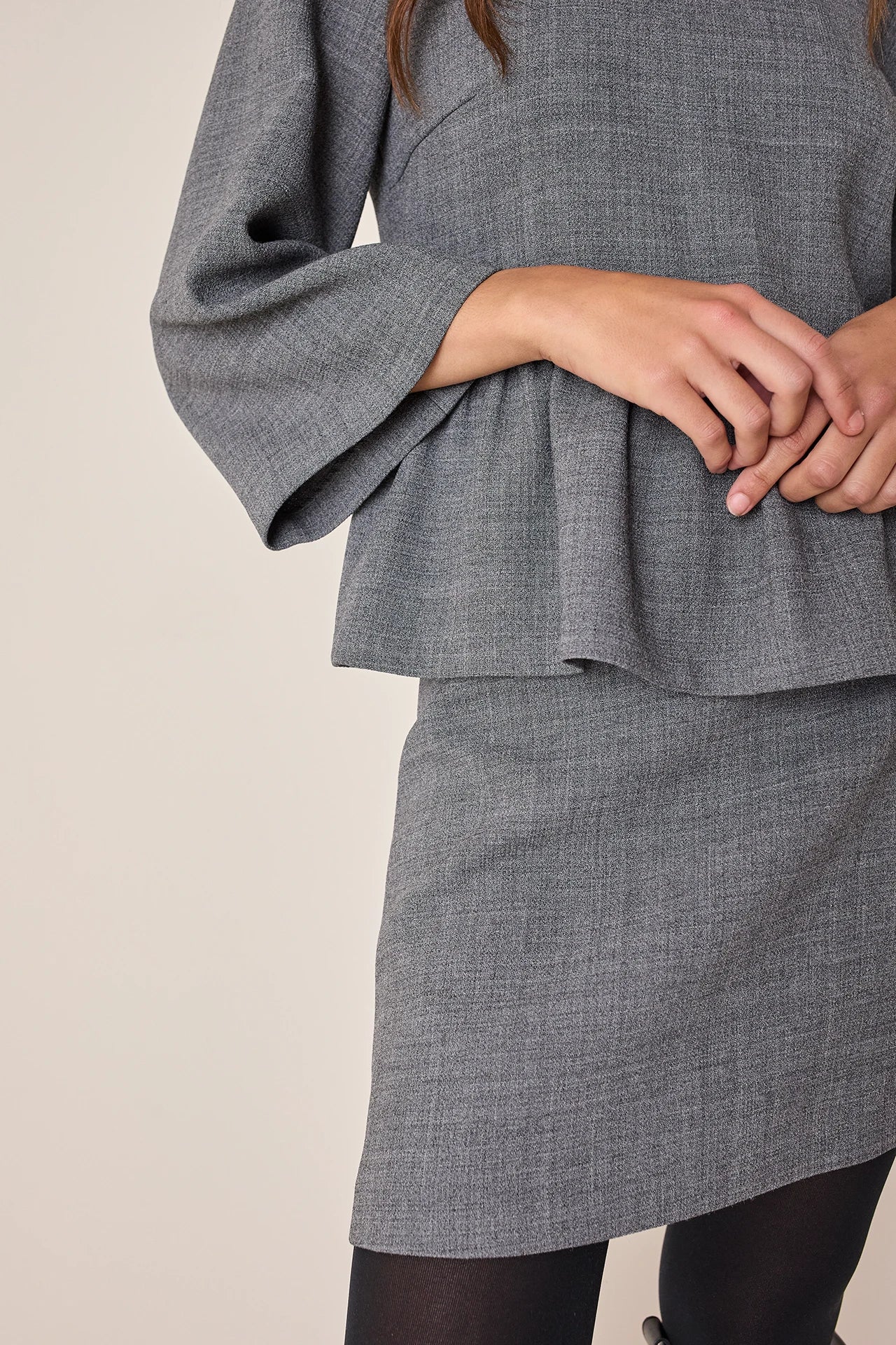 Questa minigonna in blend di lana può essere abbinata al top con balza realizzato nello stesso tessuto, o essere indossata con una camicia o un maglioncino over. Disponibile in grigio.